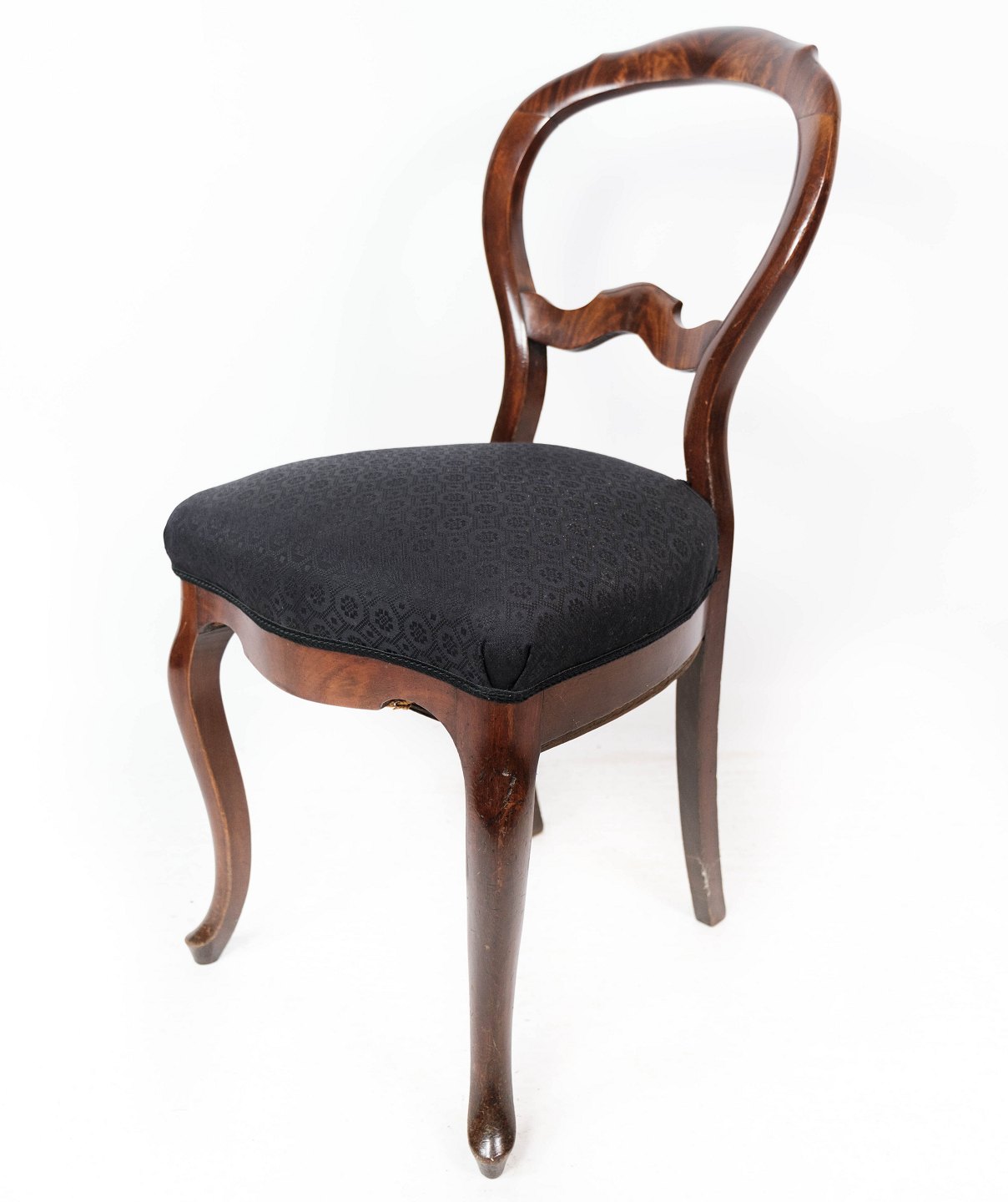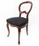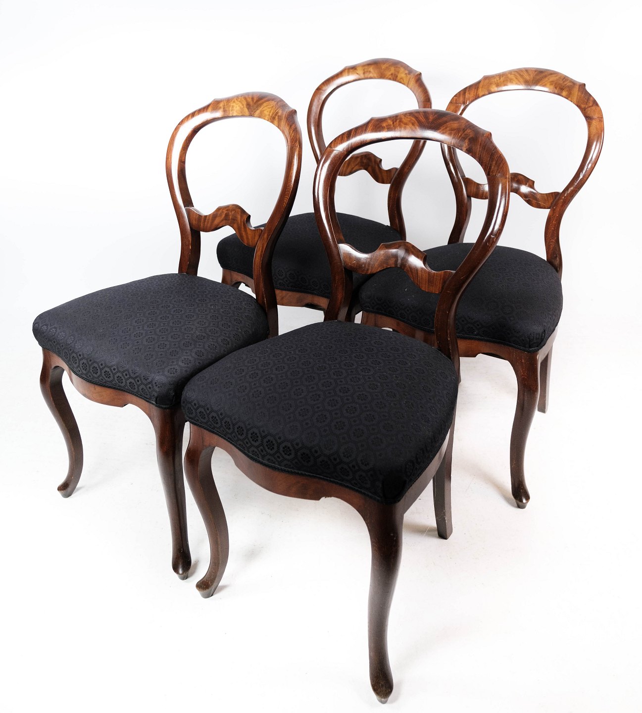 SolgtSæt af fire rokoko spisestuestole af mørkt træ og polstret med sort stof fra omkring 1880. Stolene er i flot antik stand.