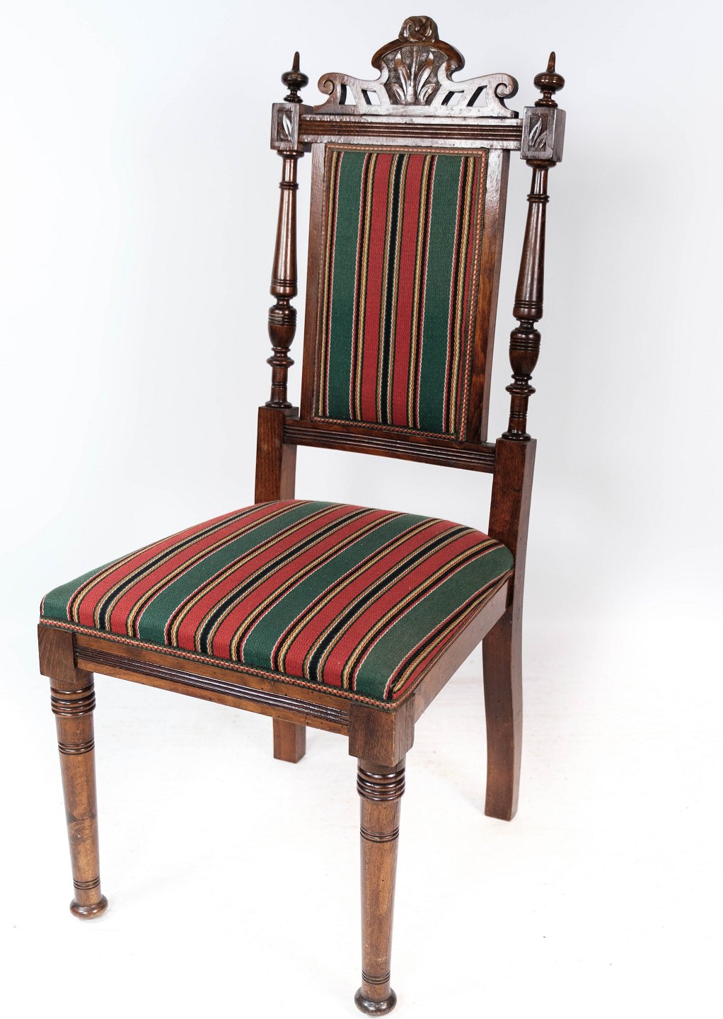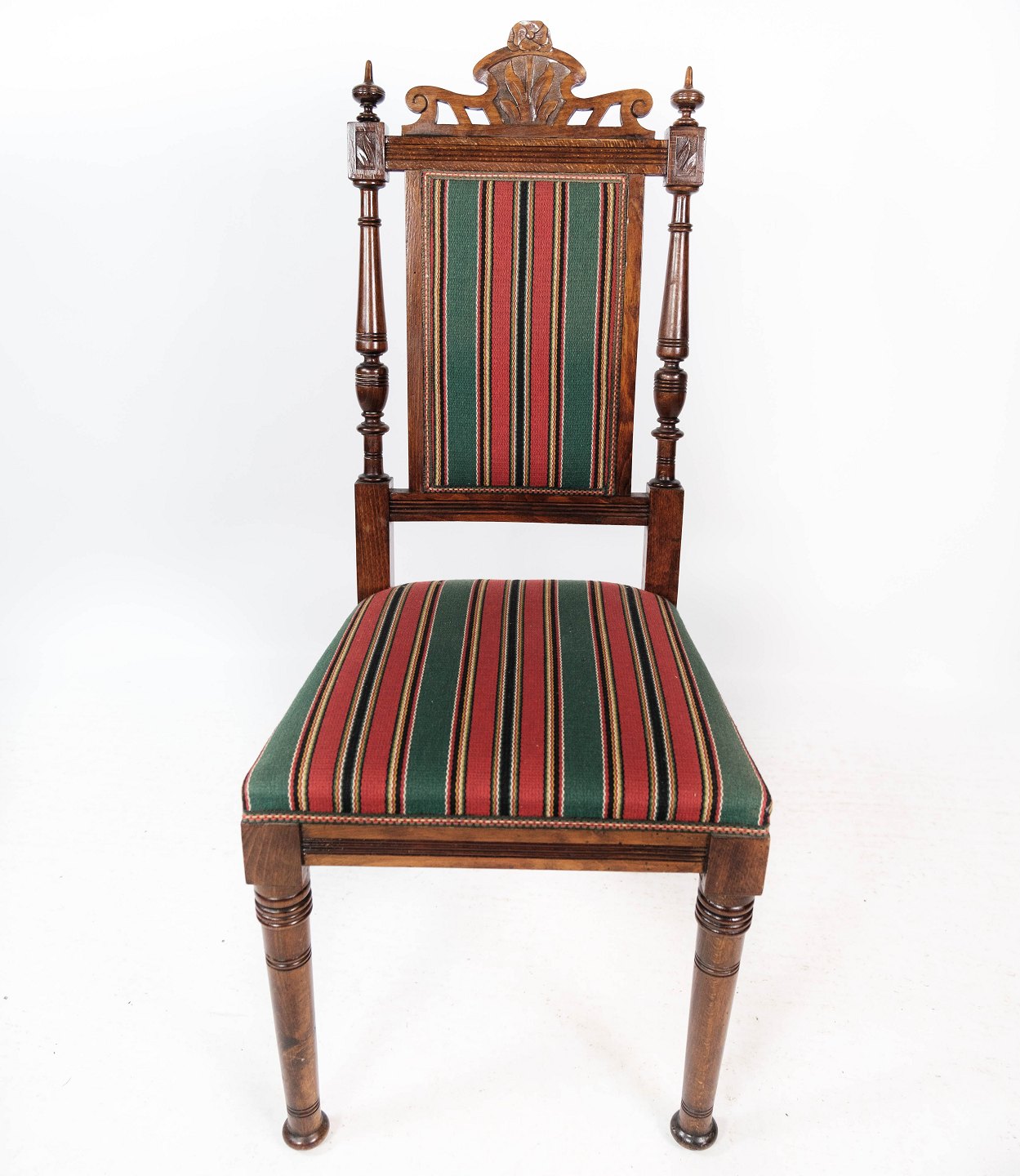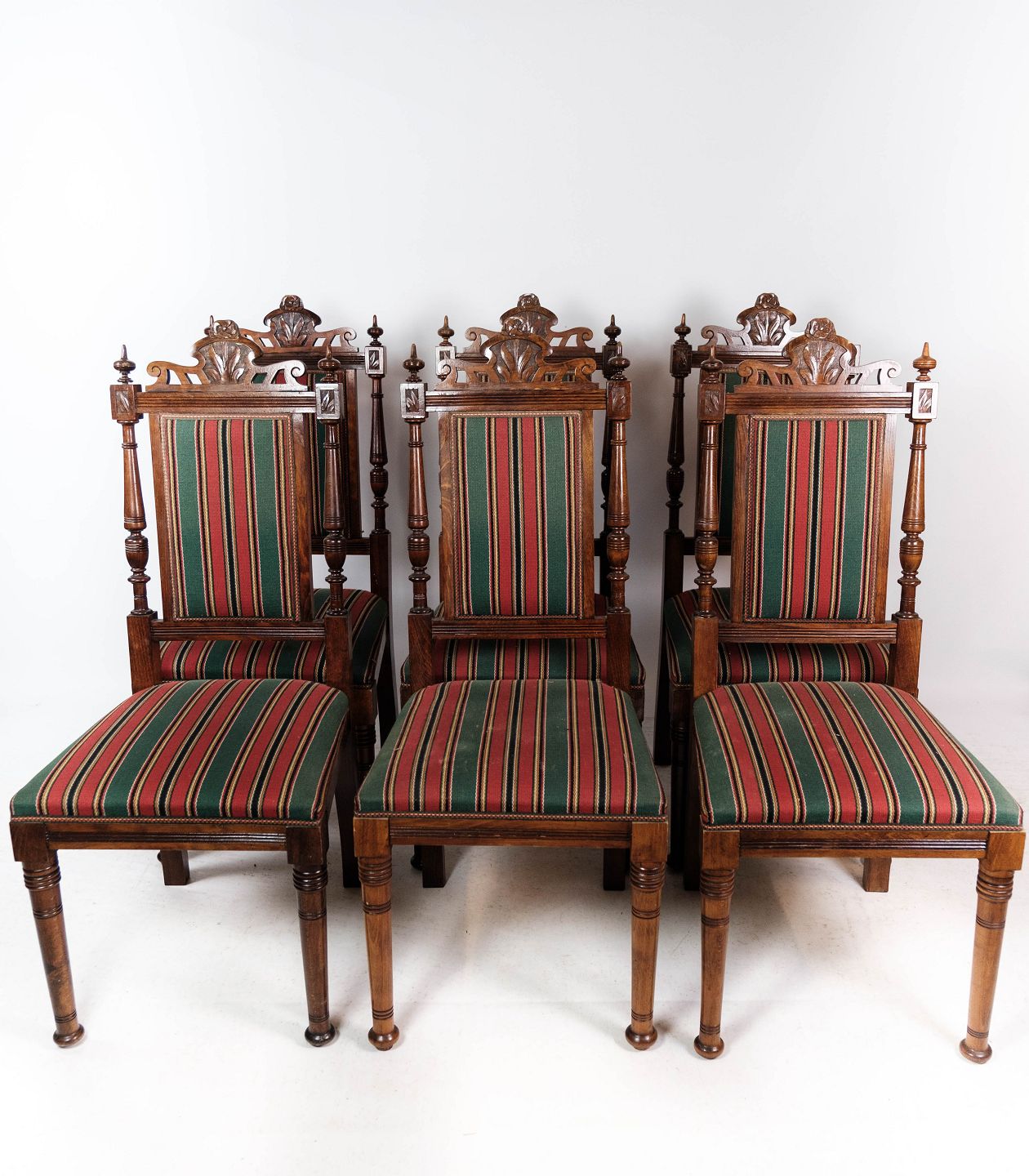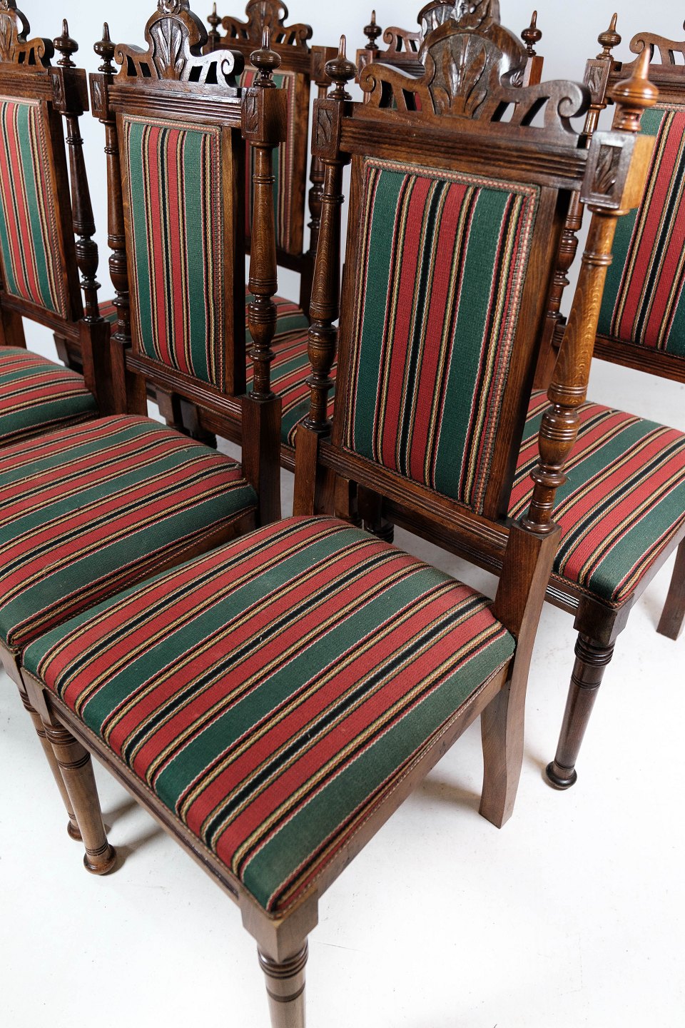 Set of six dining room chairs of oak and upholstered with striped fabric, from around 1920. The chairs are in great vintage condition.