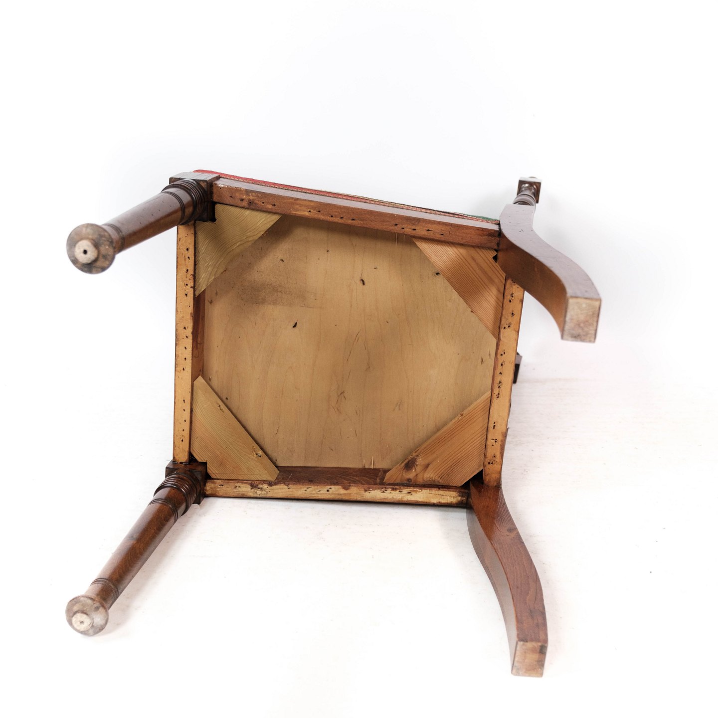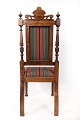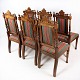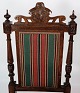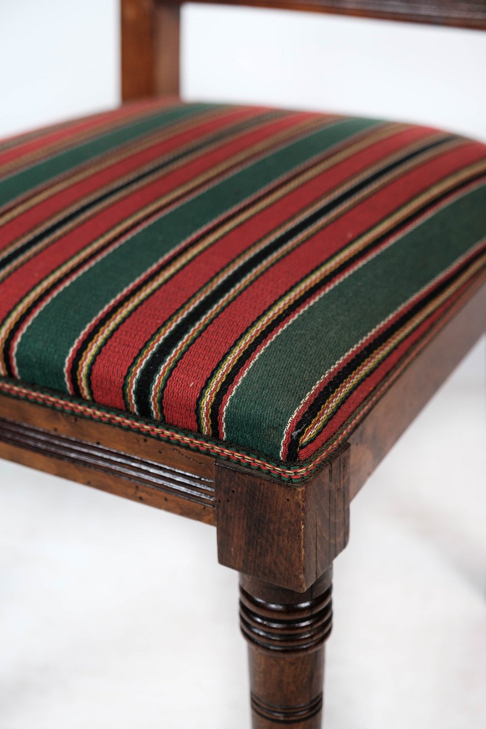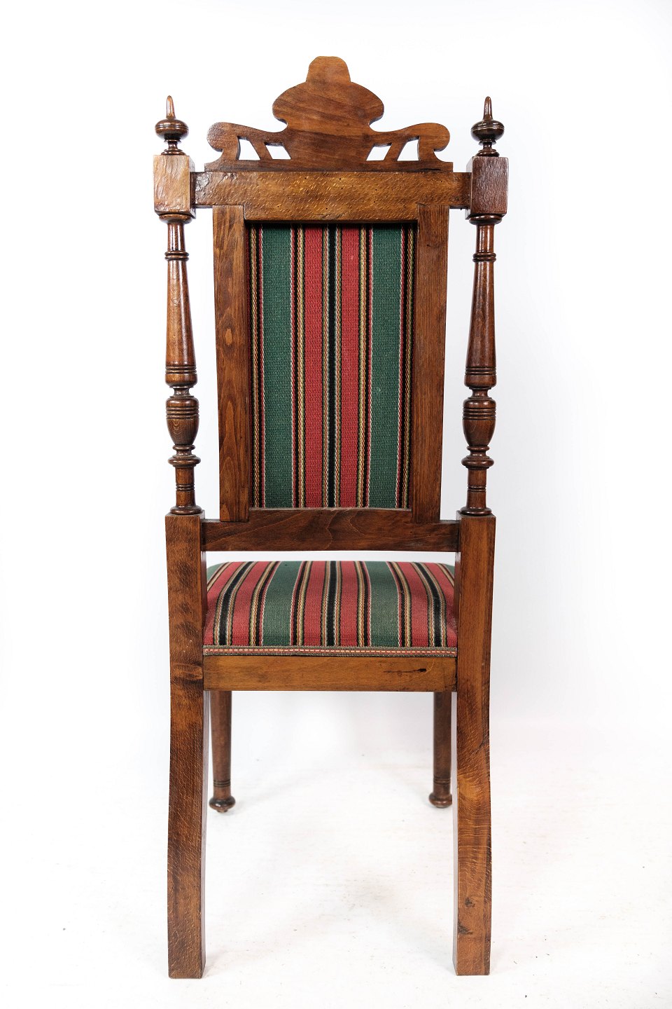 Set of six dining room chairs of oak and upholstered with striped fabric, from around 1920. The chairs are in great vintage condition.