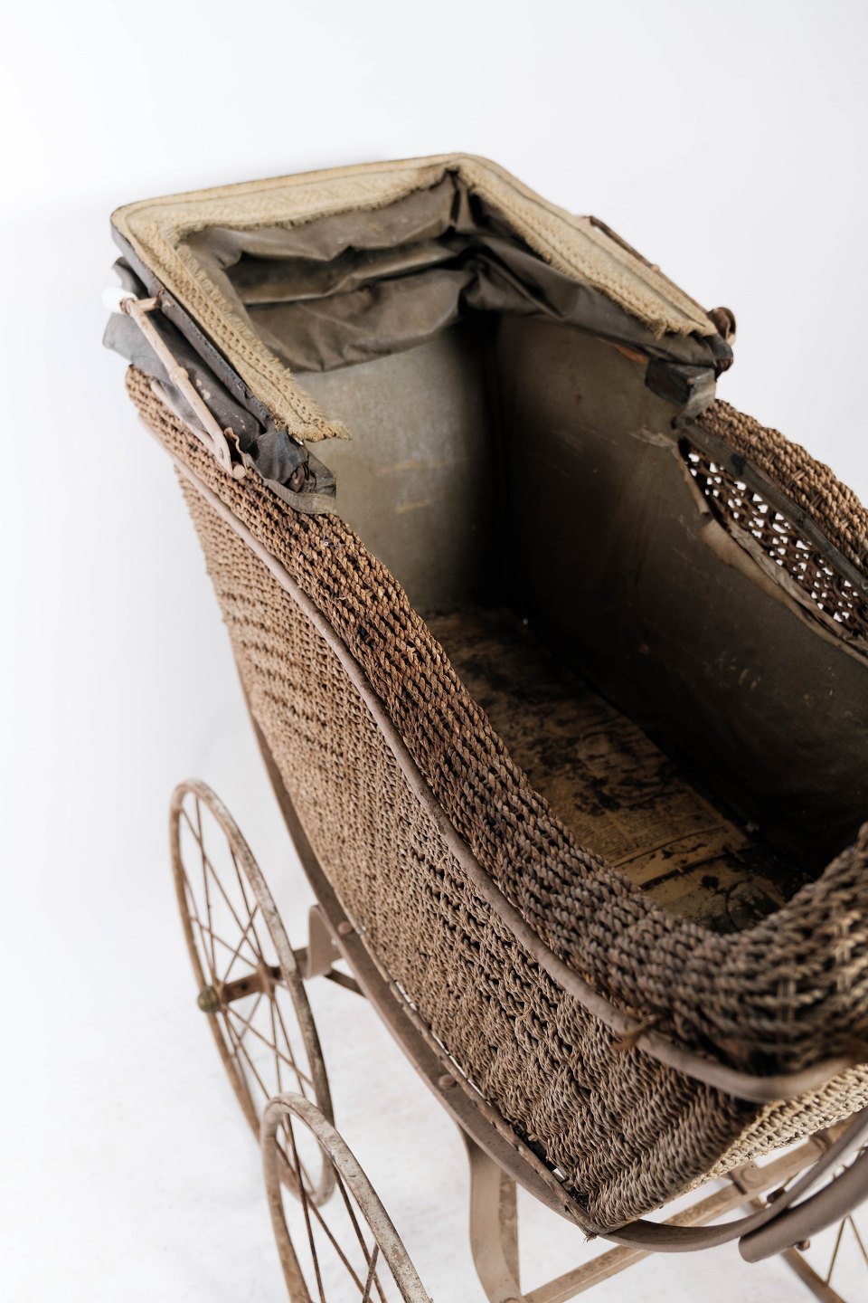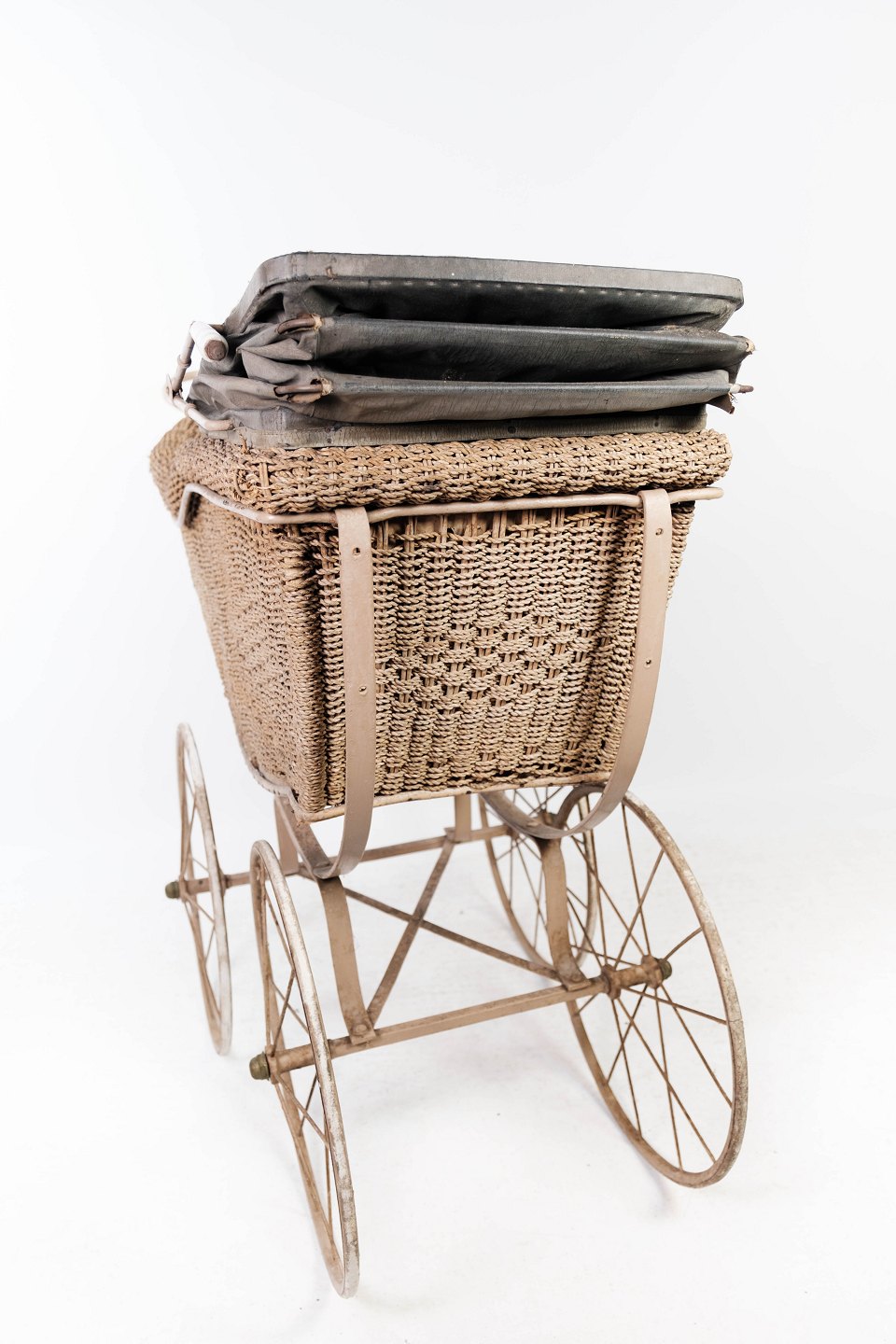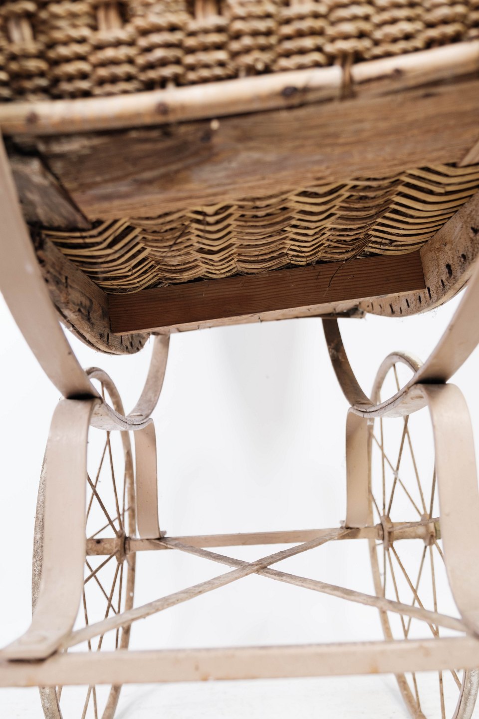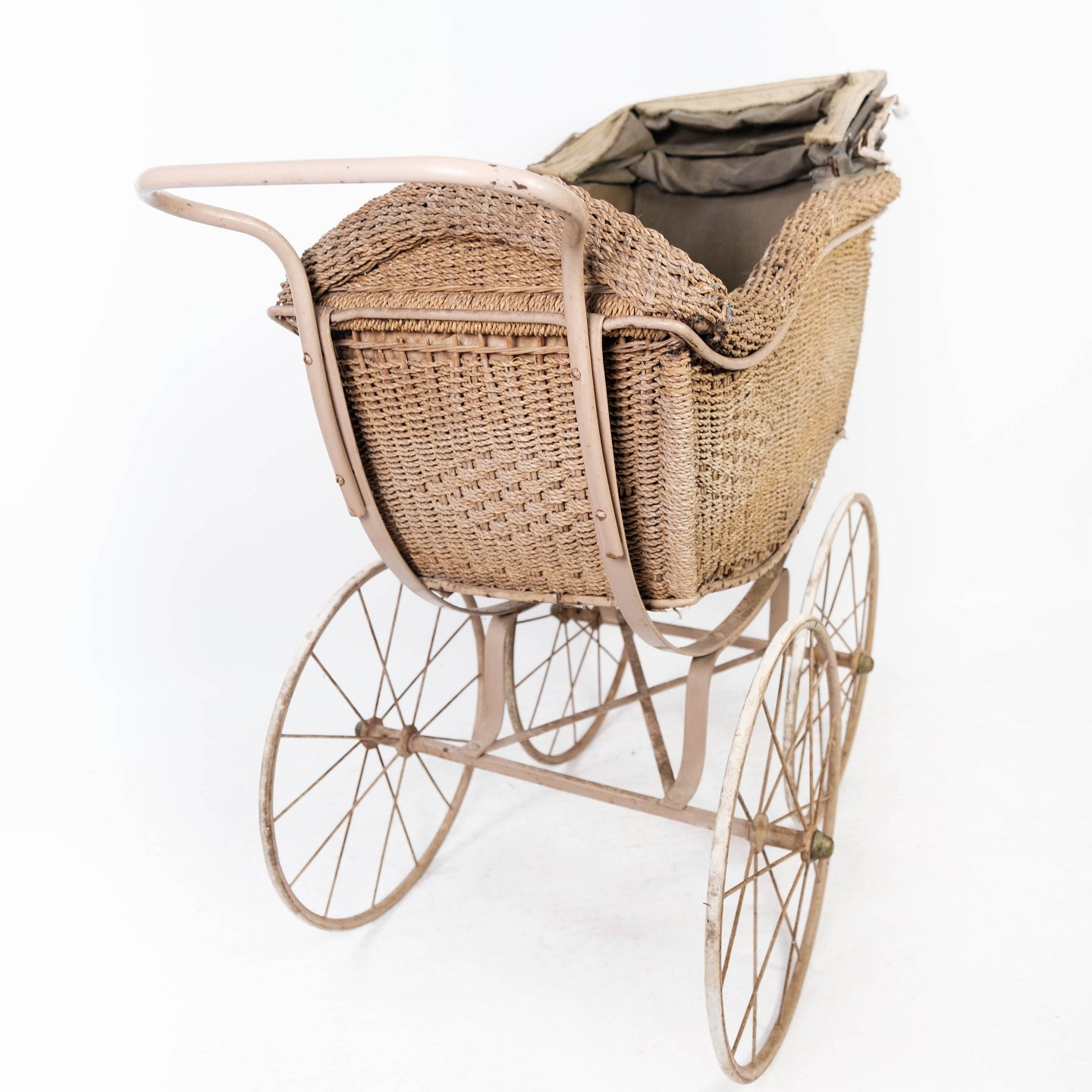 Antique child carriage of paper cord and metal wheels, from around the 1930s.