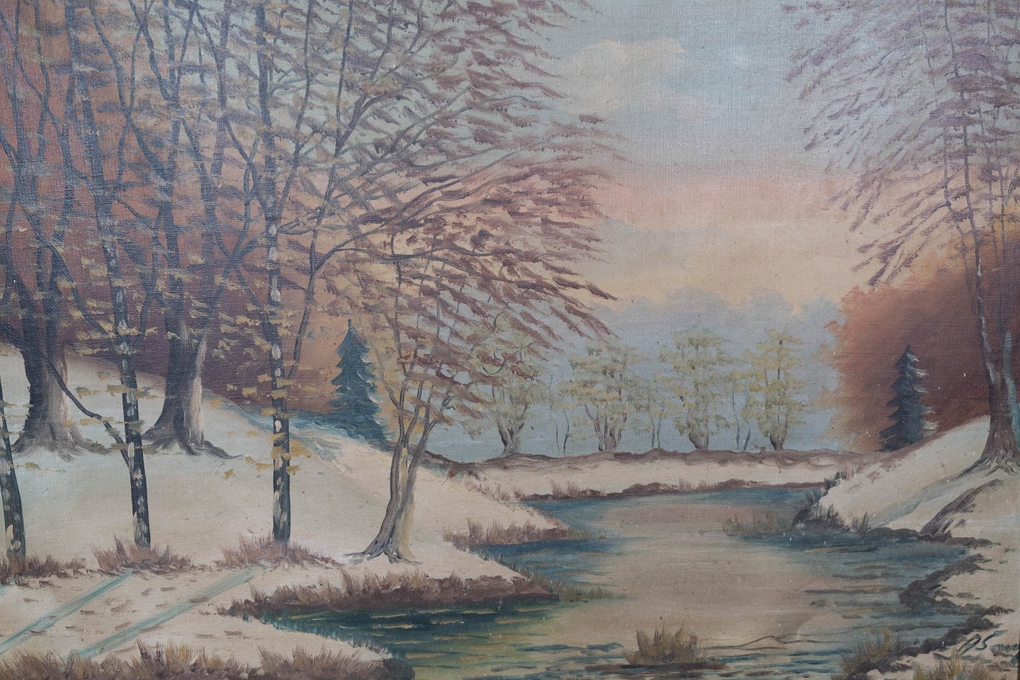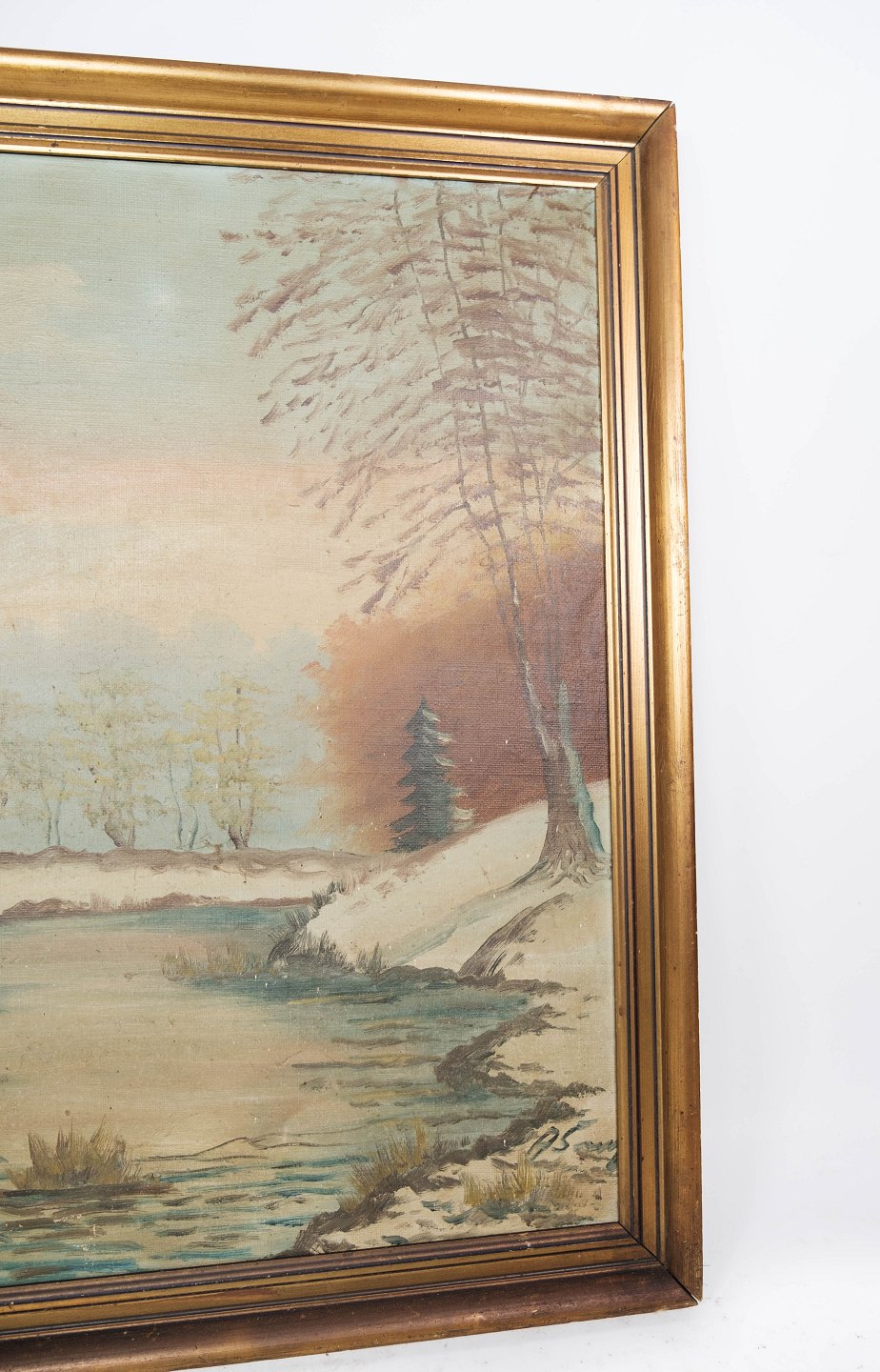 Maleri på lærred med vinter motiv og forgyldt ramme, med ukendt signatur.
