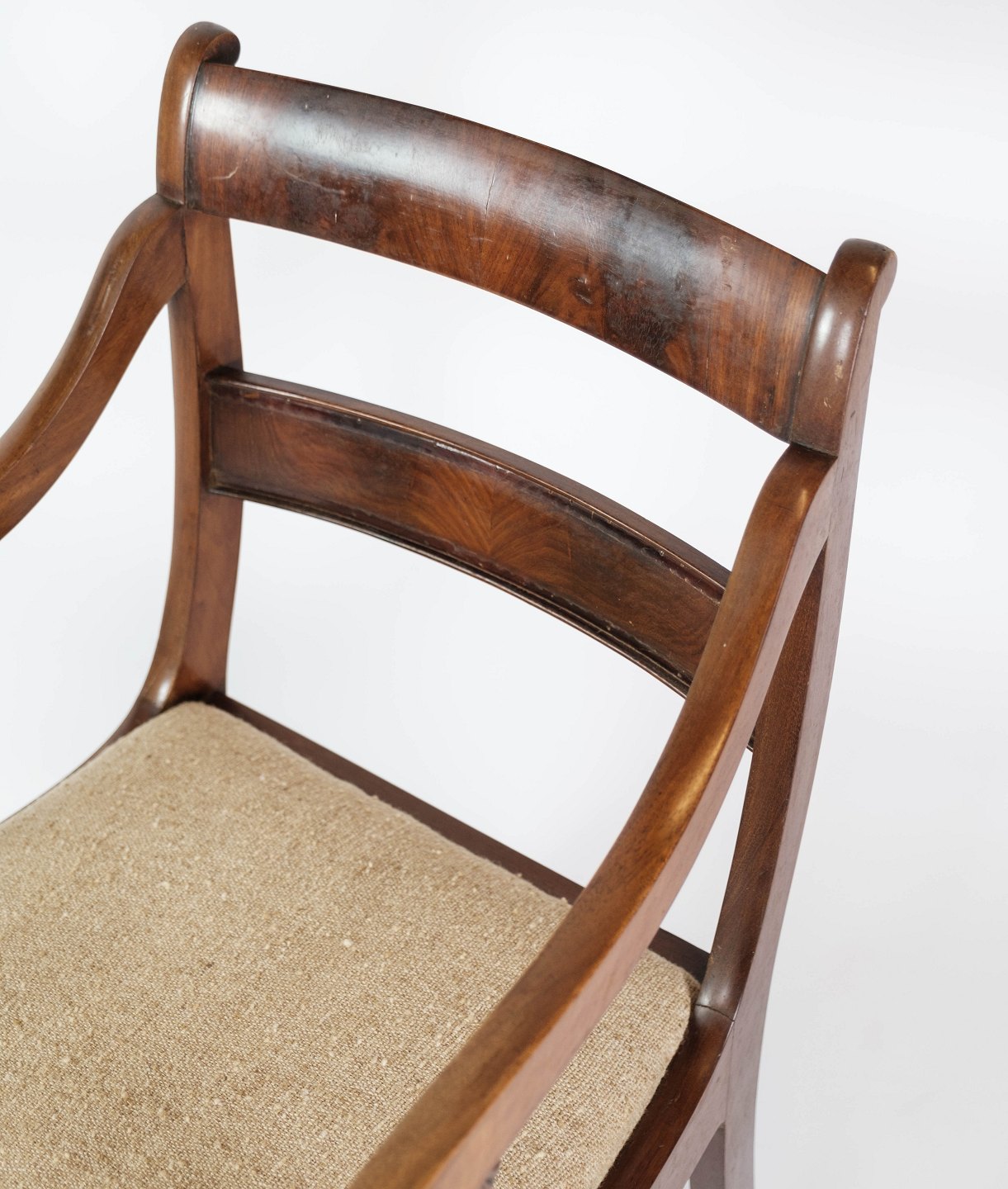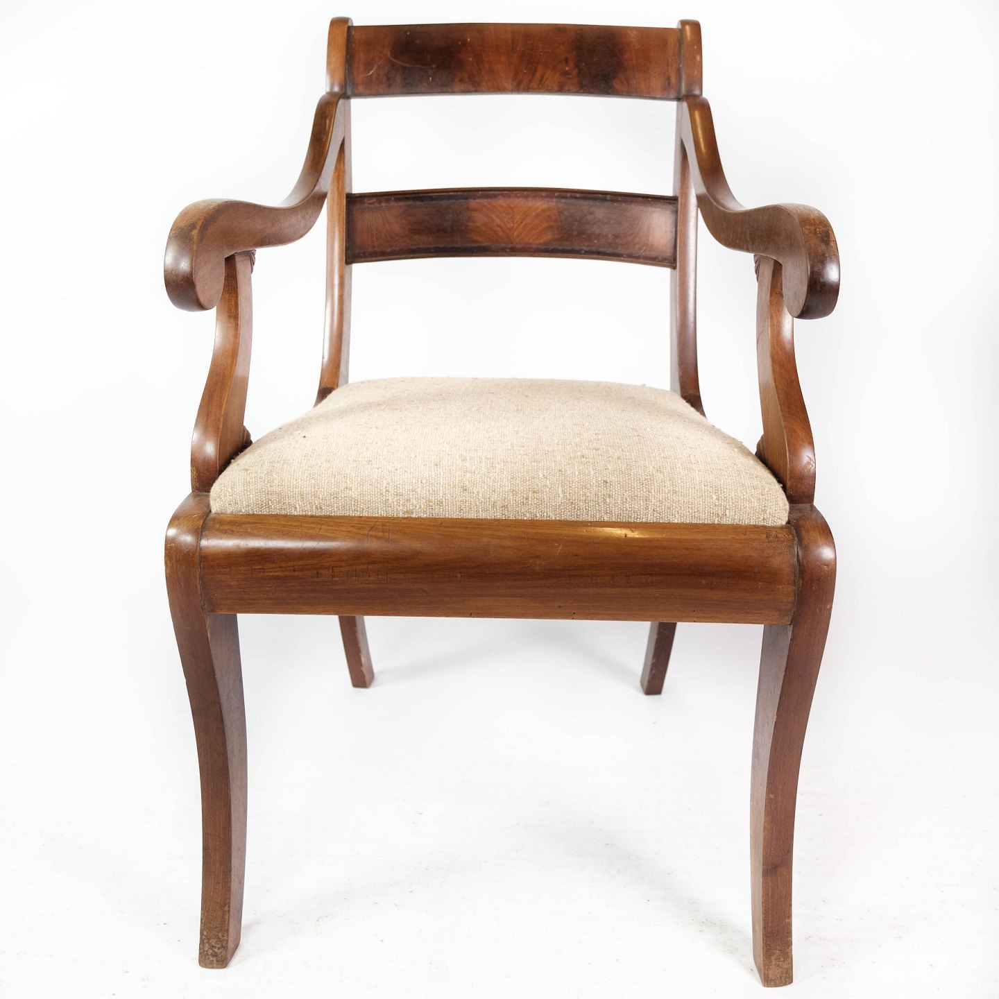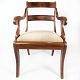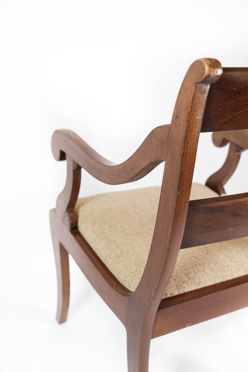 Late Empire armchair of mahogany and upholstered with light fabric, in grat antique condition from the 1860s.