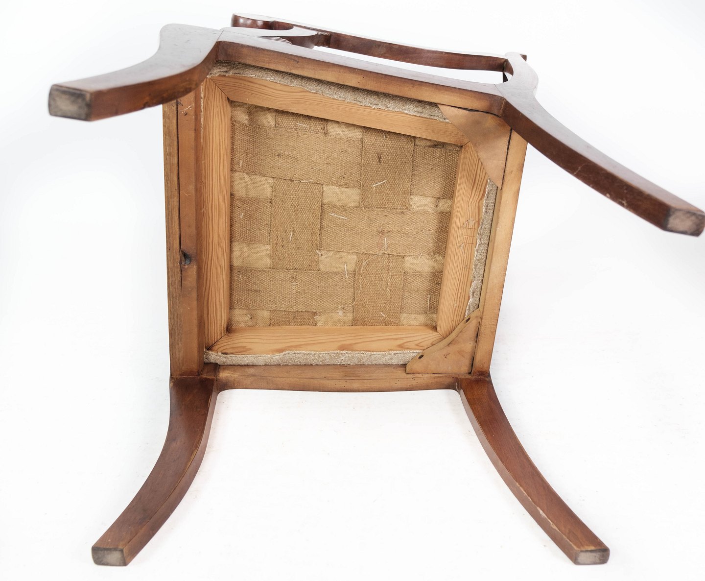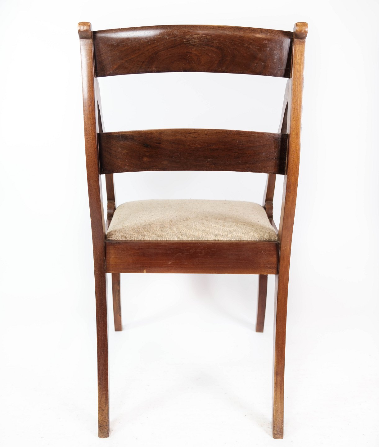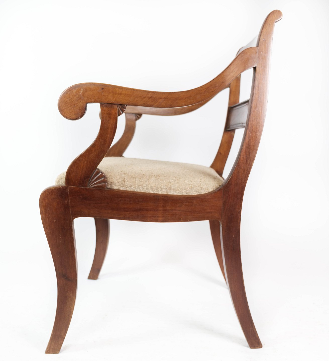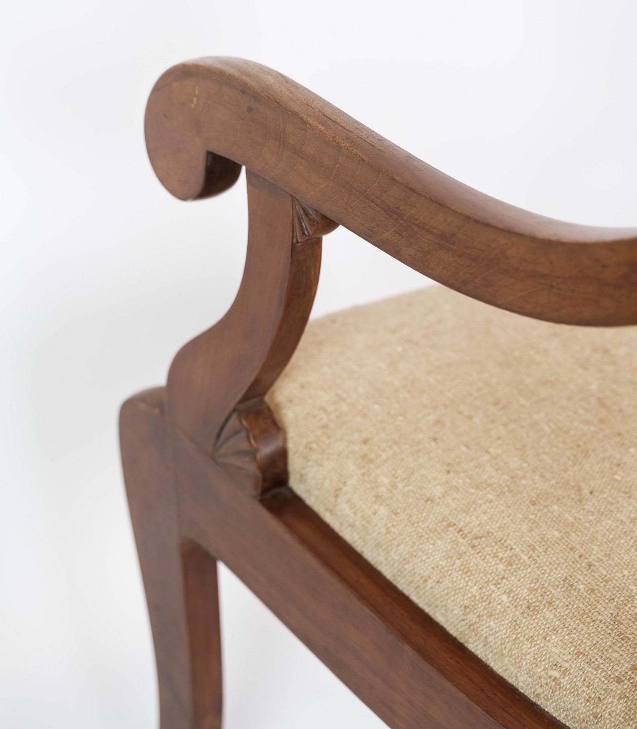 Late Empire armchair of mahogany and upholstered with light fabric, in grat antique condition from the 1860s.