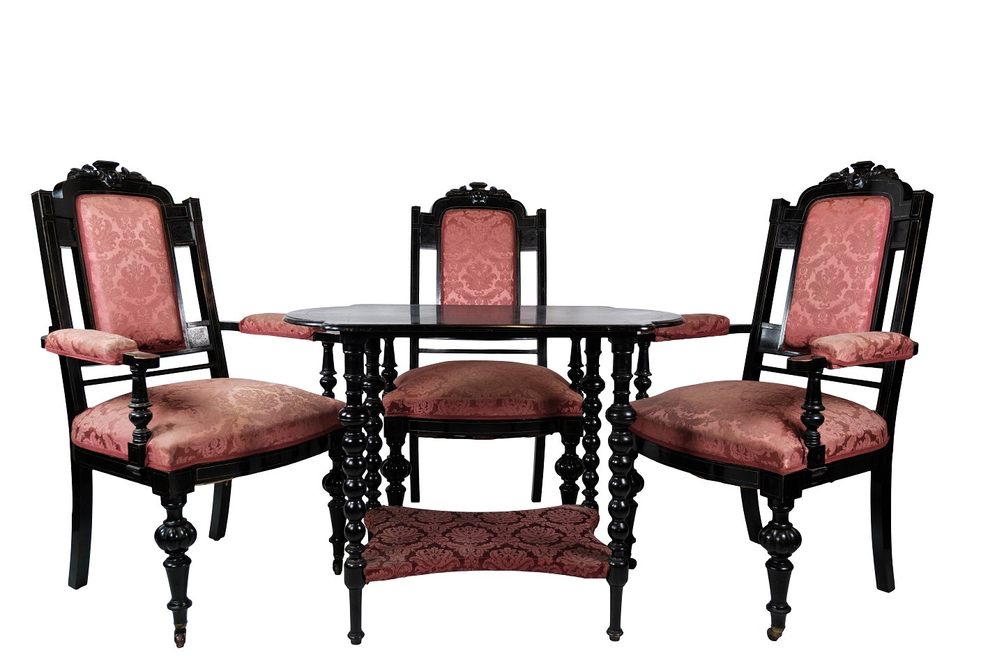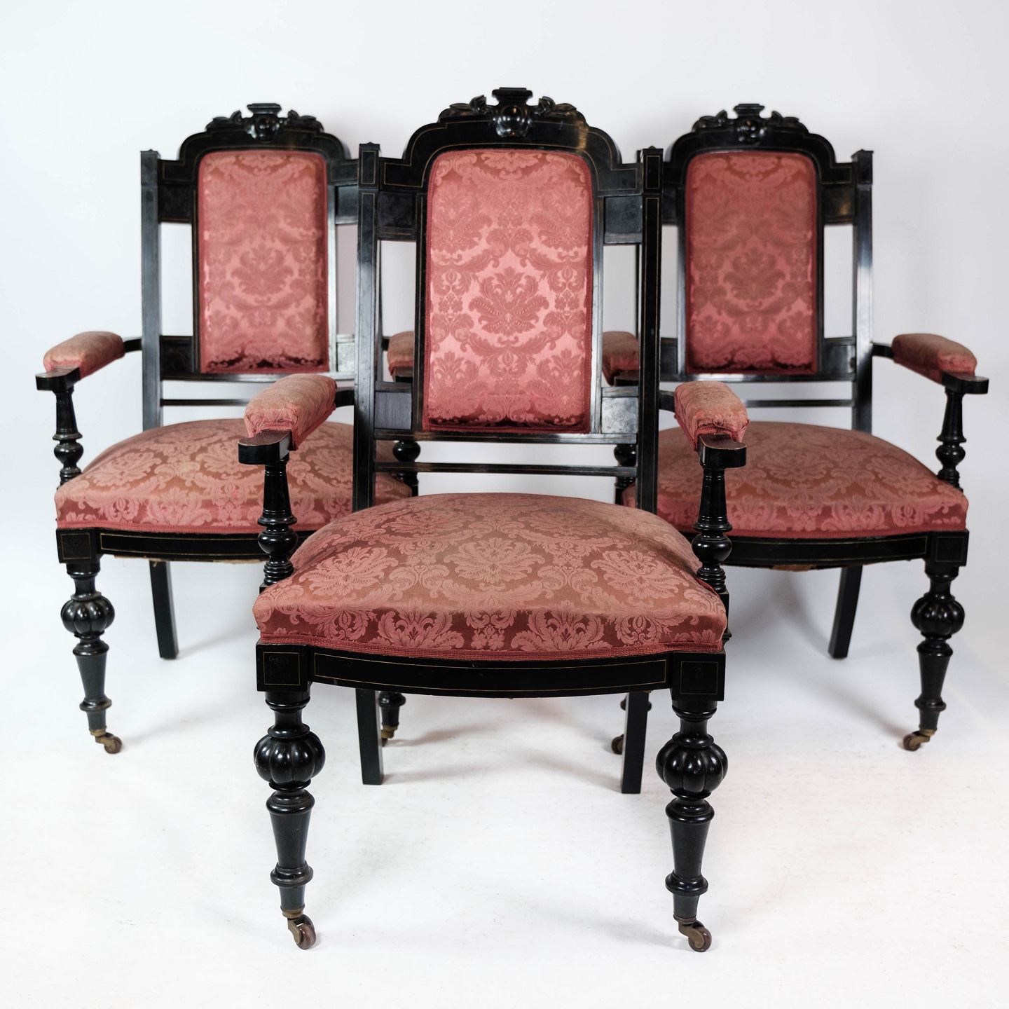 Three armchairs in dark wood and upholstered with red fabric, in great antique condition. The chairs are in great vintage condition.