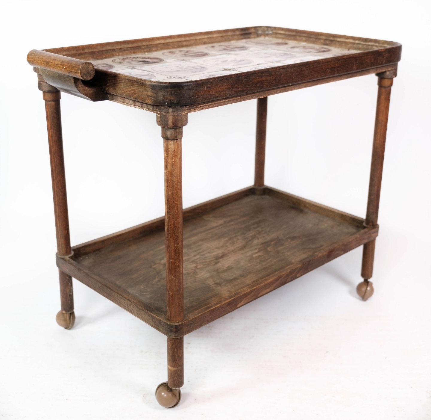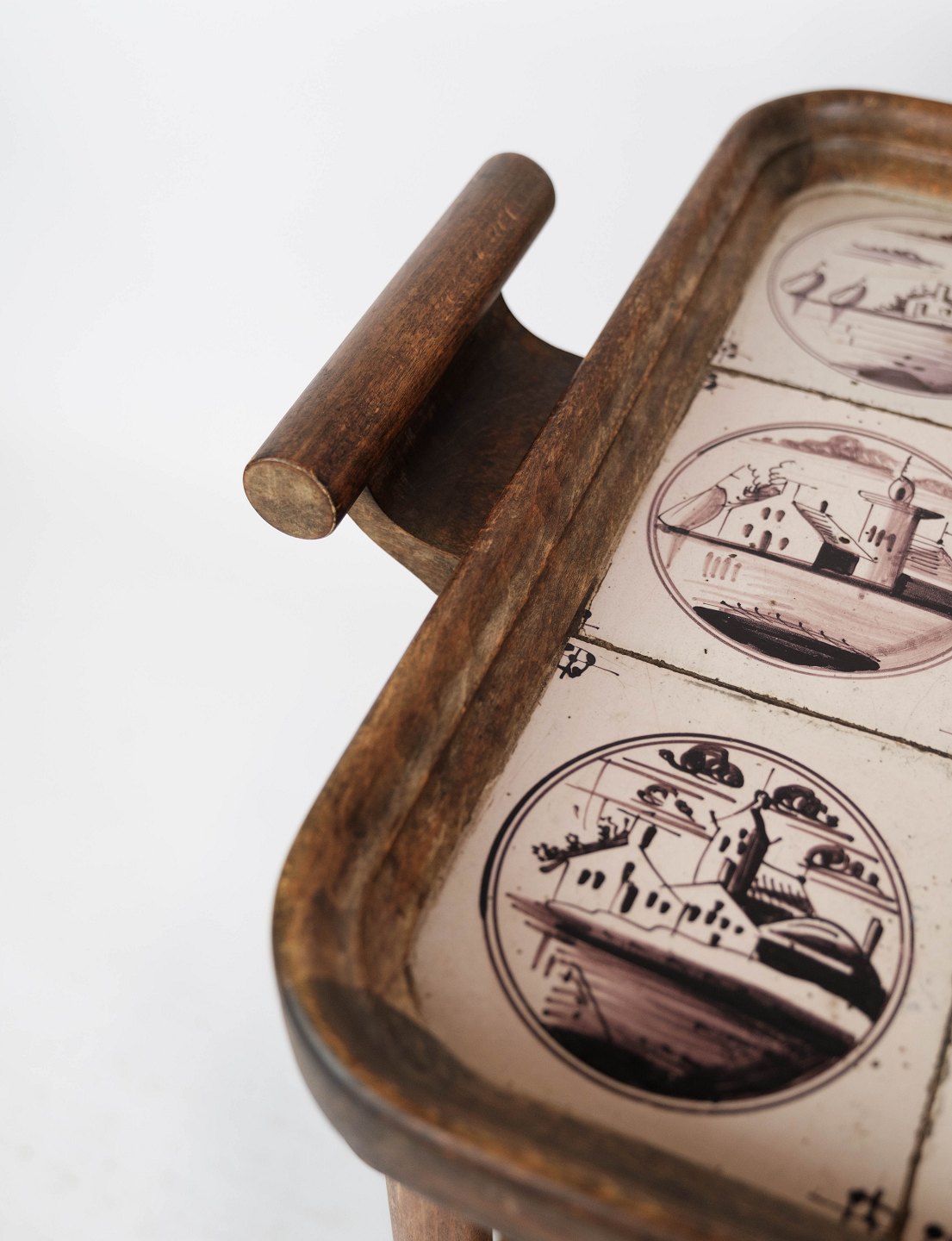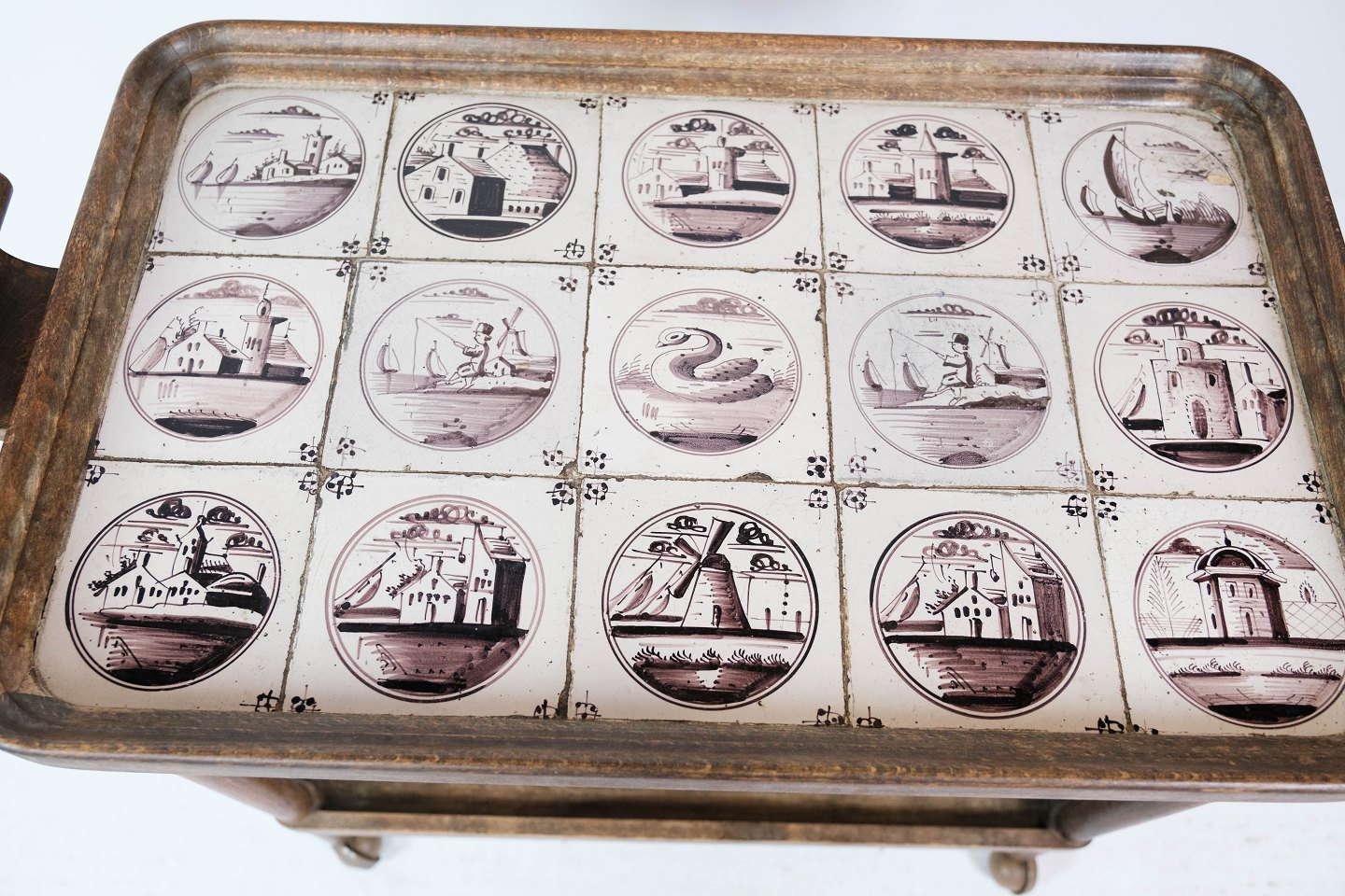 SolgtRullebord af mørkt træ dekoreret med hollandske kakler, i flot antik stand fra 1920erne.