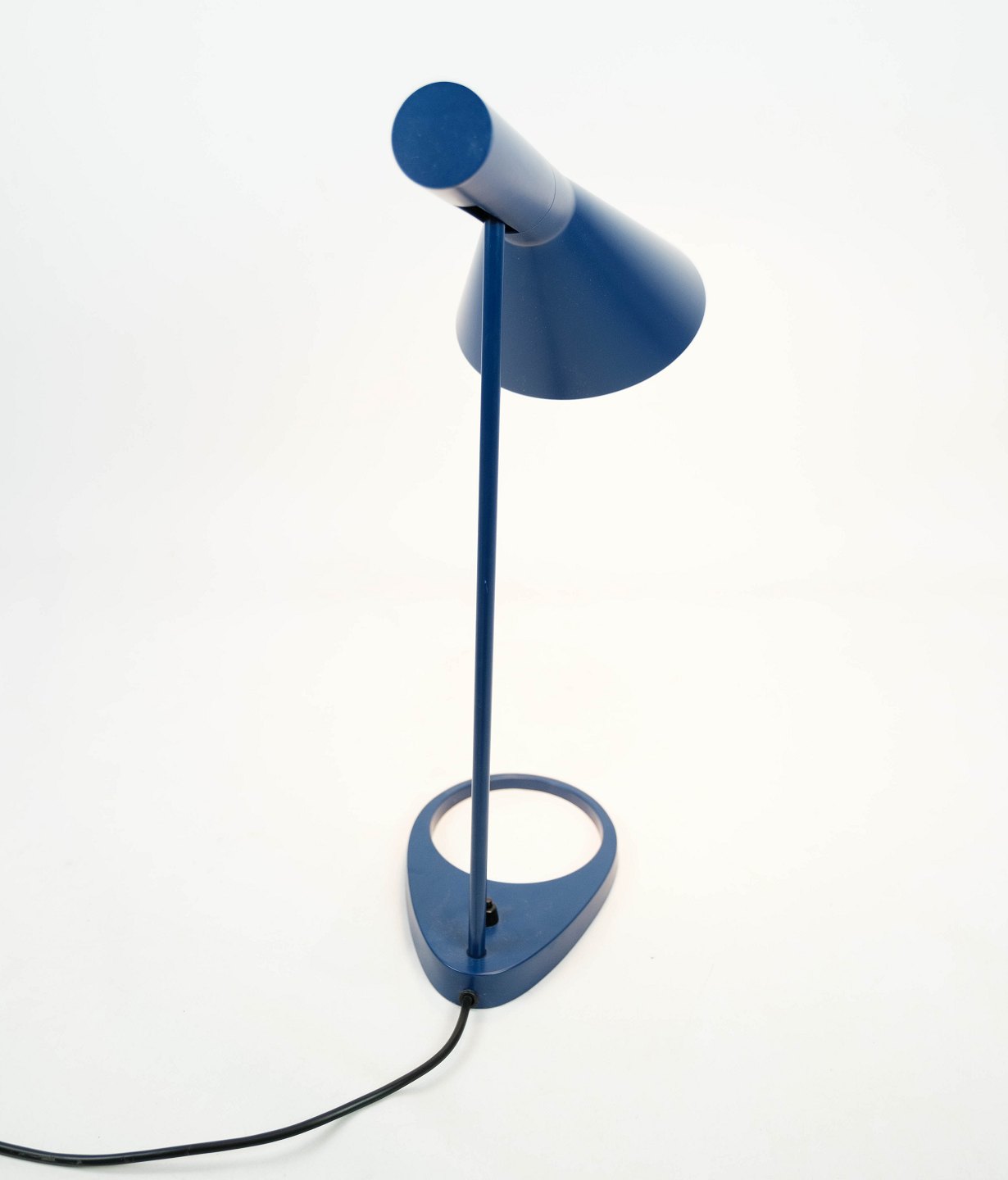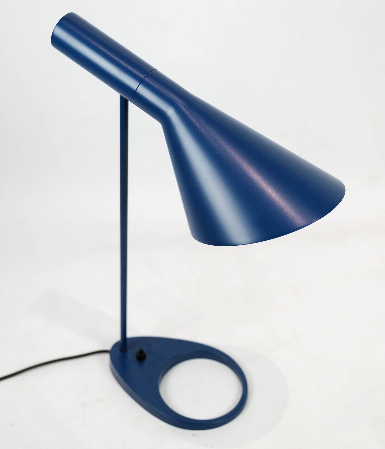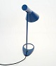 SolgtMørkeblå bordlampe designet af Arne Jacobsen og fremstillet af Louis Poulsen. Lampen blev originalt tegnet til SAS Royal Hotel i København i 1957 til hotellets designkoncept. Lampen her er den originale af stål med vipbart hoved, som udsender et direkte og retningsbestemt lys. Den er lakeret hvid på indersiden, samt blå udvendig. Lampen er i flot brugt stand.