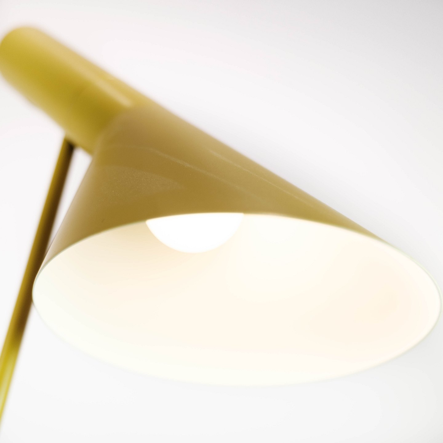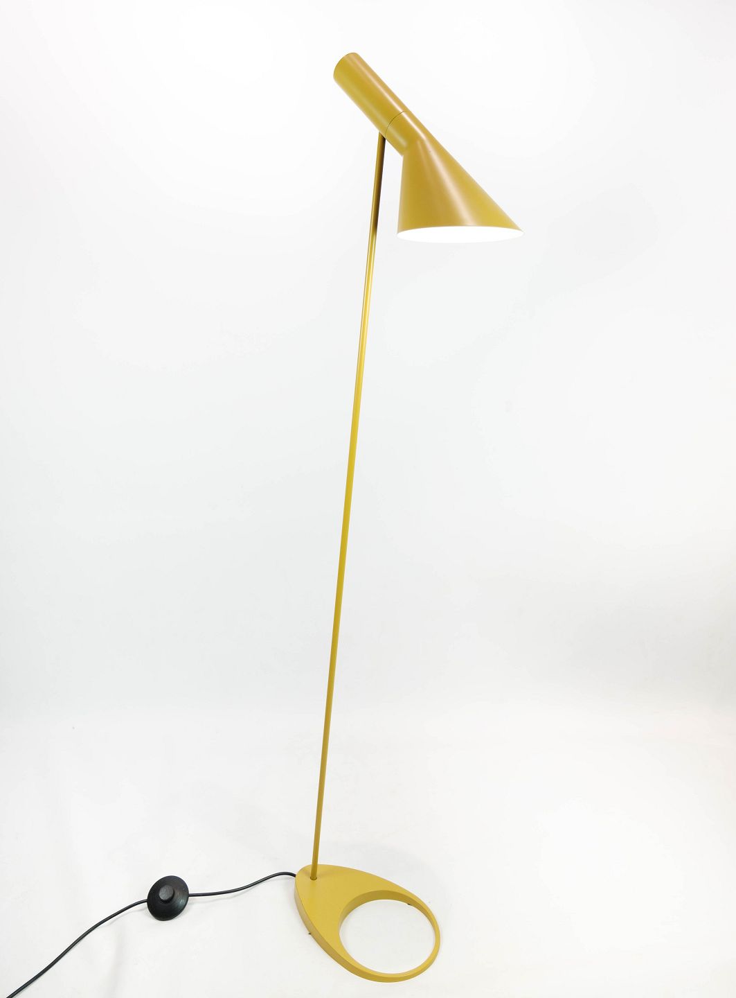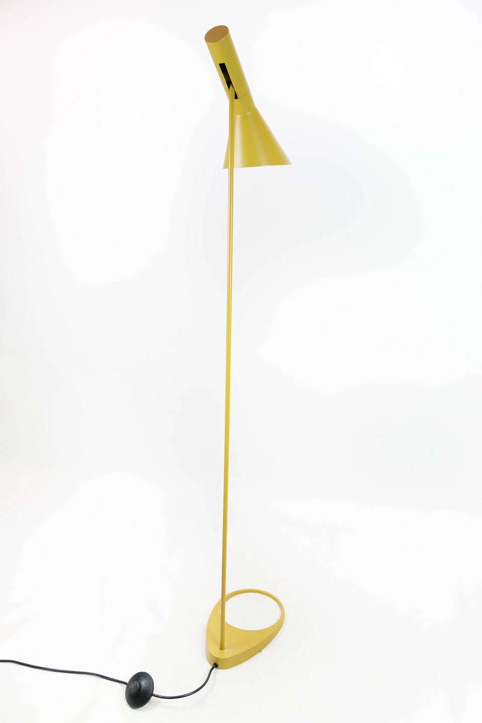 SolgtGul gulvlampe designet af Arne Jacobsen og fremstillet af Louis Poulsen. Lampen blev originalt tegnet til SAS Royal Hotel i København i 1957 til hotellets designkoncept. Lampen her er den originale af stål med vipbart hoved, som udsender et direkte og retningsbestemt lys. Den er lakeret hvid på indersiden, samt gul udvendig. Lampen er i flot brugt stand.