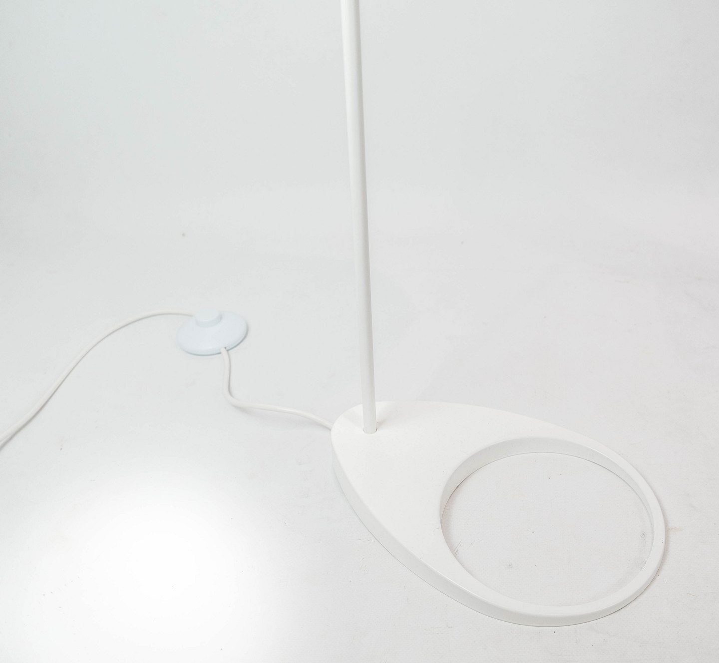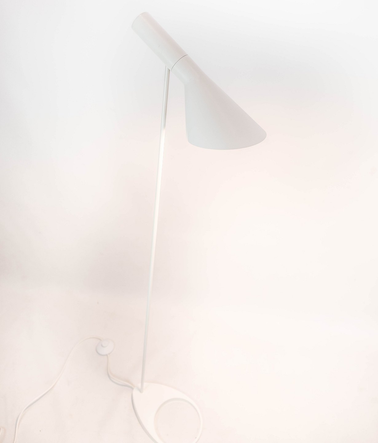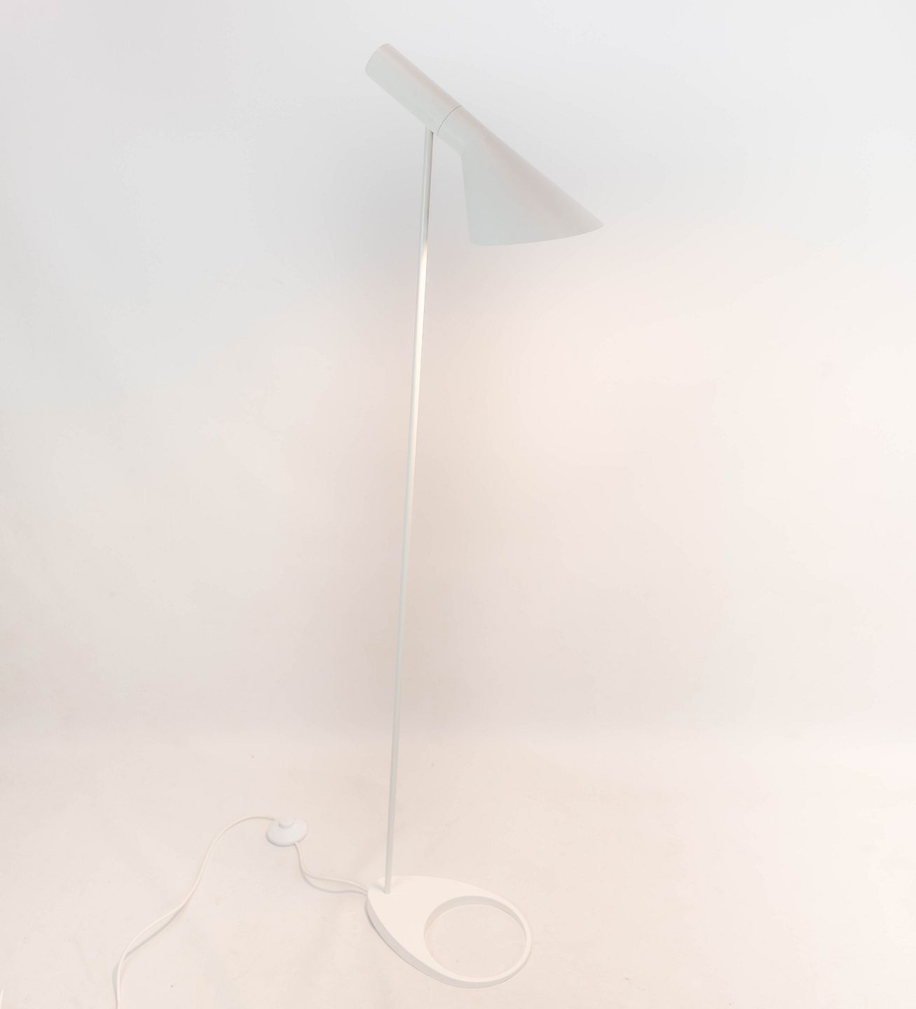 Hvid gulvlampe designet af Arne Jacobsen og fremstillet af Louis Poulsen. Lampen er i flot brugt stand.
