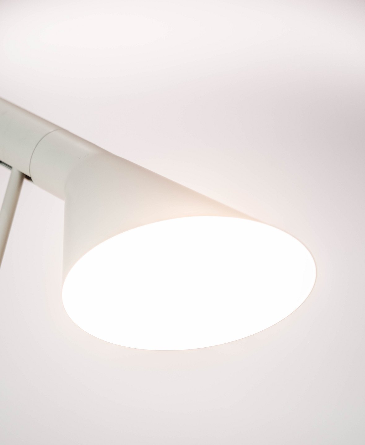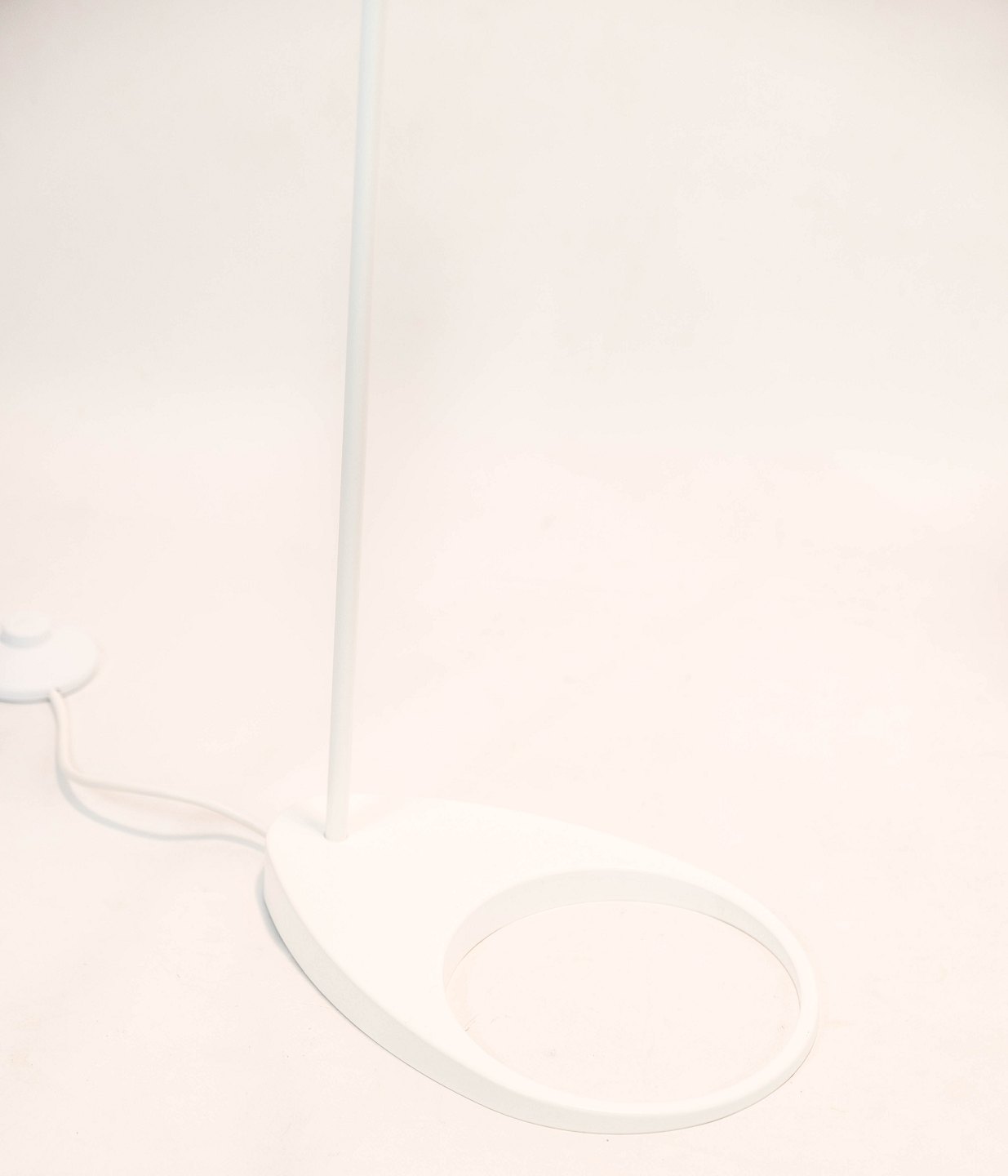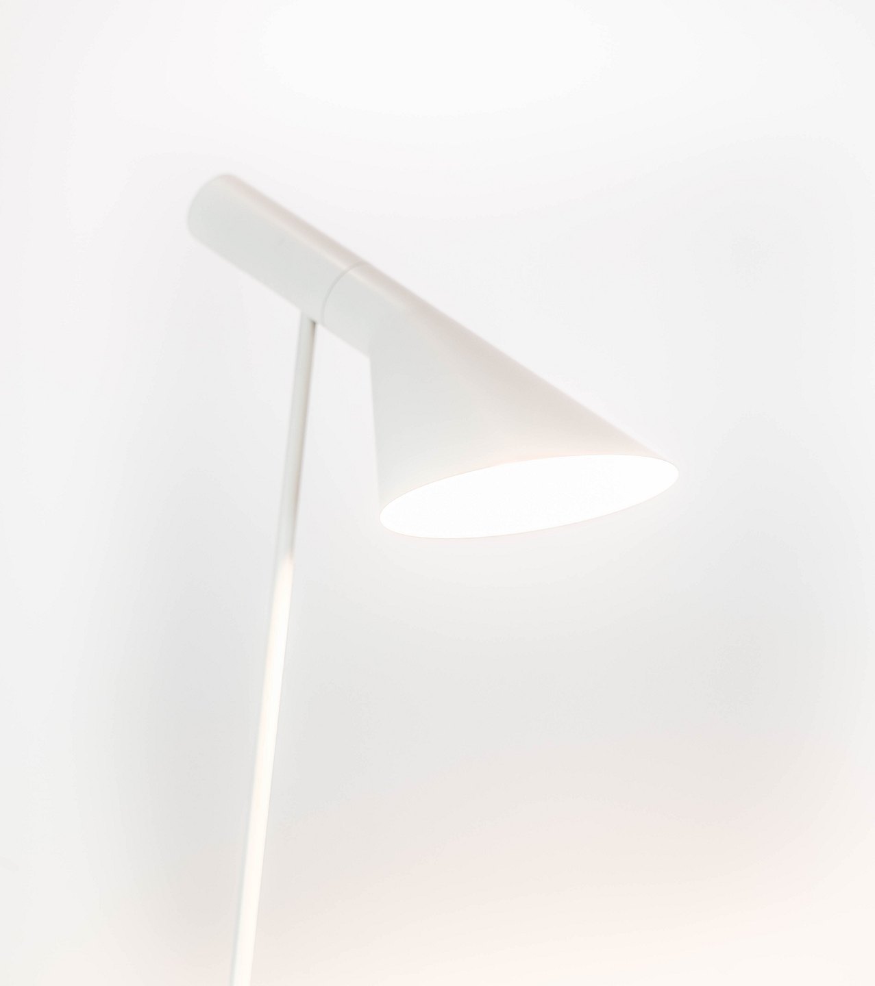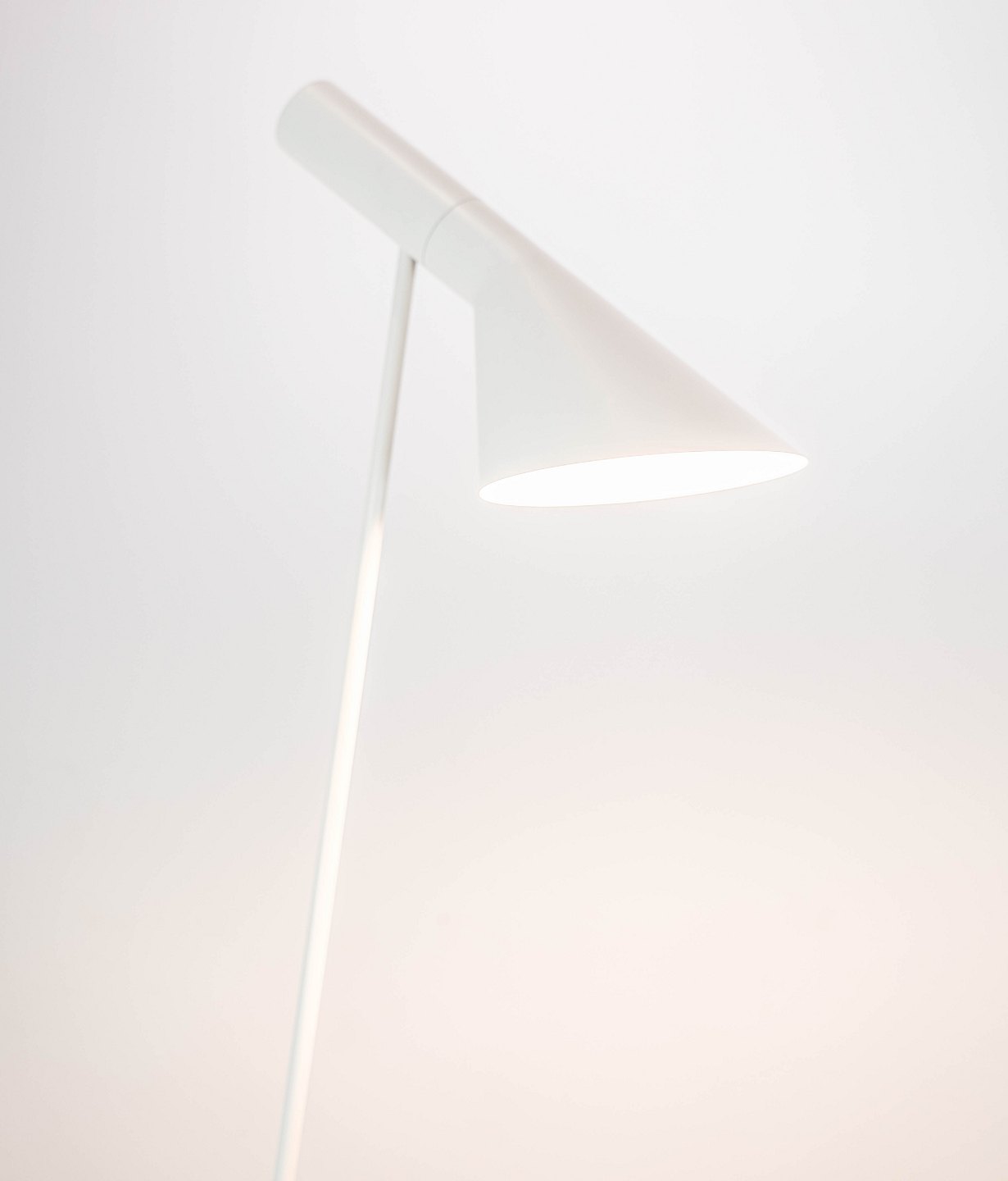 Hvid gulvlampe designet af Arne Jacobsen og fremstillet af Louis Poulsen.