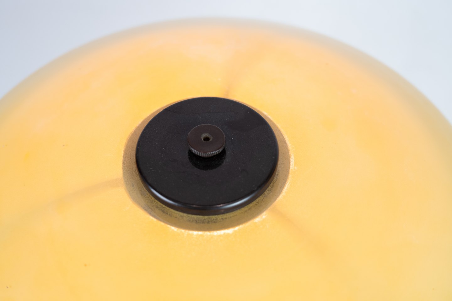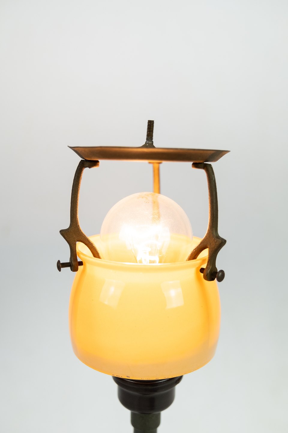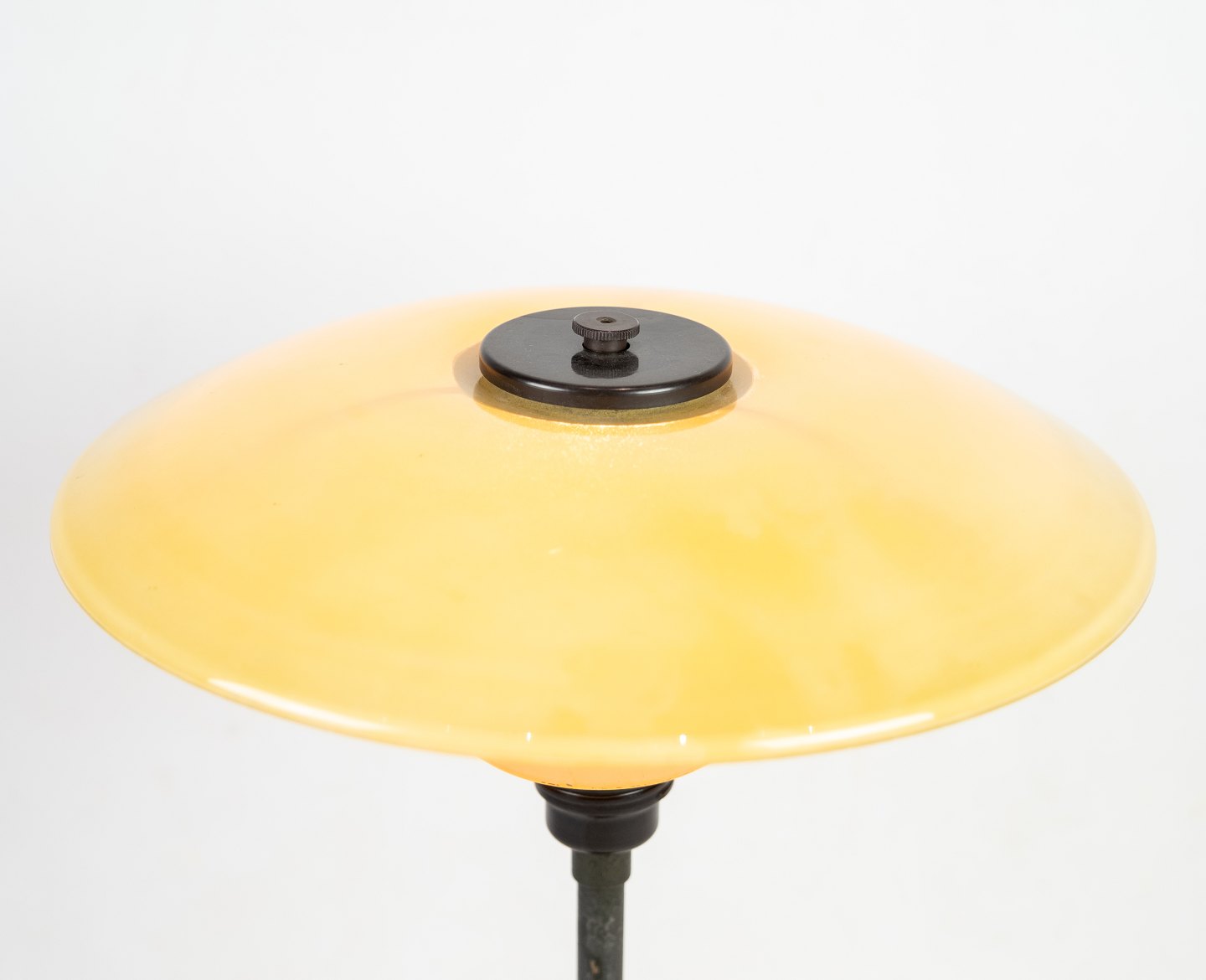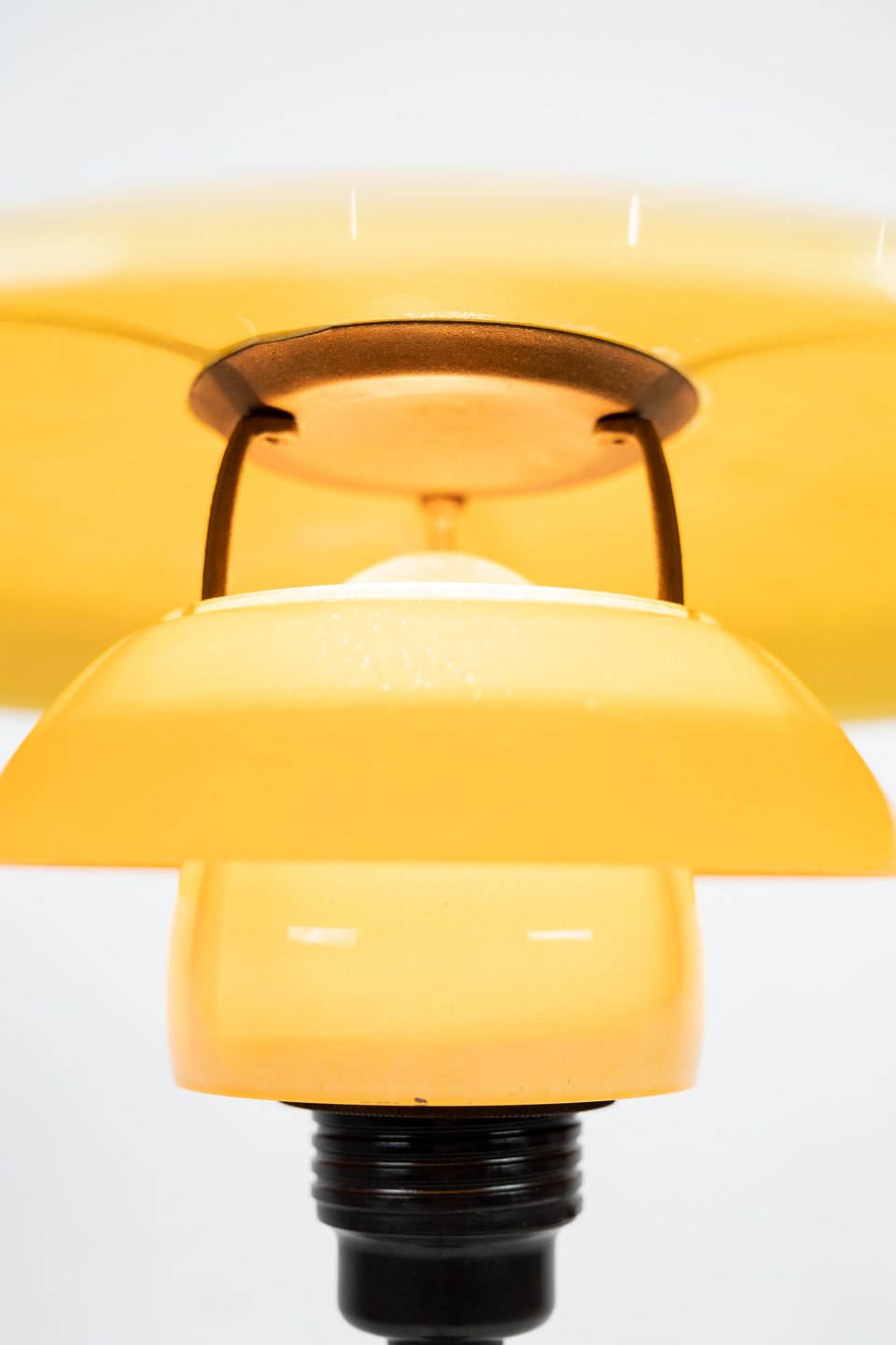 SolgtPH 3-1/2 2-1/2 bord lampe med bruneret metalstel og gul mat opalskærme med gennem gående afbryder fra år 1933. Lampen fremstår i meget fin brugt stand.