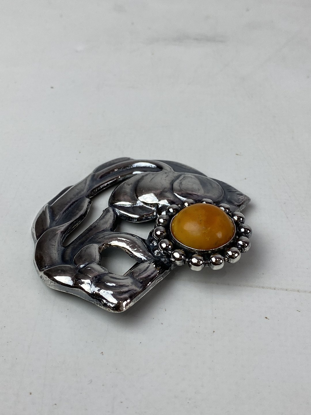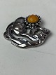 Broche af 833 sølv i jugendstil med rav, stemplet BH fra 1930erne. Brochen er i flot brugt stand.