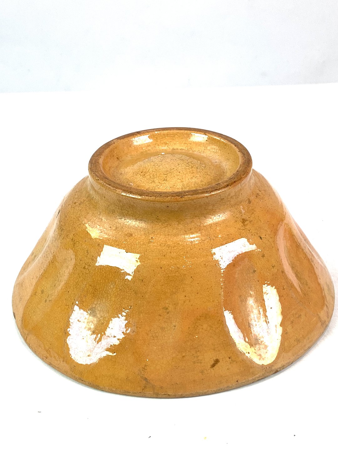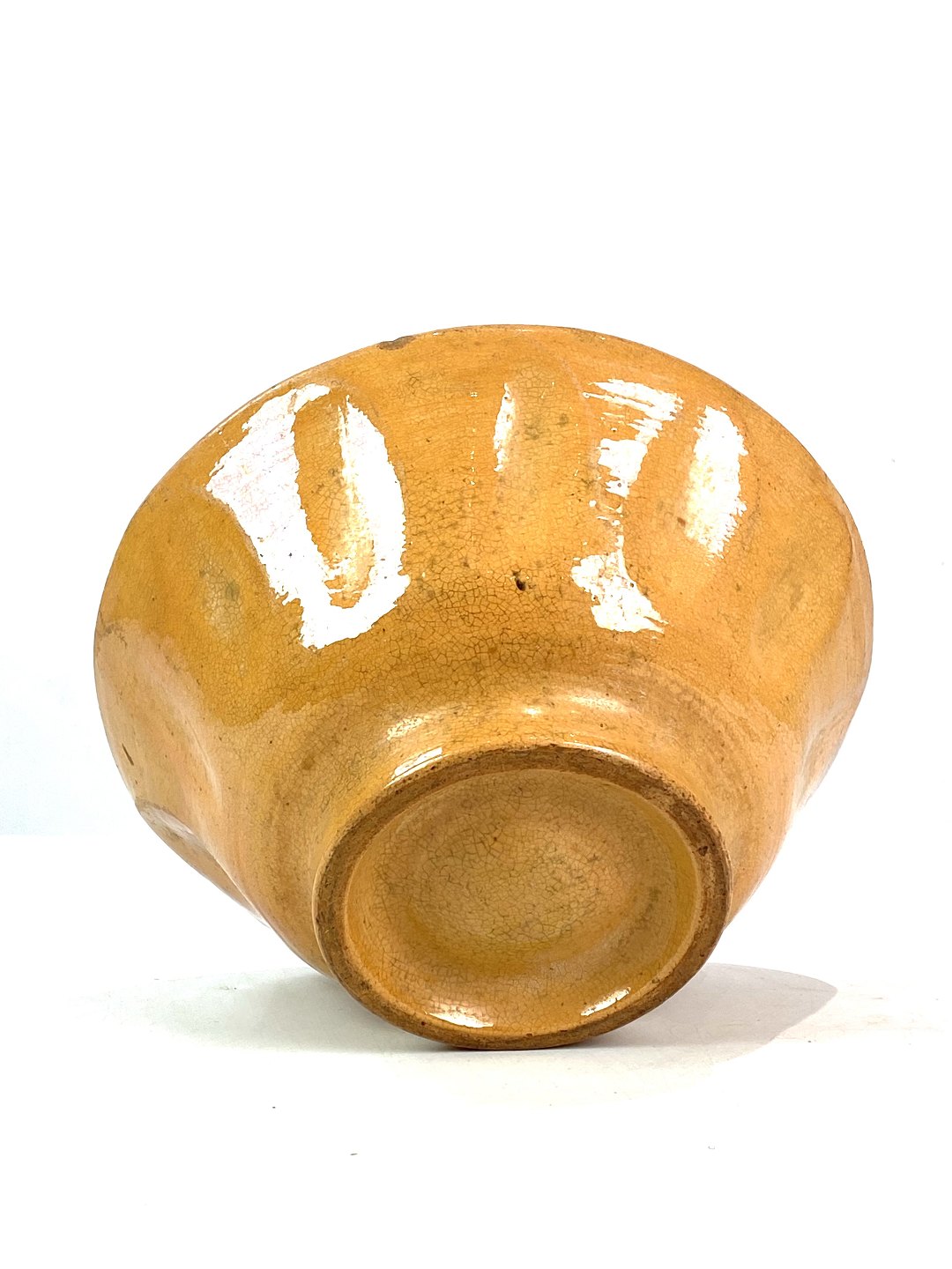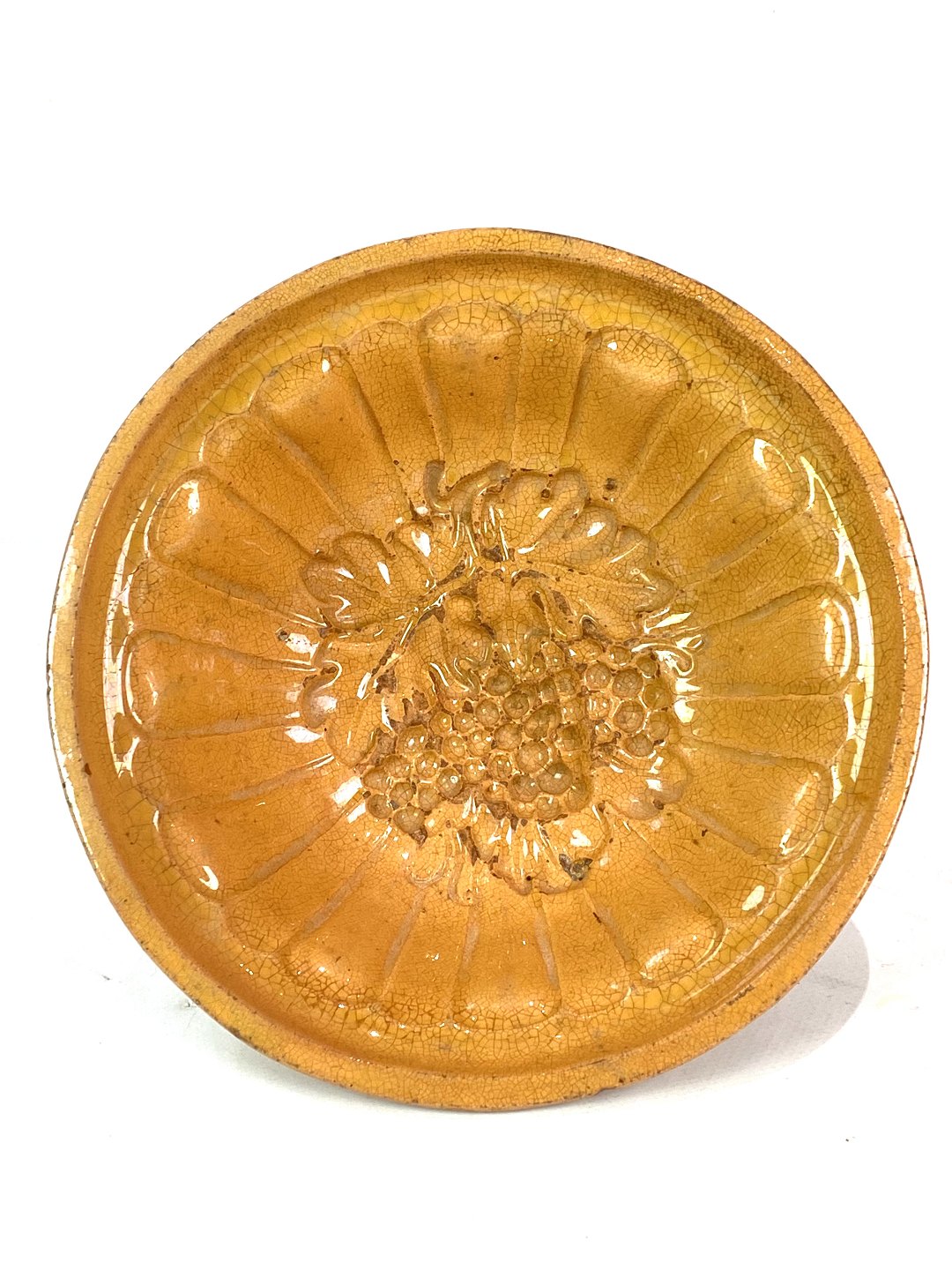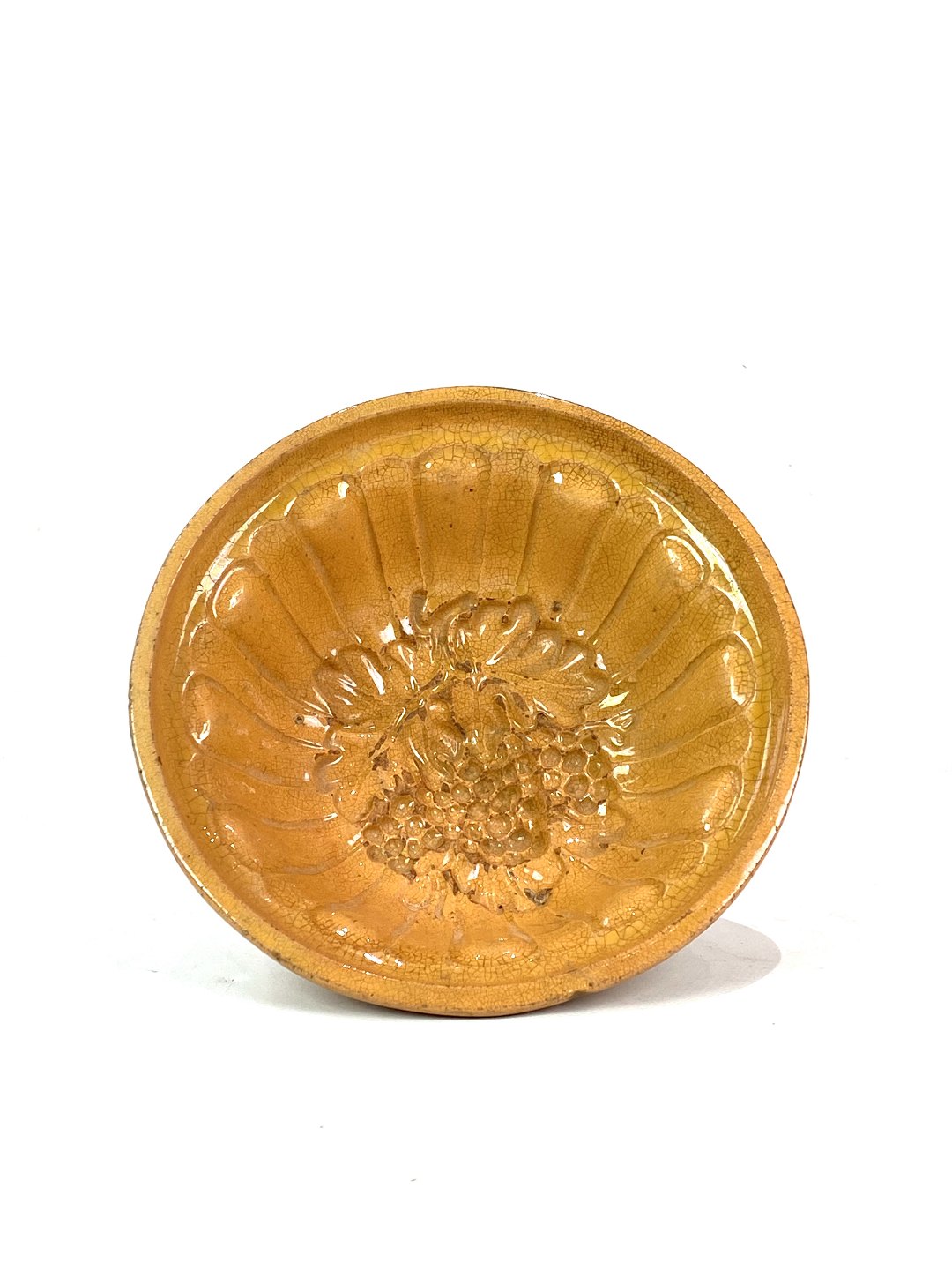 Keramik buddingeform med gul glasur fra omkring 1930erne. Skålen er i flot brugt stand.