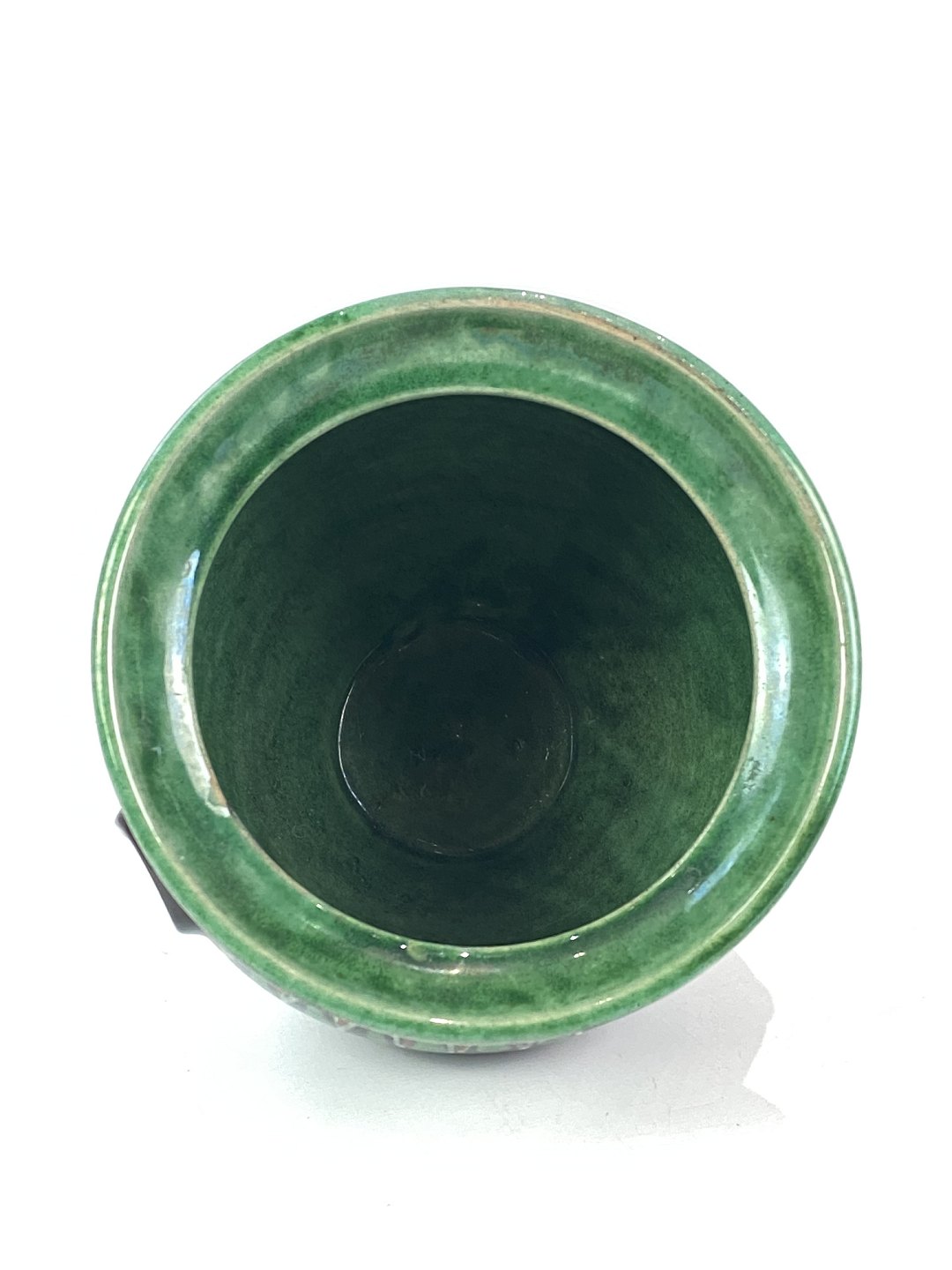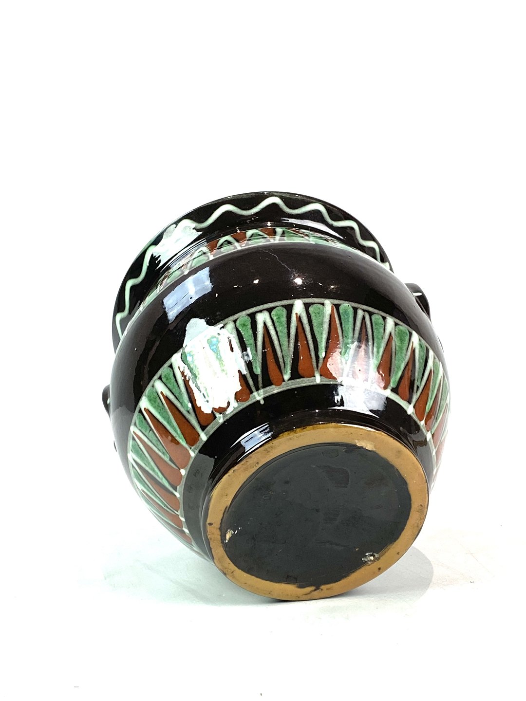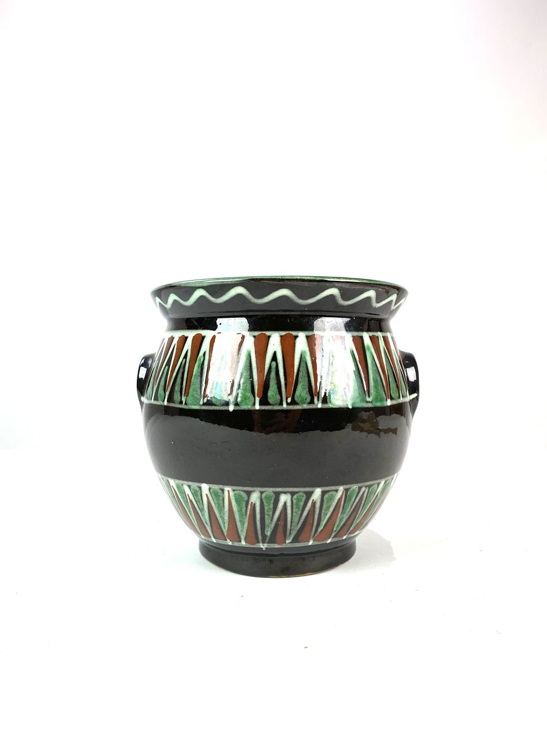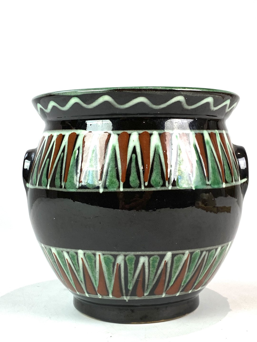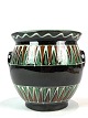 Urtepotteskjuler i mørke farver og grønt mønster, fra omkring 1930erne.