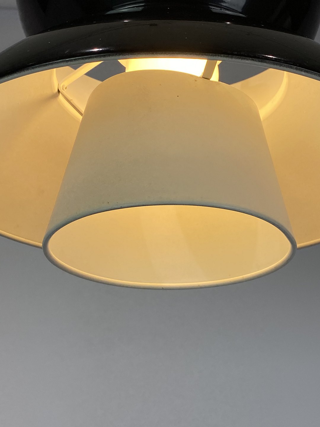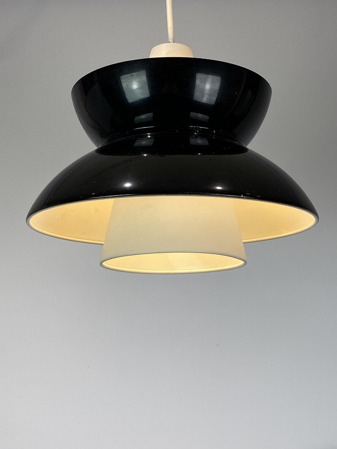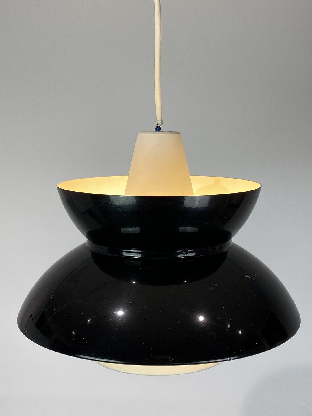 Søværnspendlen i sort og hvid designet af Jørn Utzon og fremstillet af Louis Poulsen i 1960erne. Lampen er i flot brugt stand.