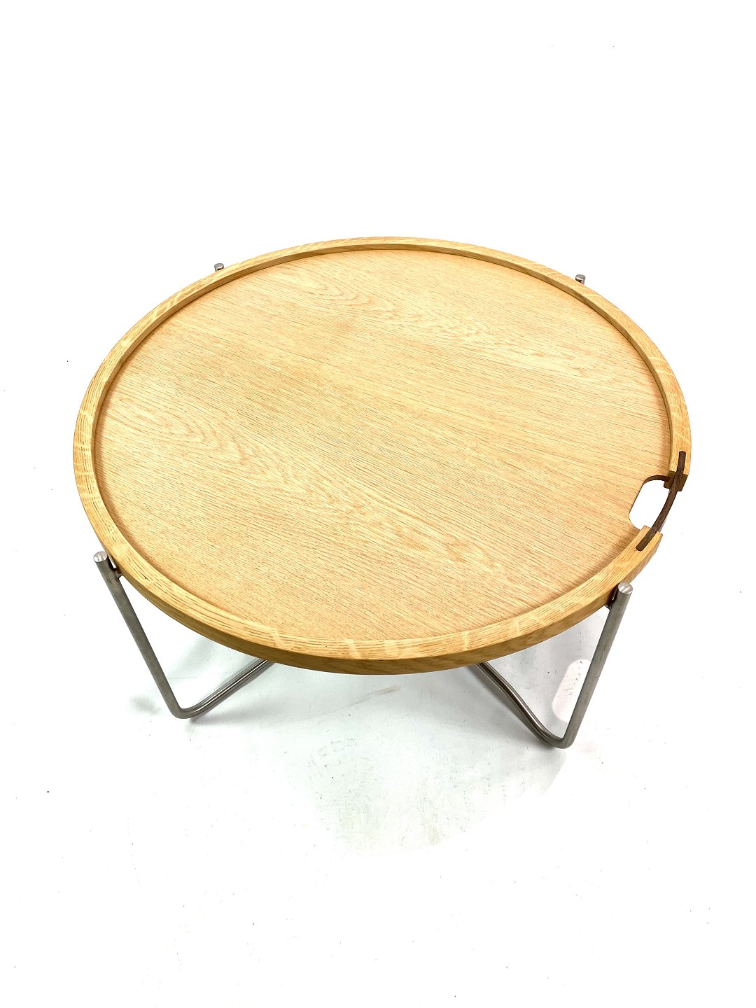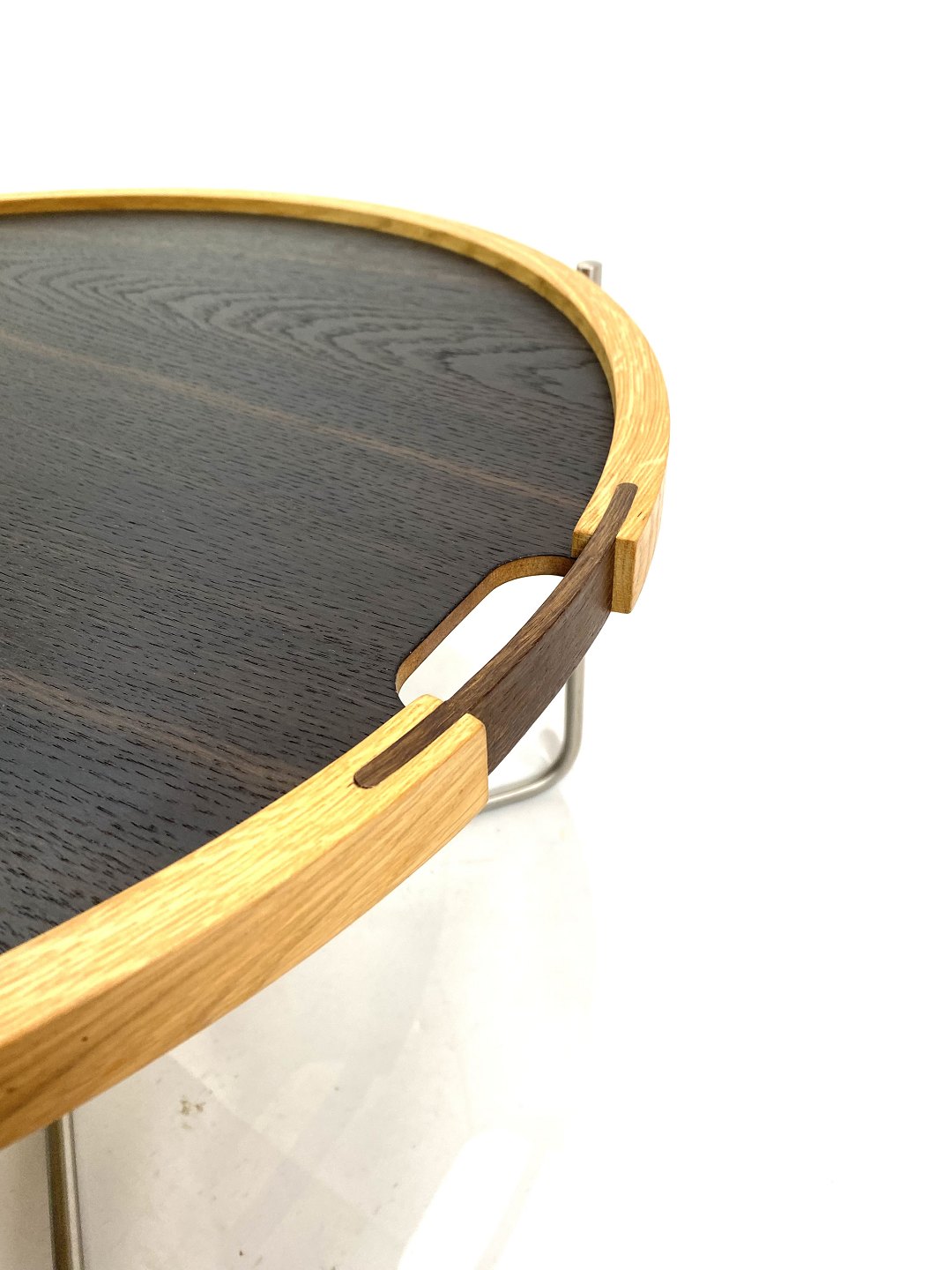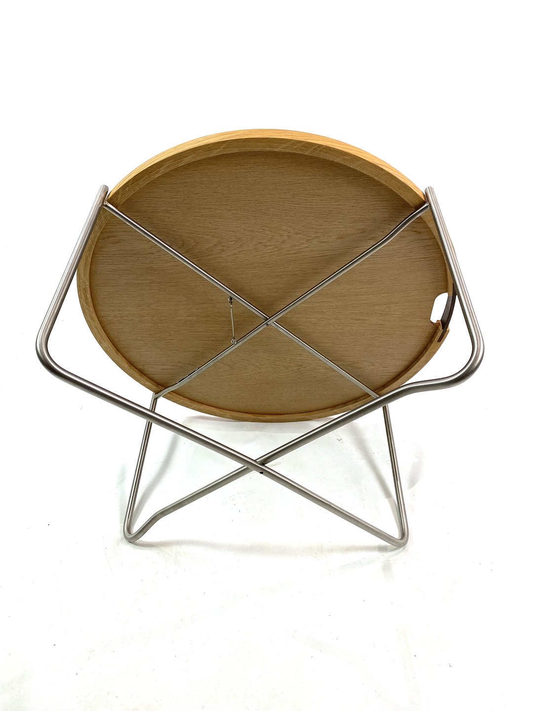 SoldTray table from Carl Hansen & Søn, designed by Hans J. Wegner. The tray table consists of 2 parts. A collapsible legs and a tray. The legs is made of stainless steel and the table top is made of walnut veneer. The wood is oiled oak.