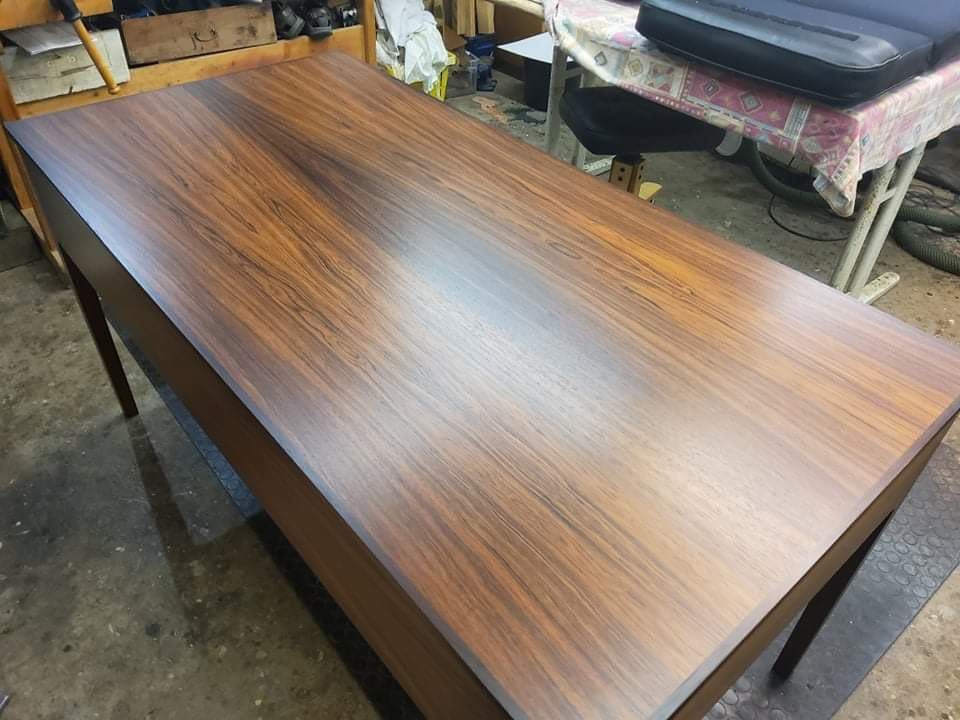 Here you can see a desk that we got in through an insurance case, a fire damage. All furniture can be fine restored. It just depends on hourly consumption. The desk was designed by Ole Wanscher for A.J Iversen in the rosewood type.