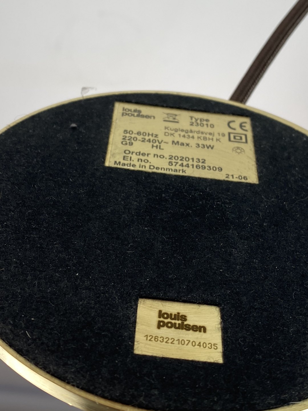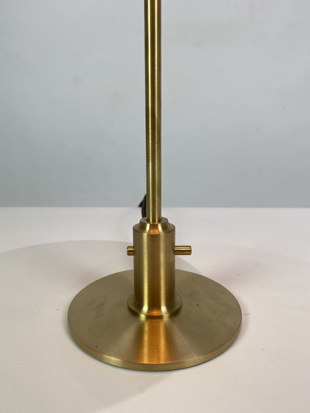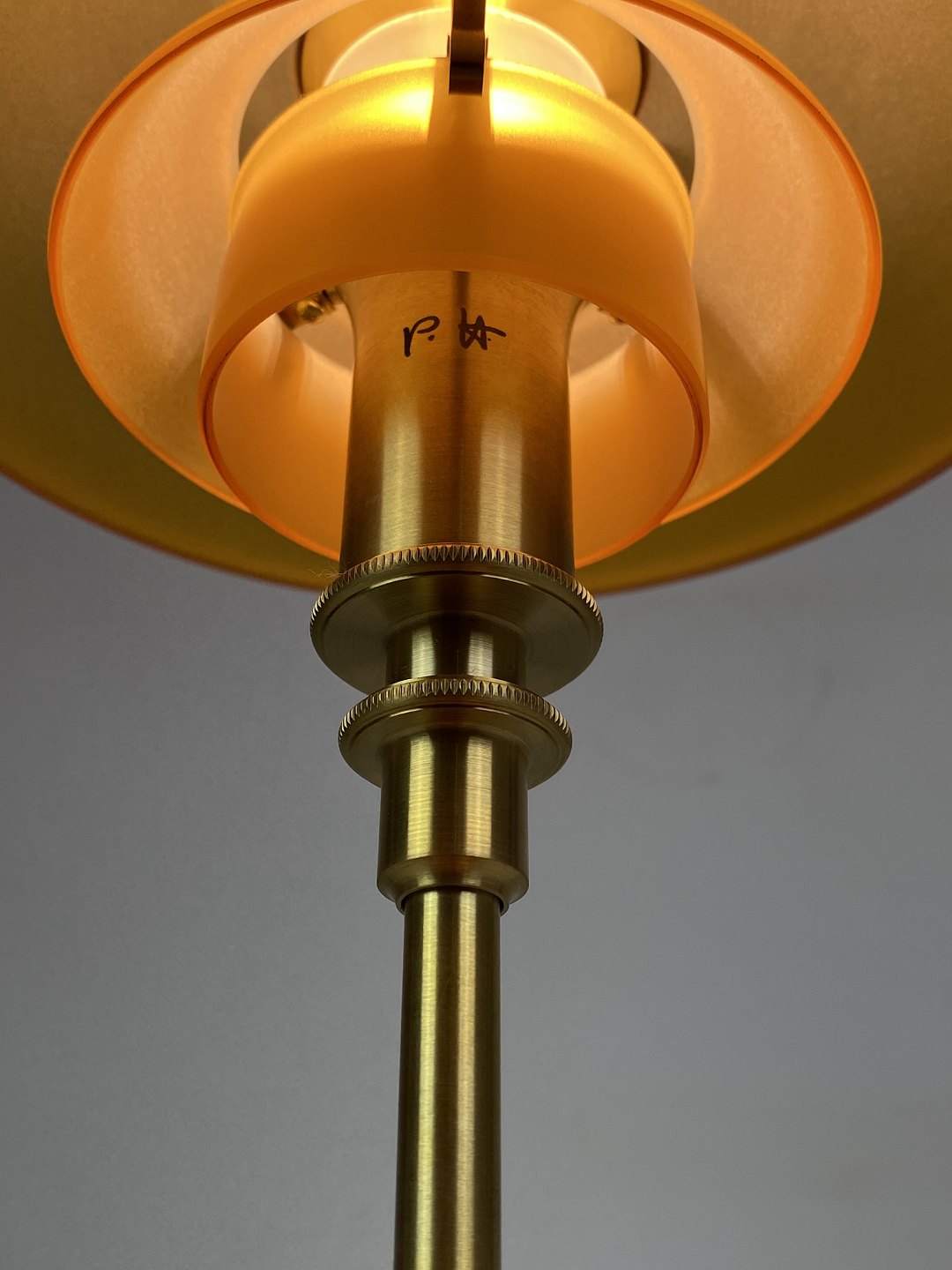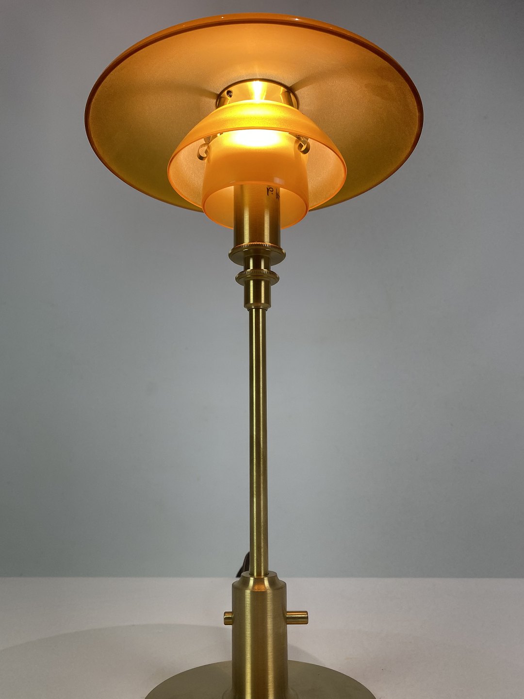 Materiale: Skærme: Mundblæst ravfarvet trelagsglas. Blankt på ydersiden, sandblæst på indersiden. Topplade, fod og stander: Messing, børstet og ubehandlet. Den ubehandlede messing vil ændre sig over tid og udvikle patina. Ledningslængde: 2,8 m. Gennemgående afbryder. Ledning: Brun tekstilledning.