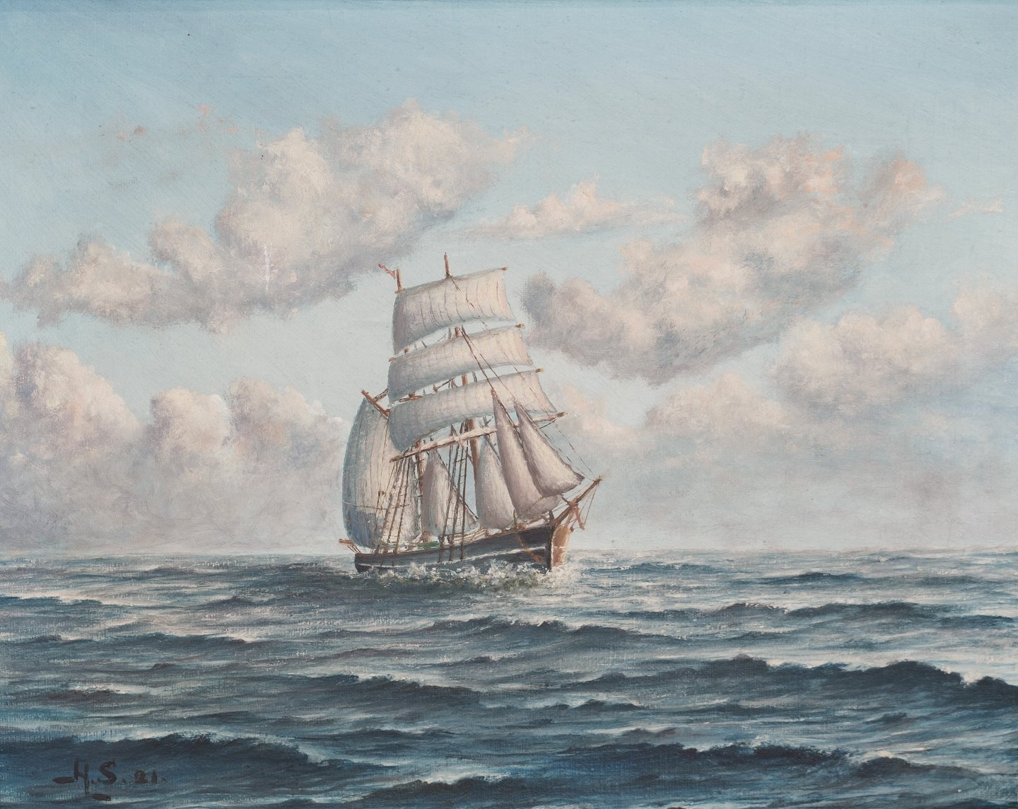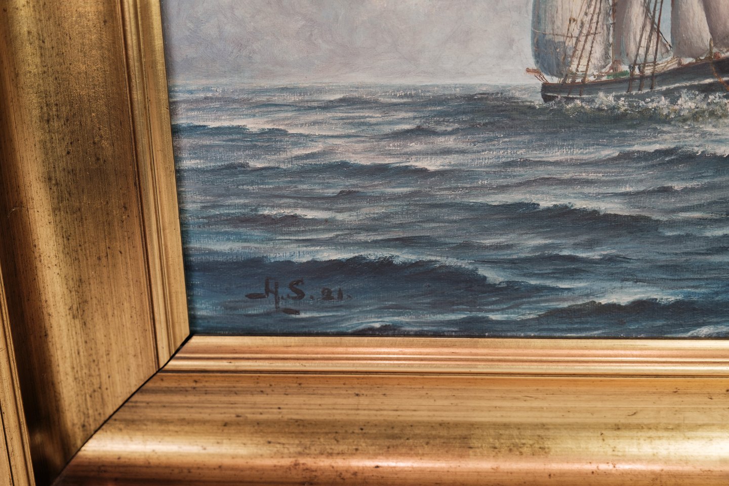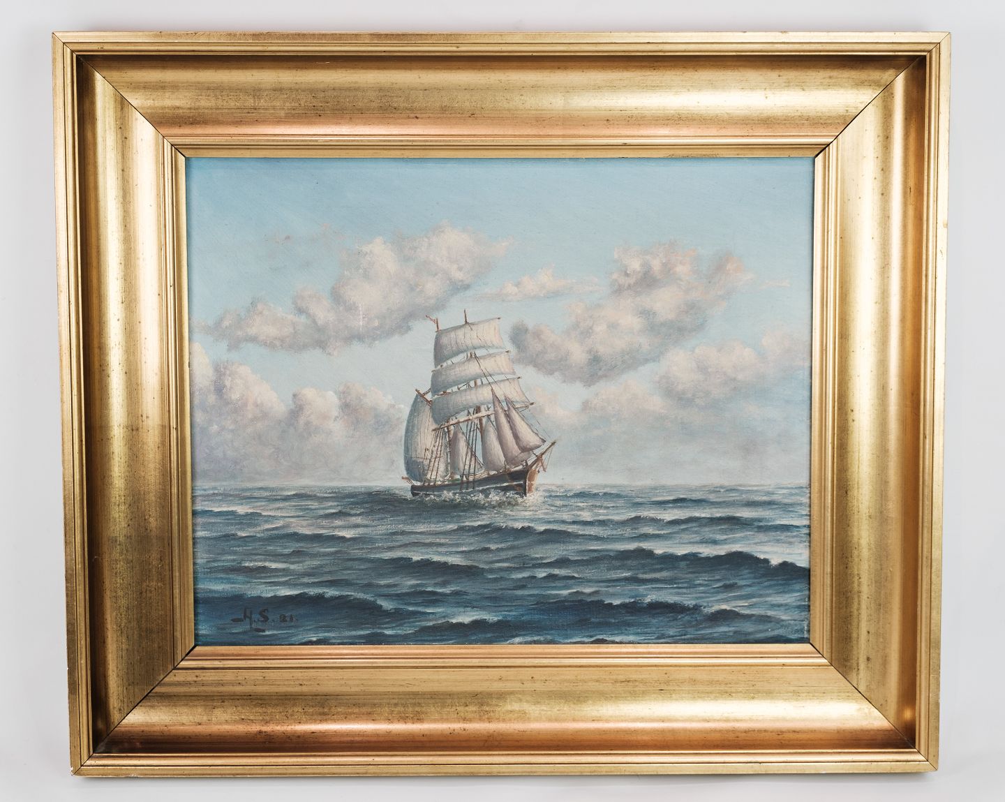 SoldMarine painting of sea, ship and clouds with gold frame signed A.S 21 from the 1920s. Painted by Captain A Sandvig, which is writtin on the back of the frame.