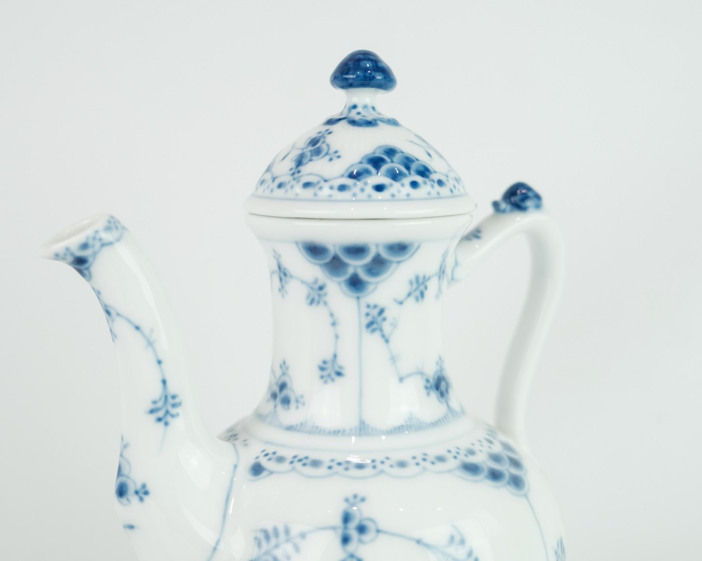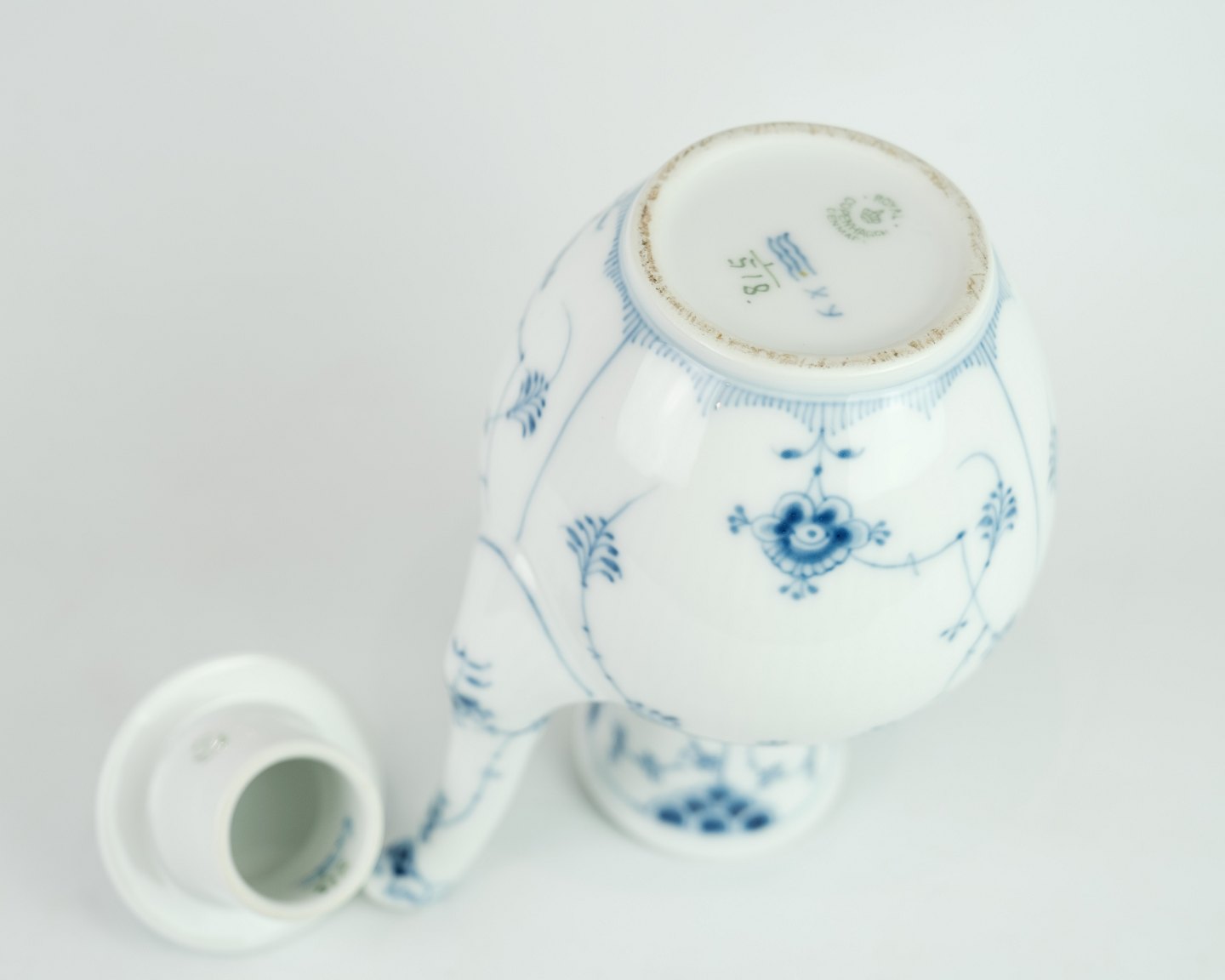 Royal Copenhagen kongelig musselmalet halvblonde kaffekande nr. 1/518. Står i meget fin brugt stand