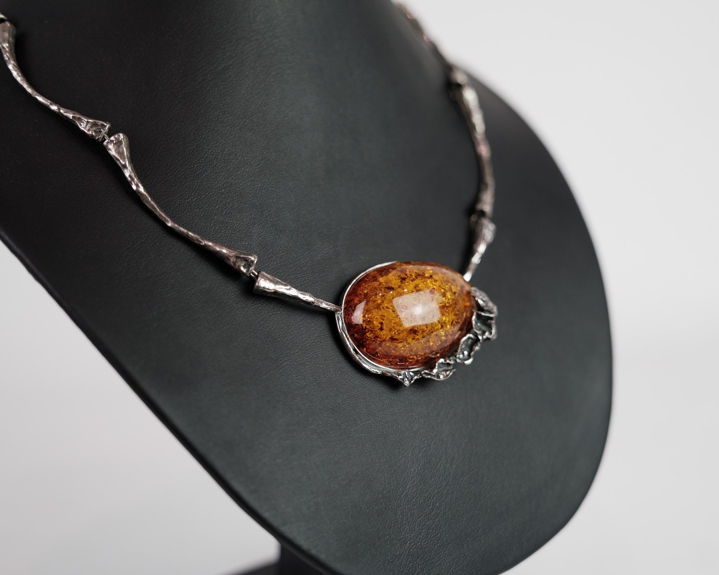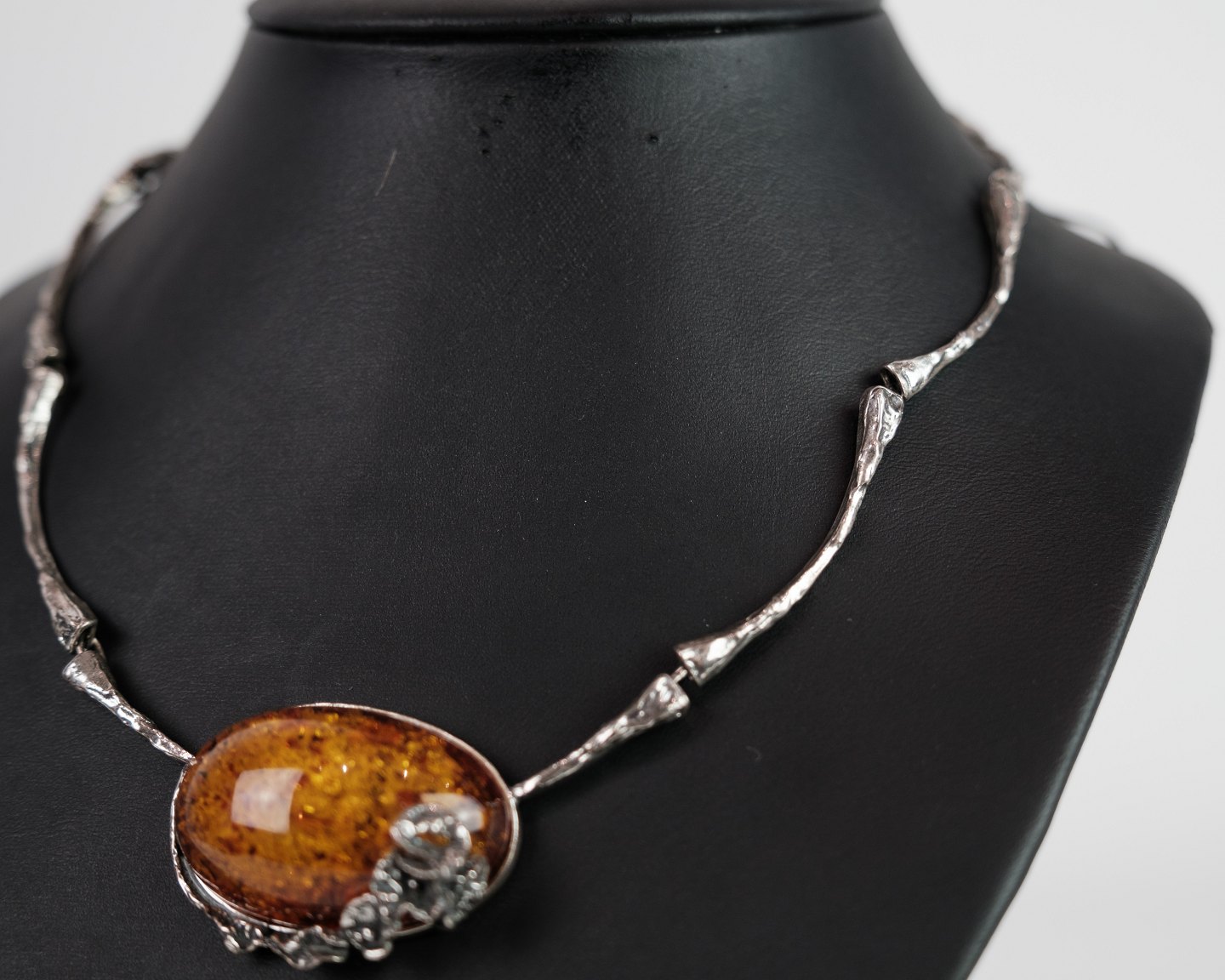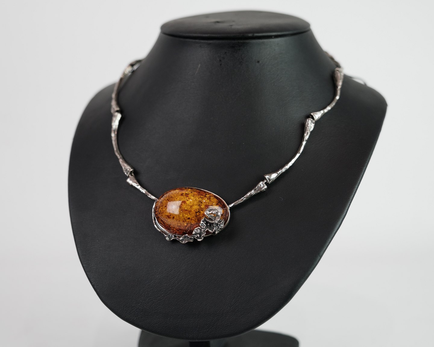 Hals collie i sølv med stor slebet rav klump prydet med sølv blomster