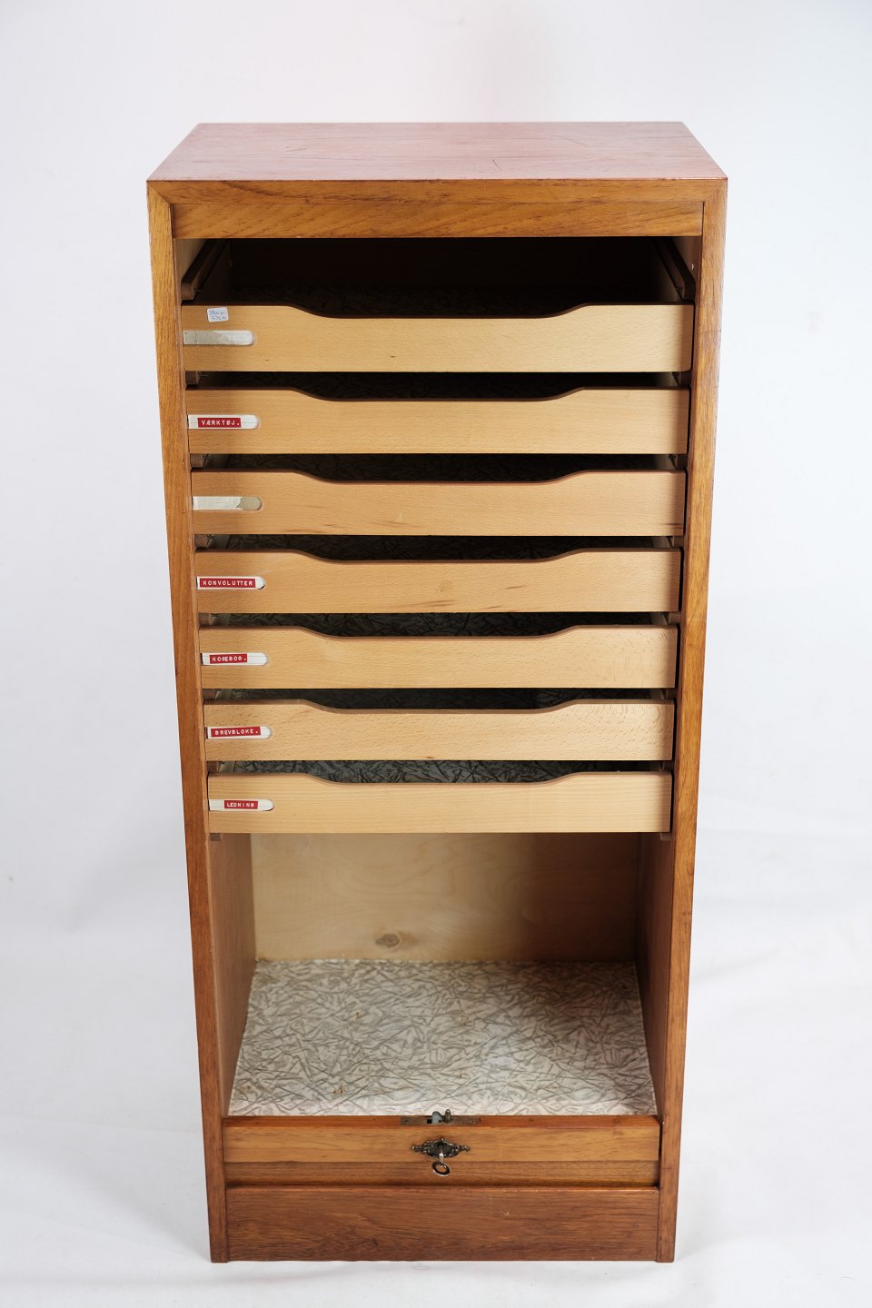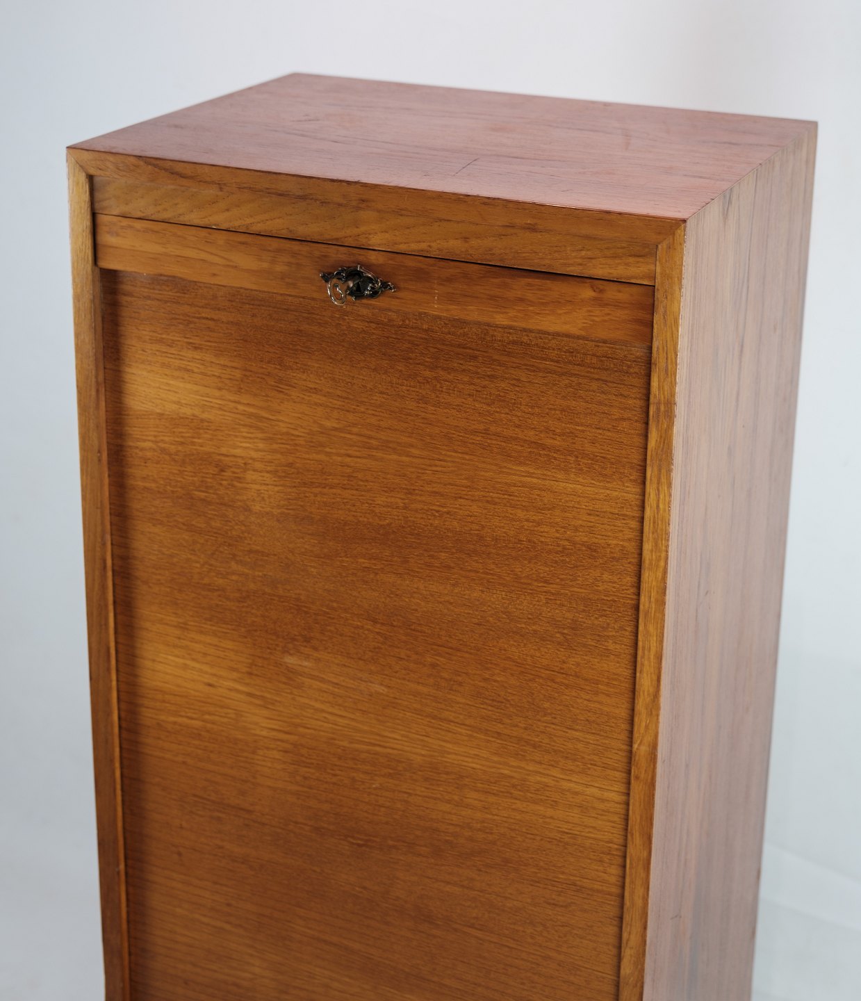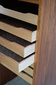 Jalousi skab med udtræksskuffer i teaktræ fra år 1960'erne. Står i meget fin brugt stand. Skabbet har i alt 7 skuffer, som kan tages ud og erstattes med hylder.