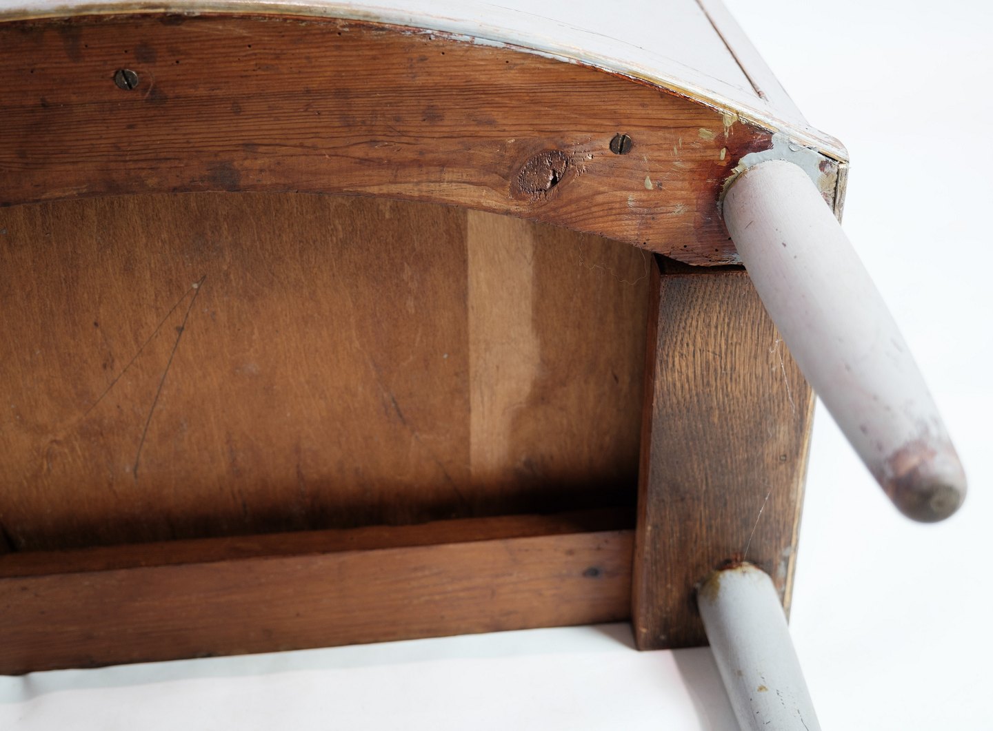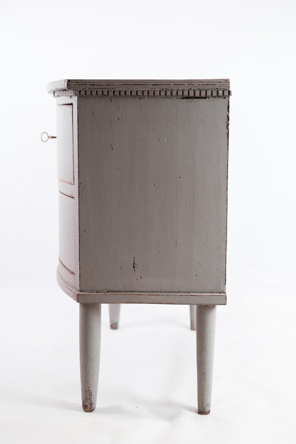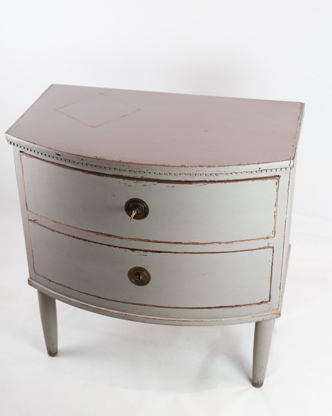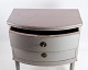 Gustaviansk kommede med to skuffer i gråmalet fra år 1890'erne. Kommoden kaldes en Københavner kommode, da den har en buede front. Den står i meget vintage god stand.