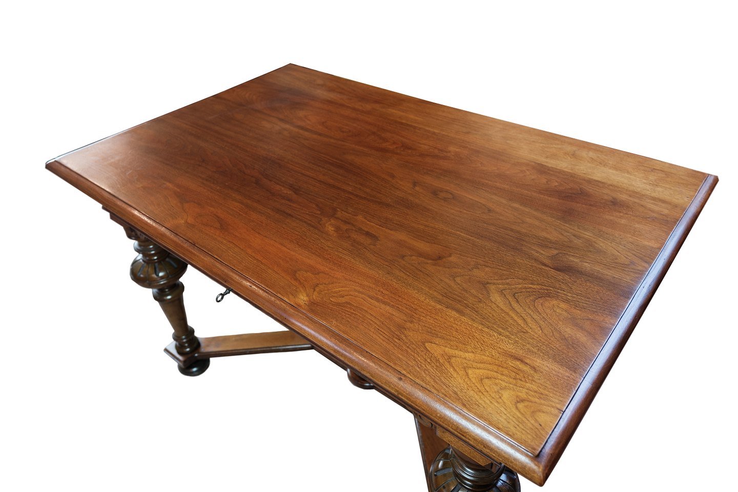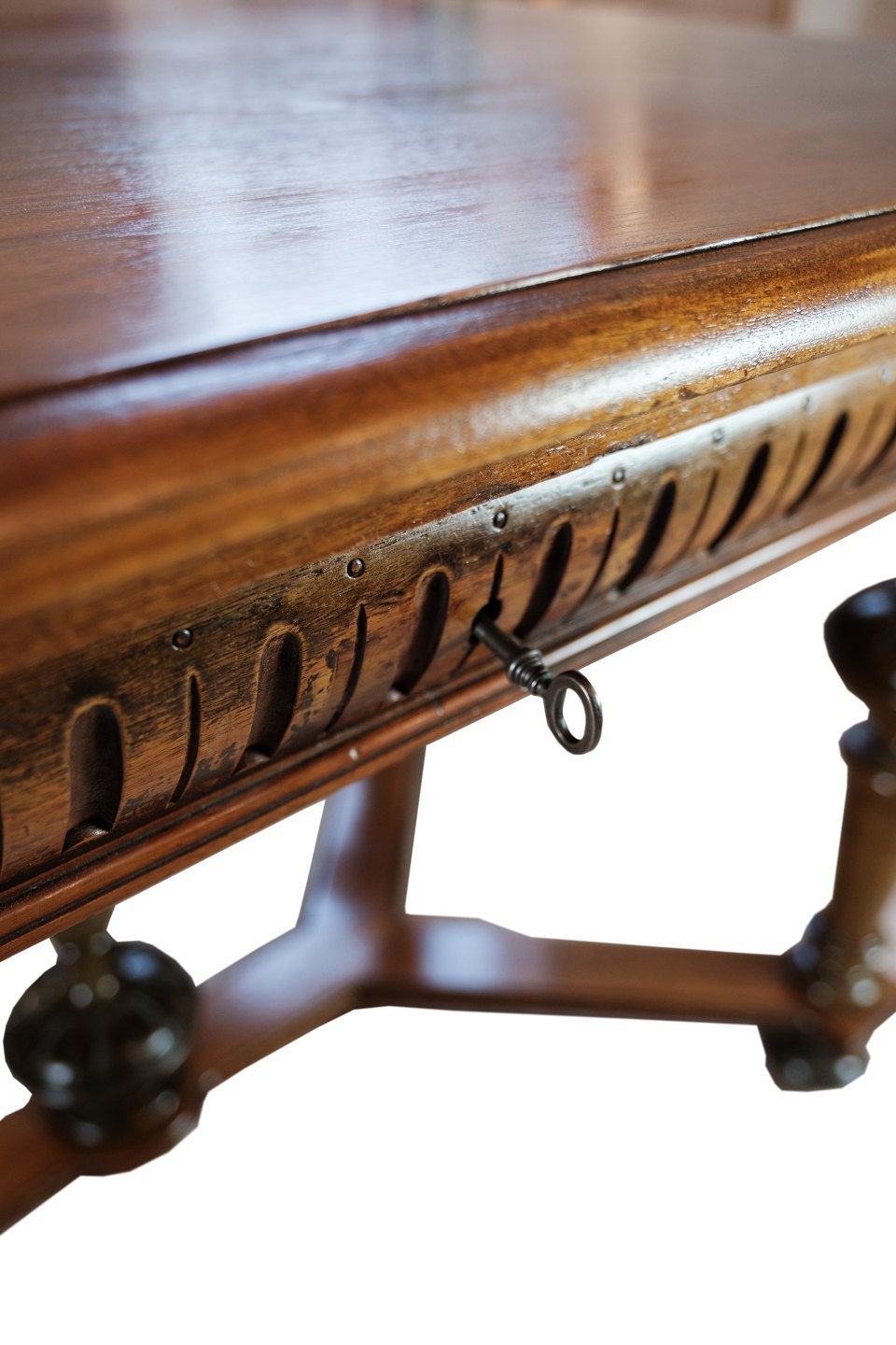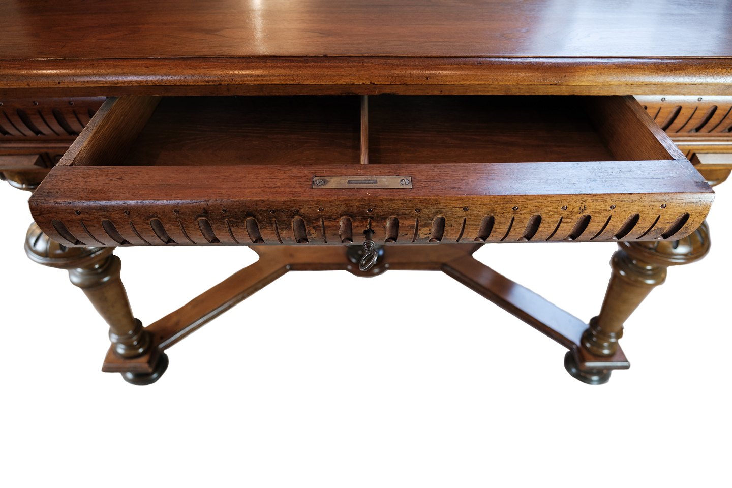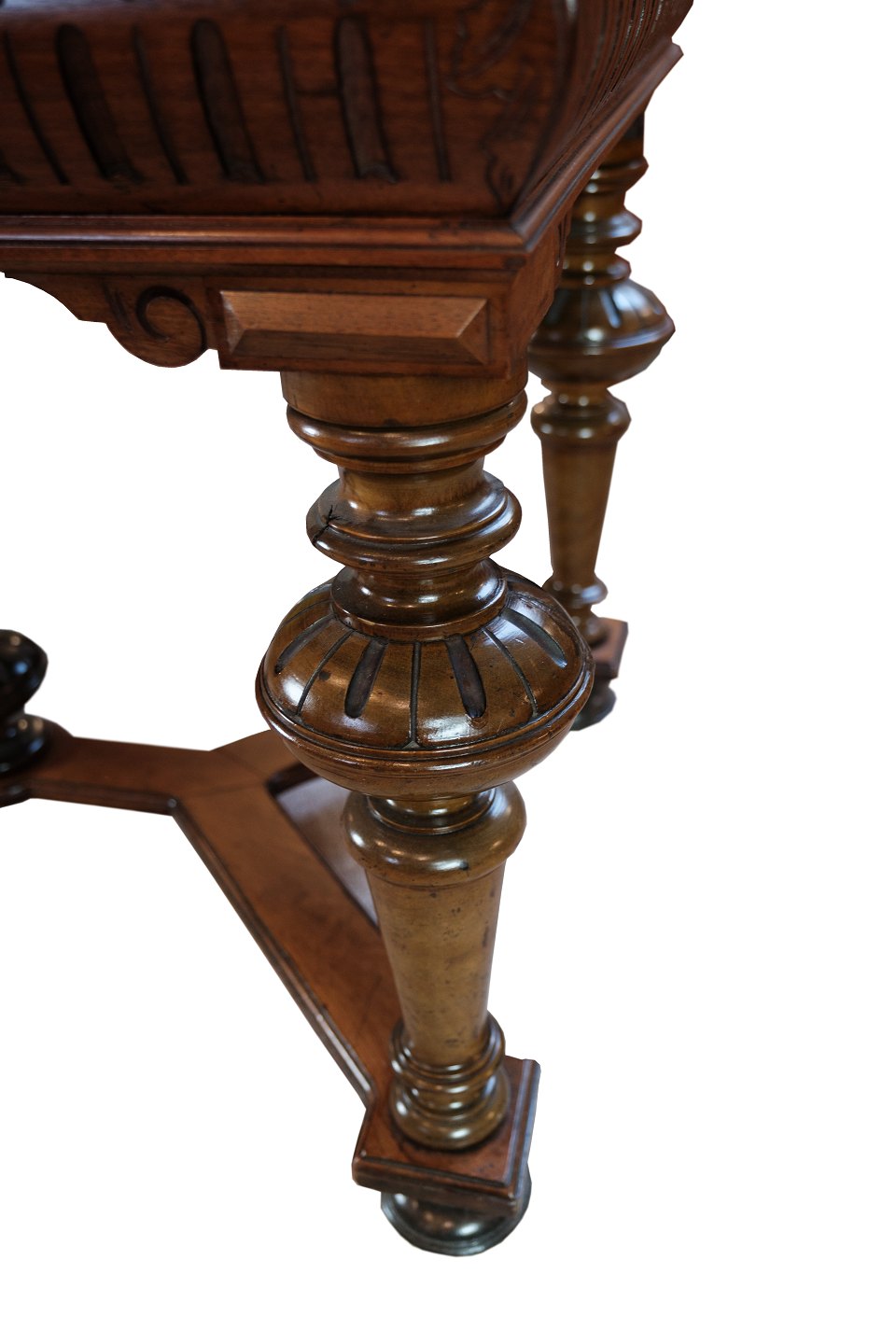 SolgtAnretterbord / skrivebord i valnød fra Danmark dekoreret med udskæringer fra år 1880'erne. Istandsat.