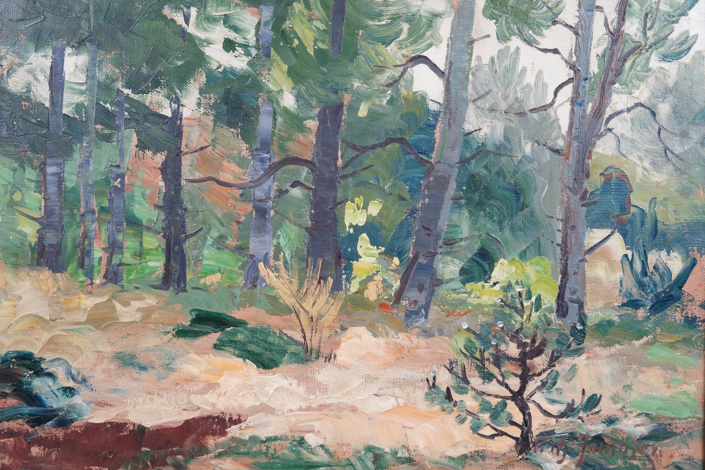 Oliemaleri lavet på lærredet med motiv af skov / træer fra omkring år 1940'erne. Står i meget fin brugt stand.