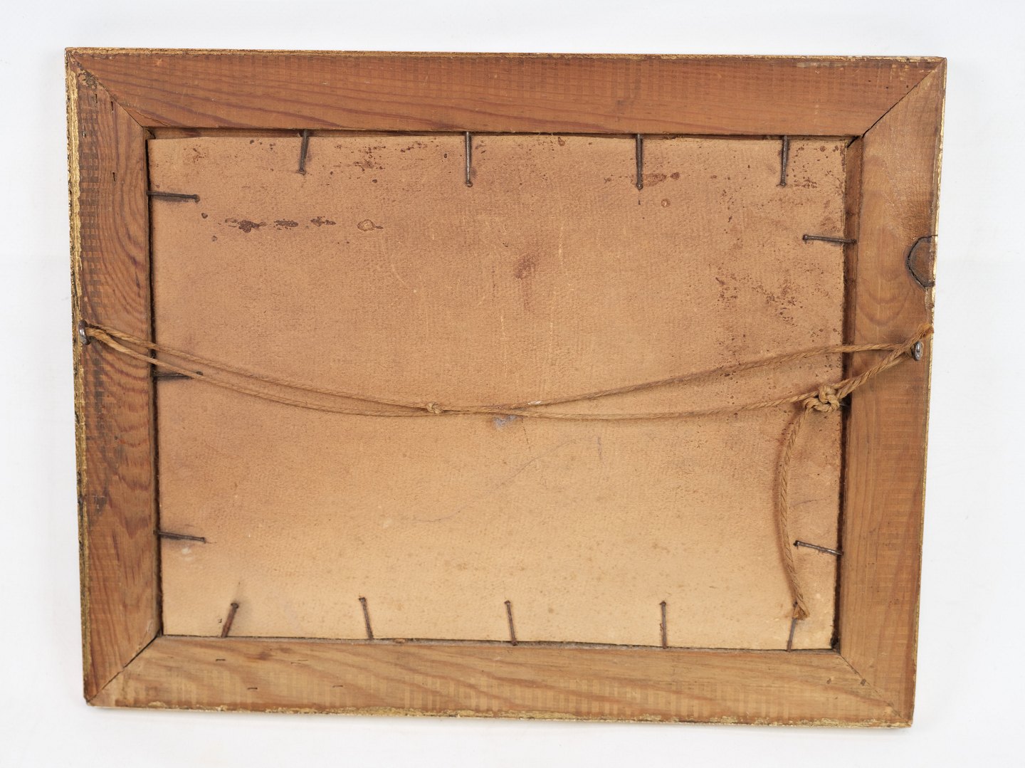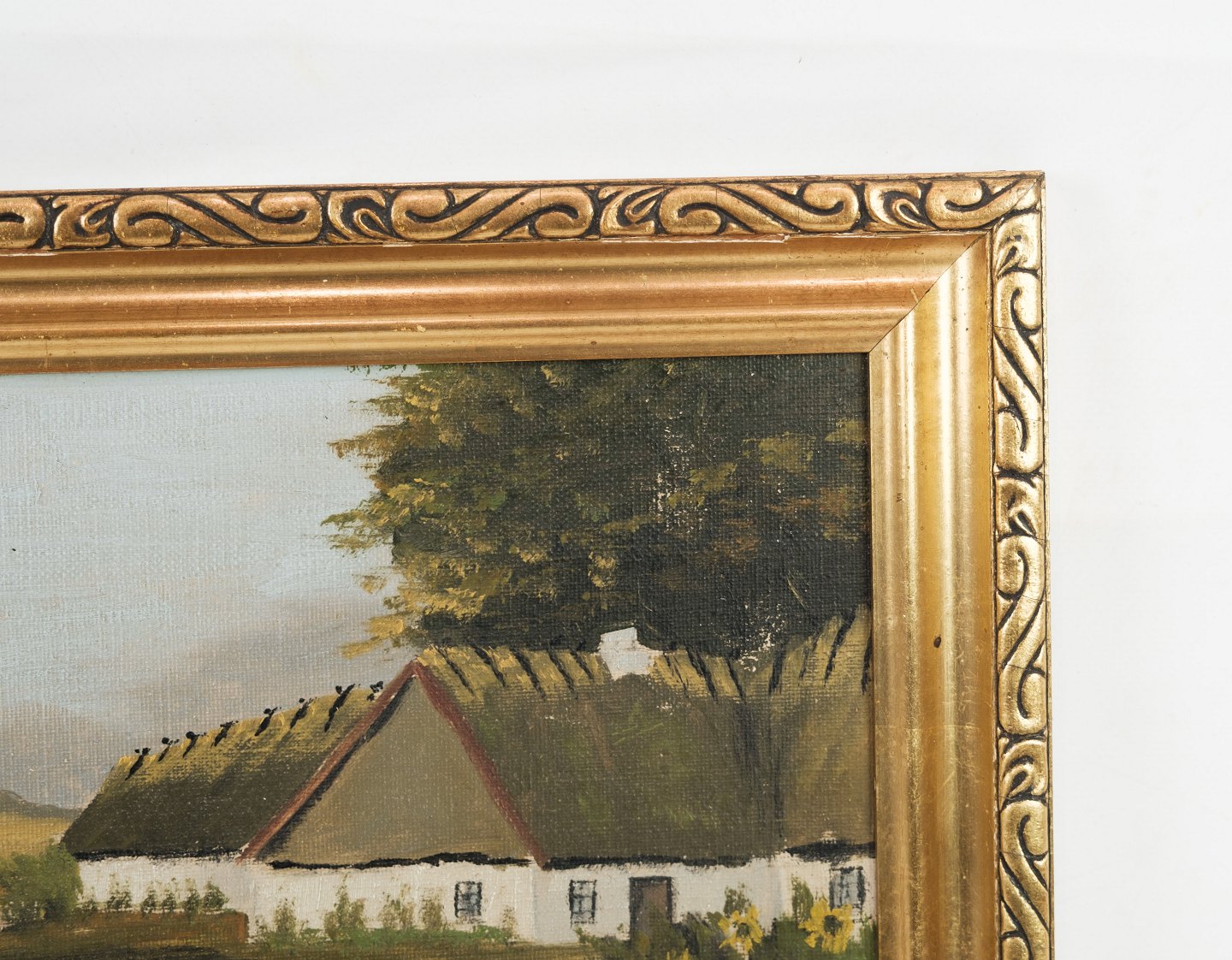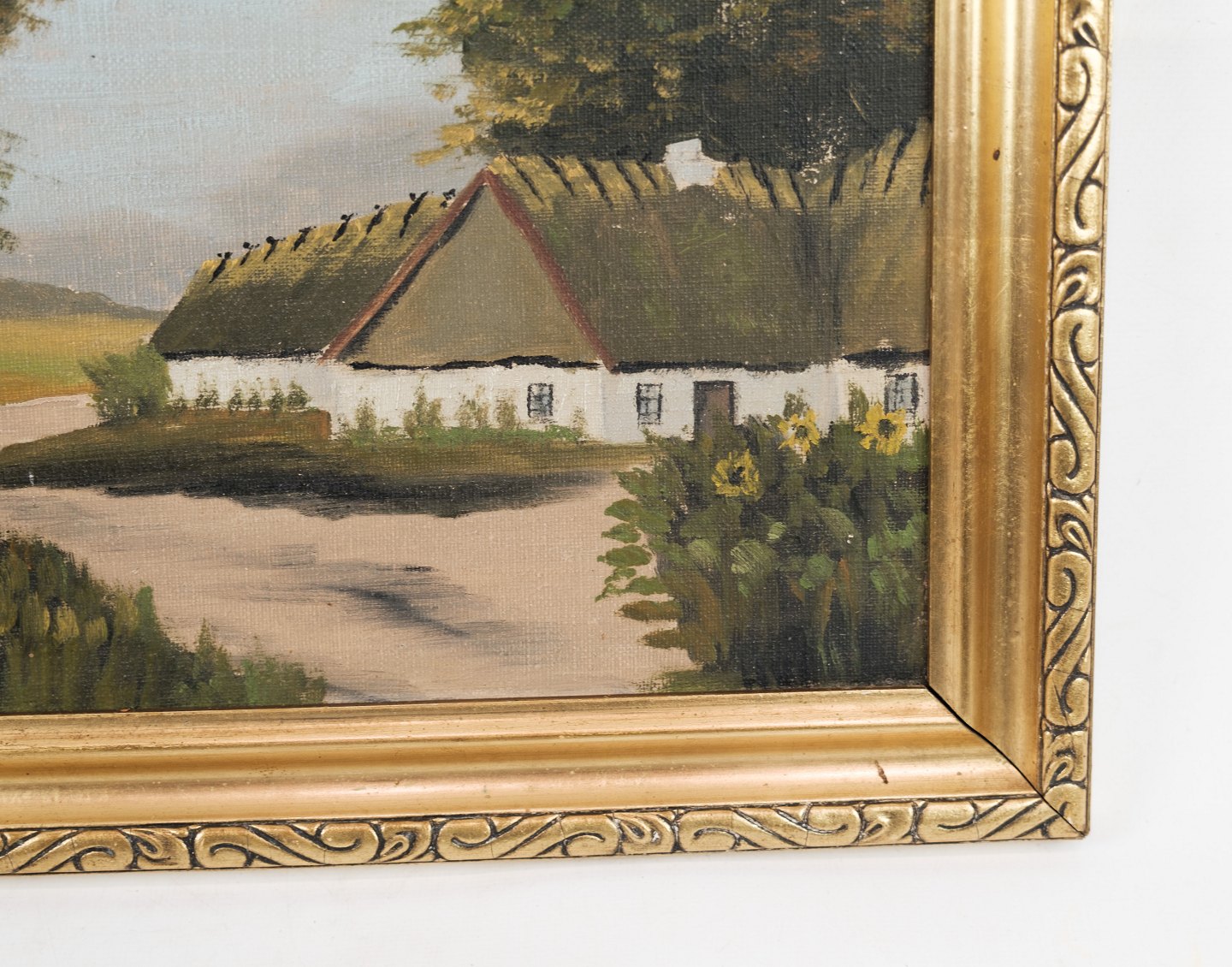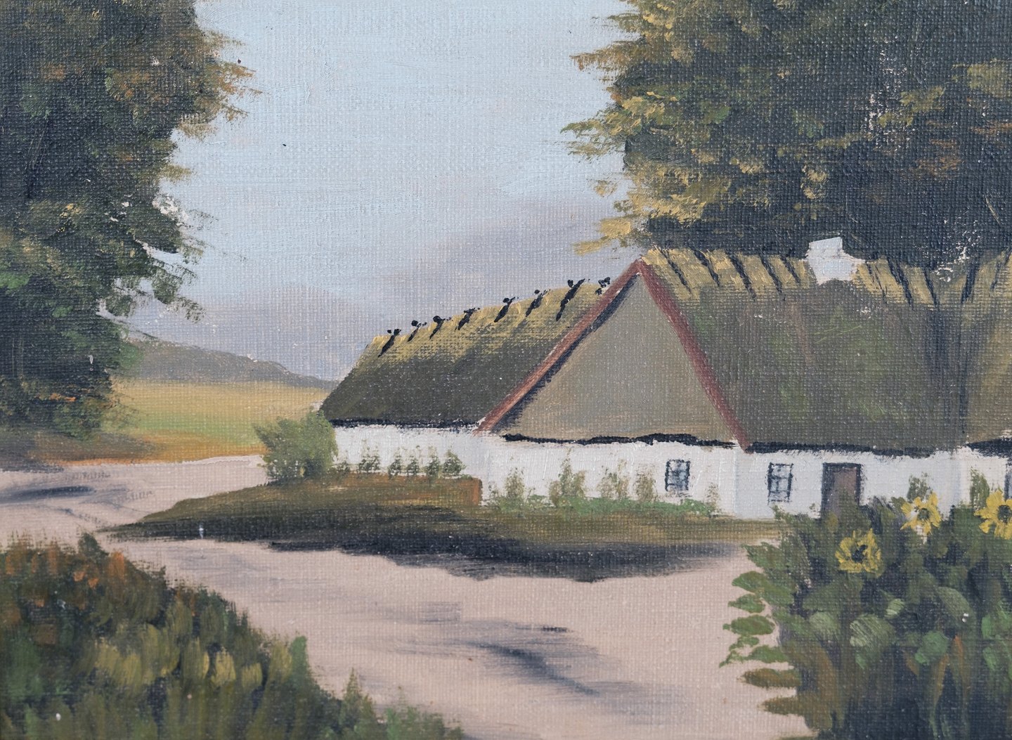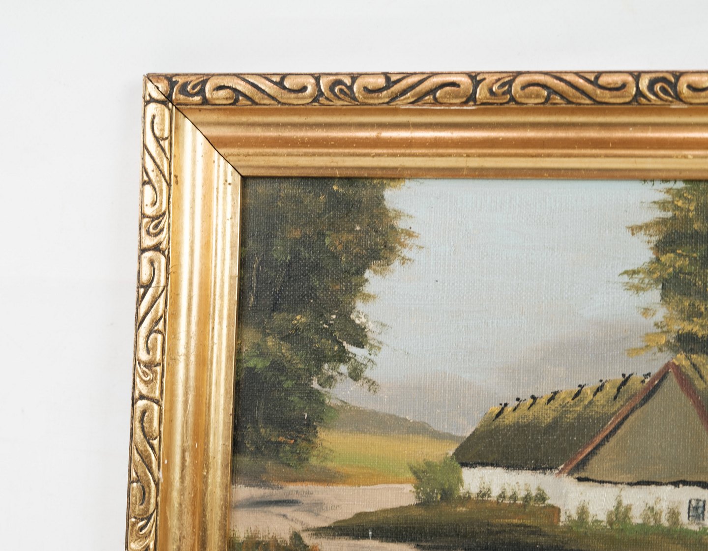 Oil painter of farmhouse in forest, painted on a wooden plate from around 1930s.