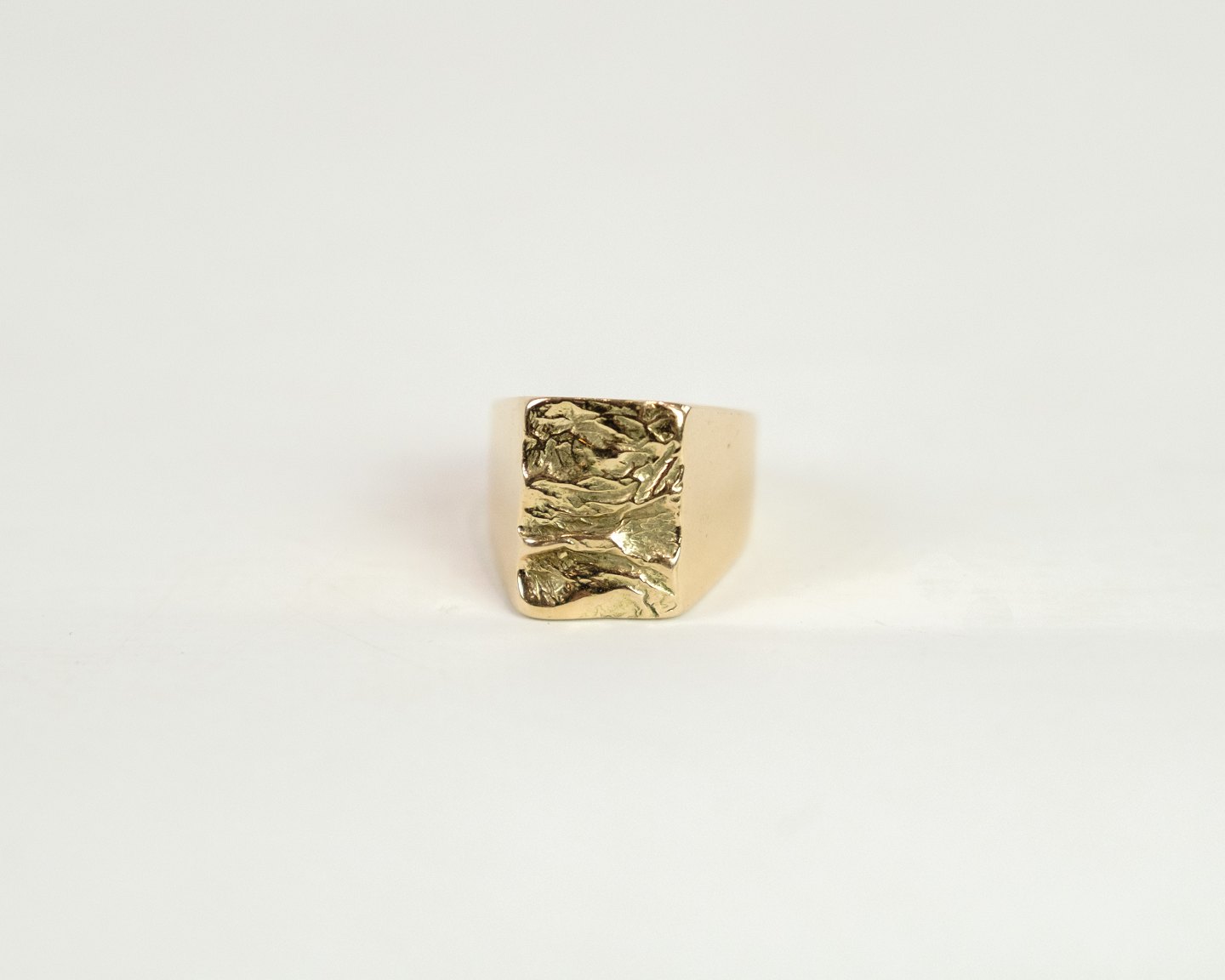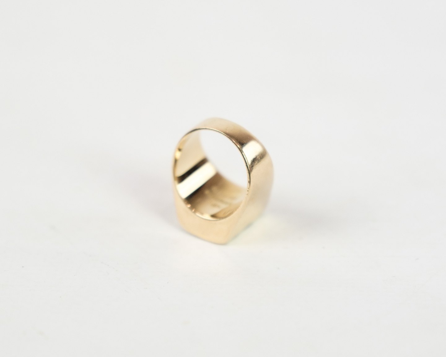 Sold14 carat handmade gold ring stamped H.Mann 585. Thick smooth ring rail with a perforated surface.