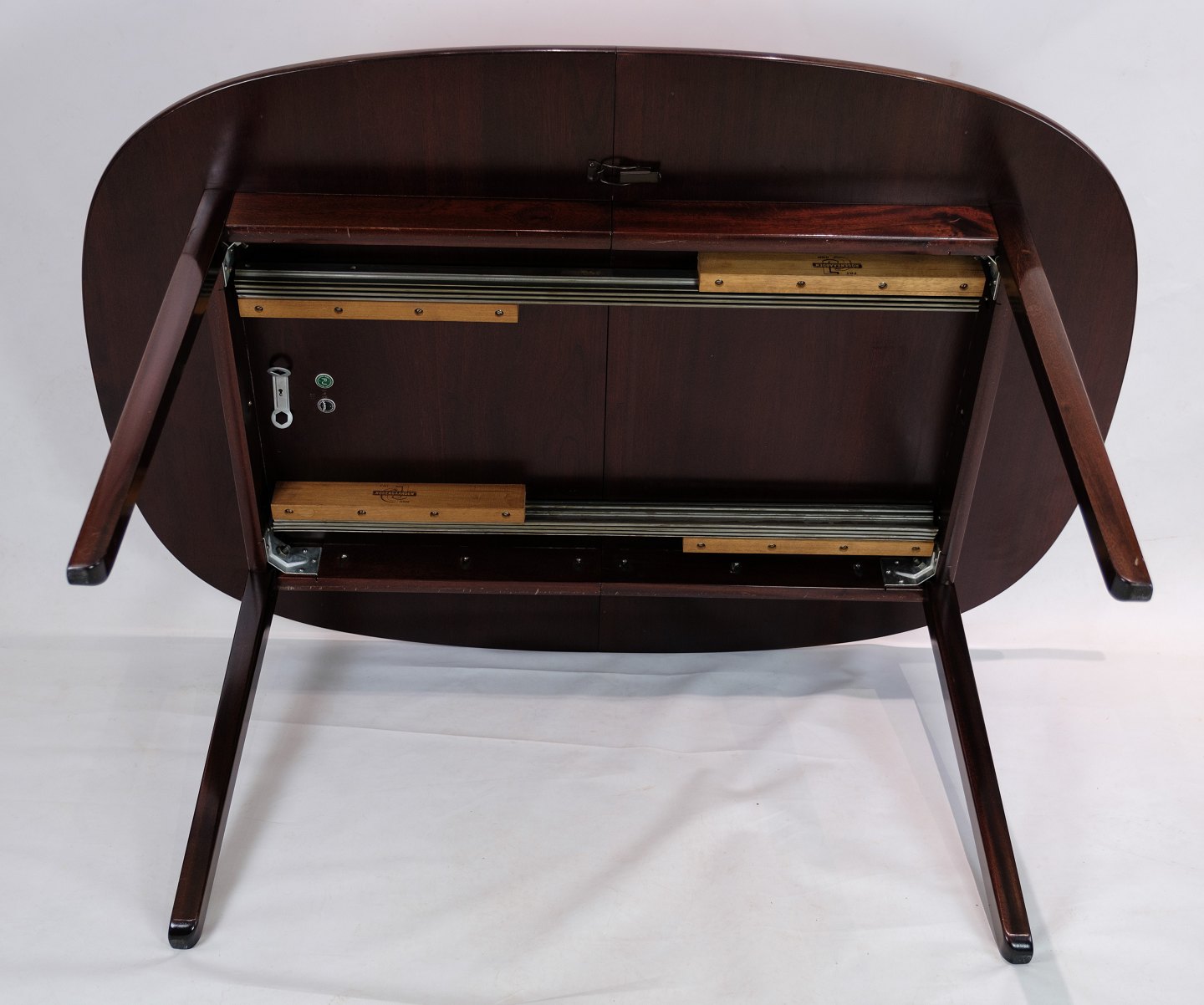 SolgtSpisebord af mørkt mahogni designet af Ole Wancher fremstillet hos P. Jeppesen. Et bord af meget høj kvalitet i god stand.