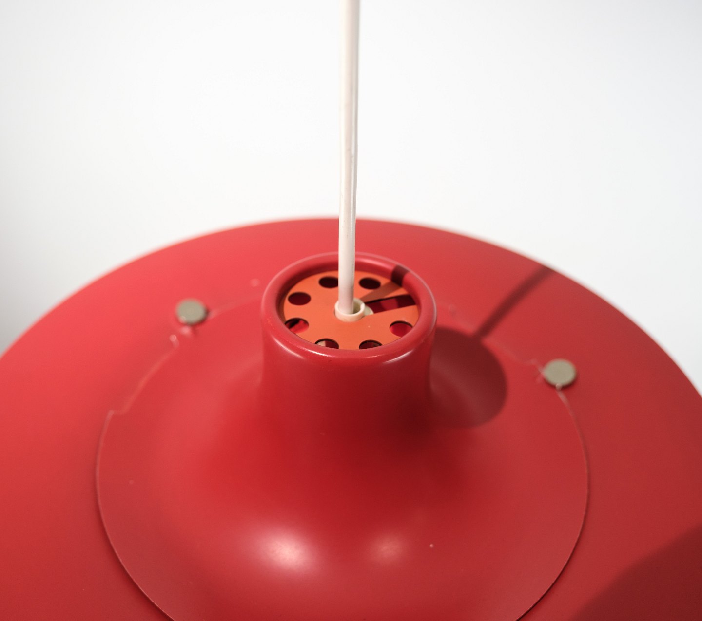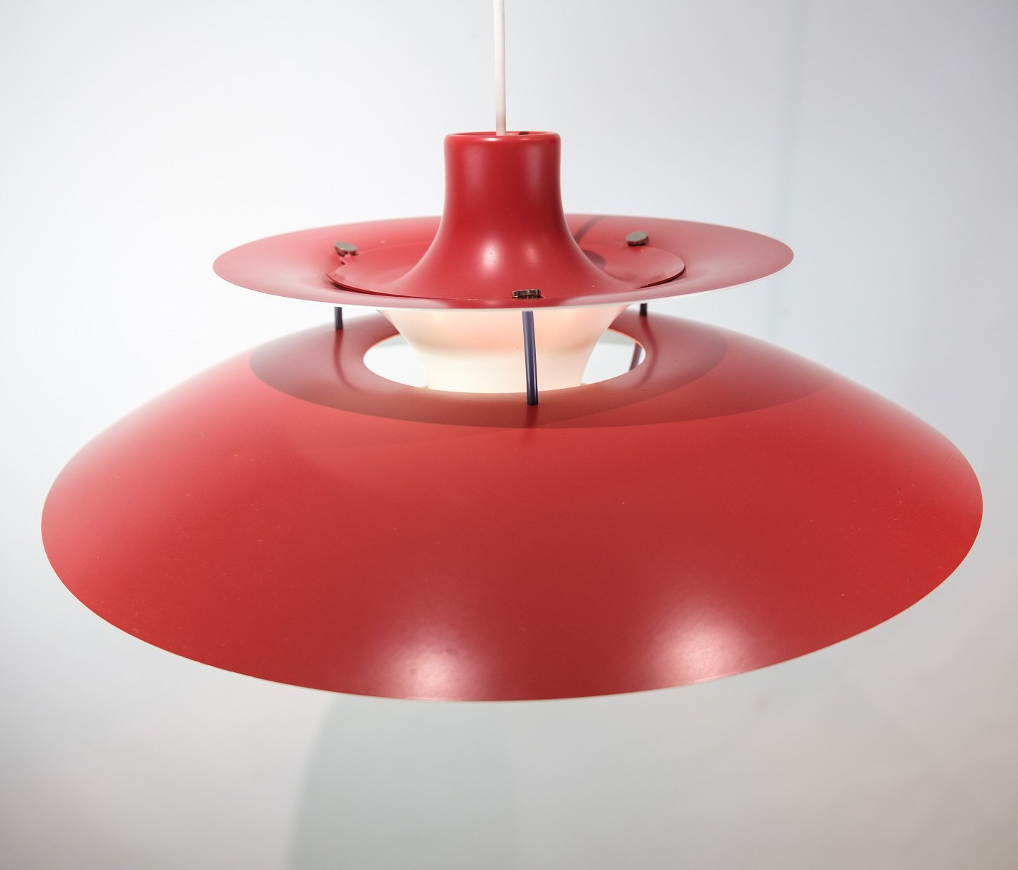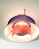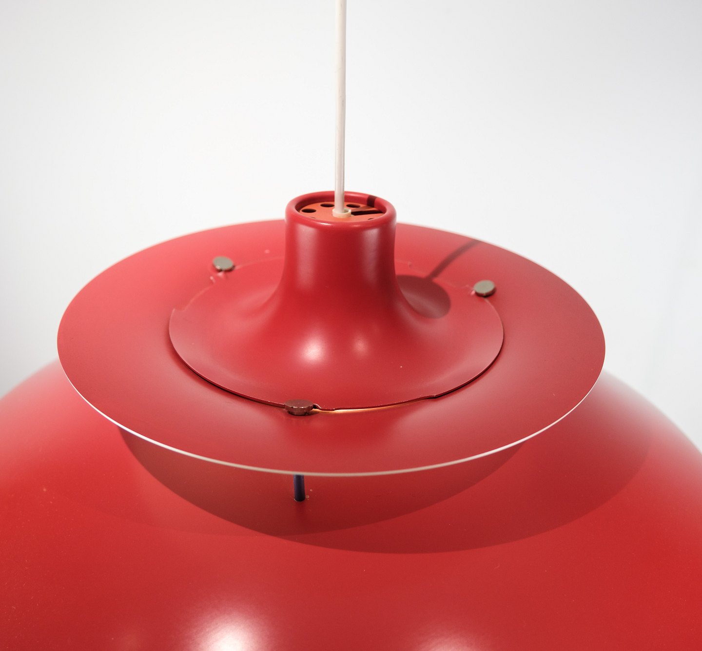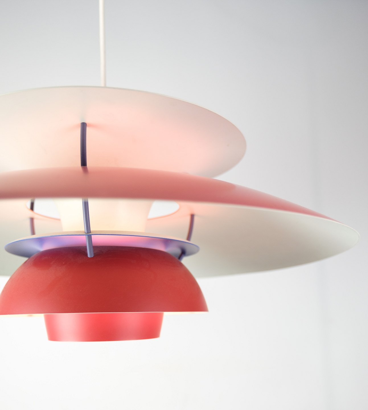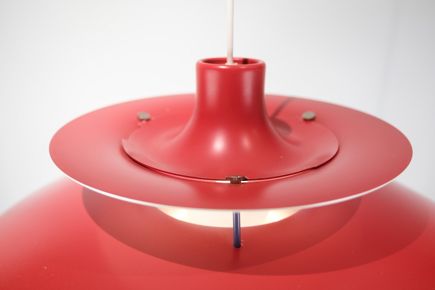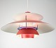Ceiling lamp, model PH5, designed by Poul Henningsen in 1958. The lamp is in the colors red and blue. The light source used is 75W E27. The material is Aluminum. It is in good used condition.