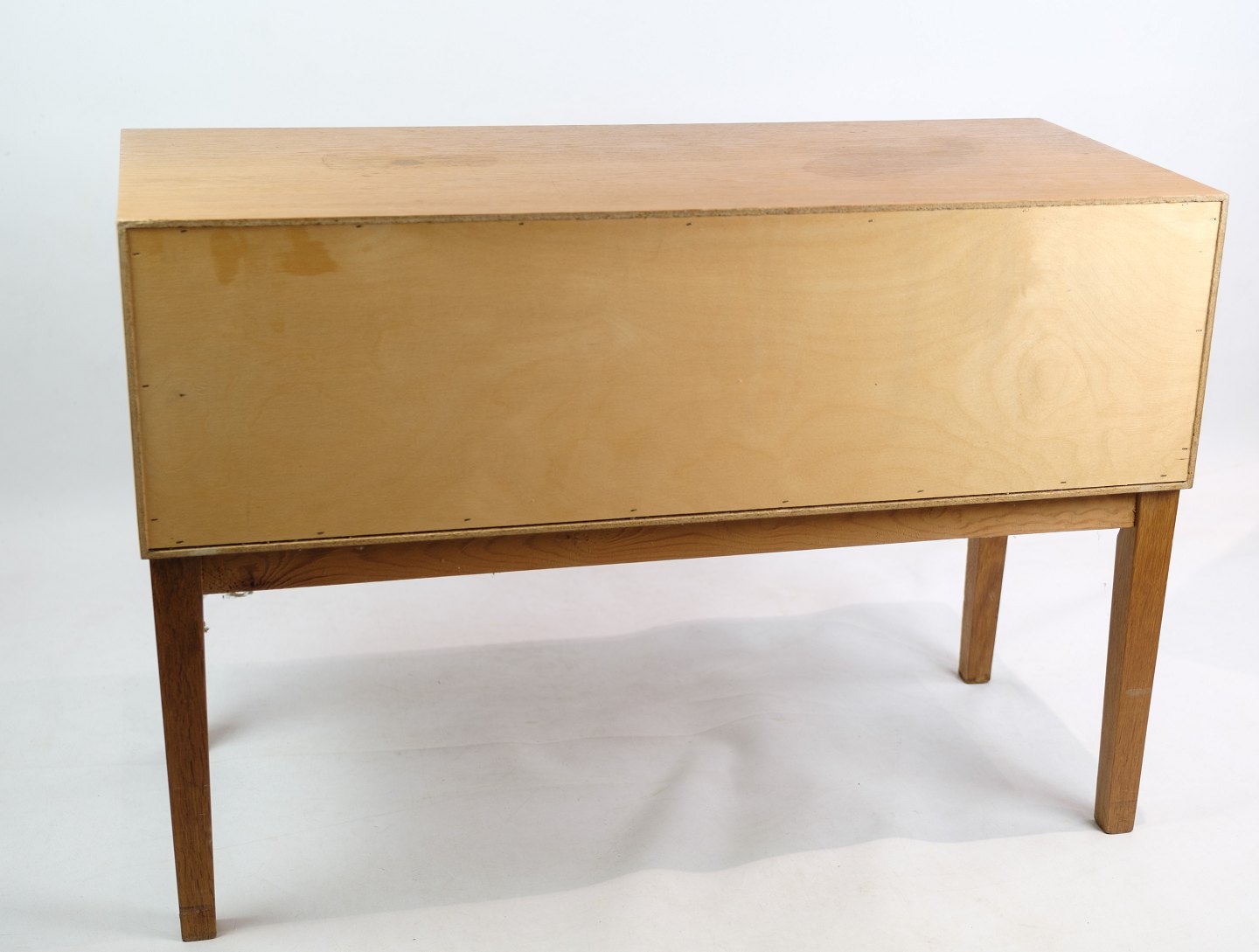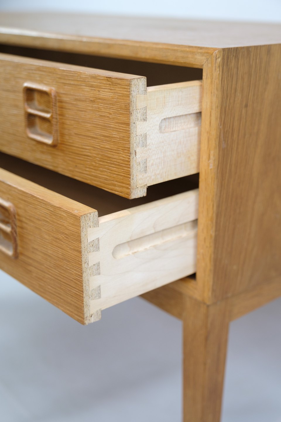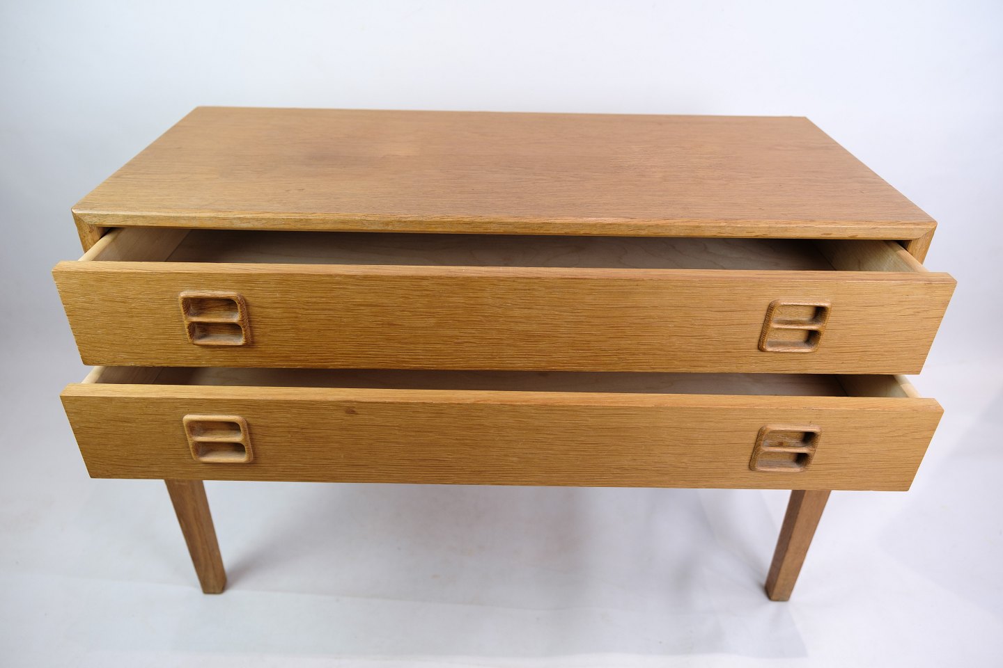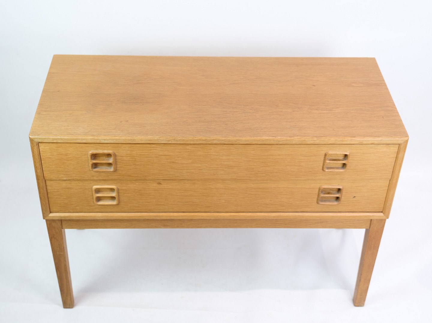 SoldOblong chest of drawers in oak with 2 drawers and wooden handles of Danish furniture design from around the 1960s. The furniture appears in very fine used condition and is well suited to be both entrance furniture, as well as storage furniture.