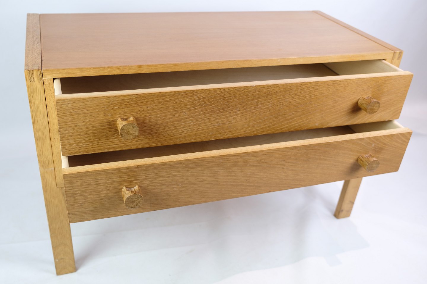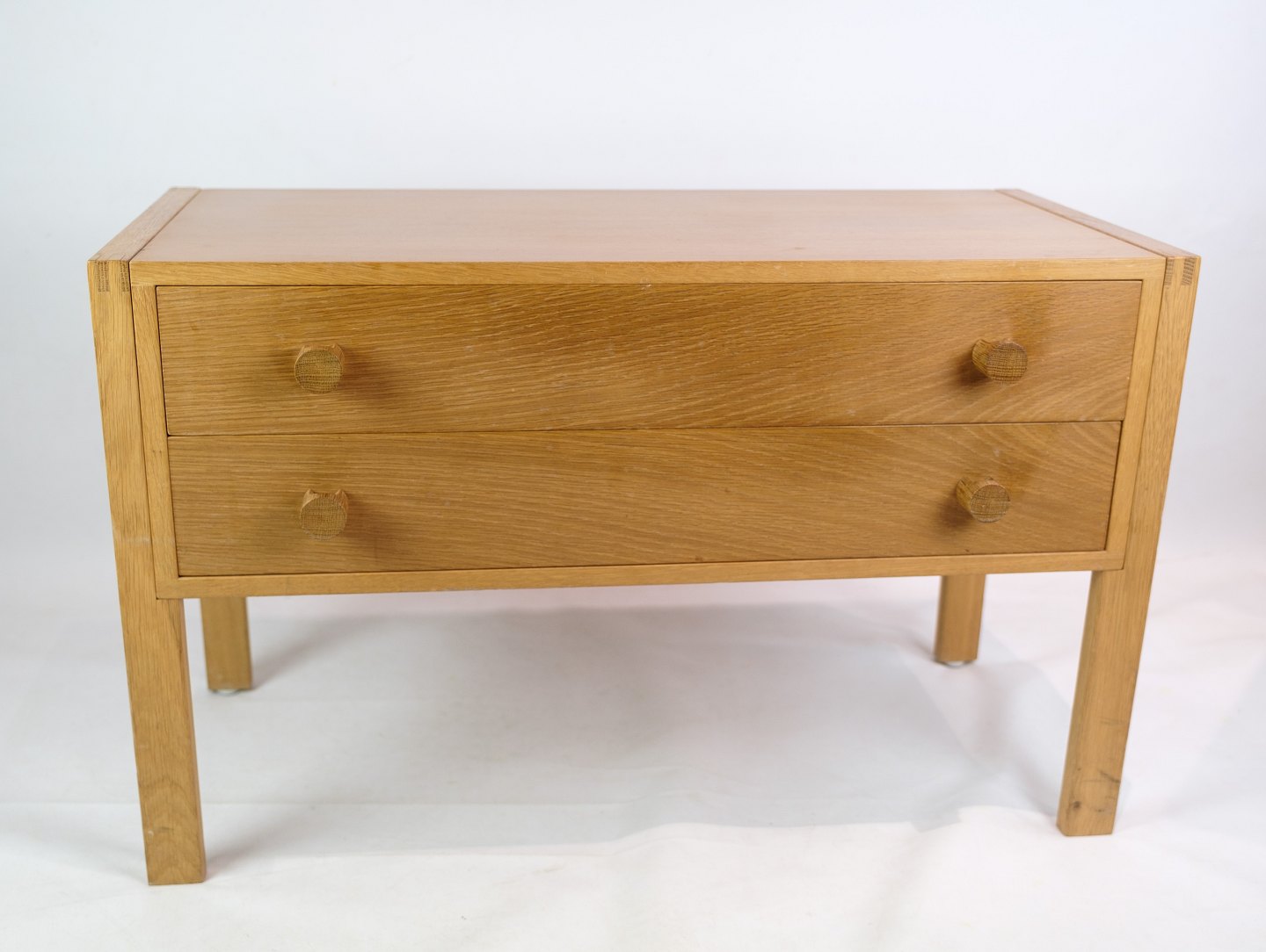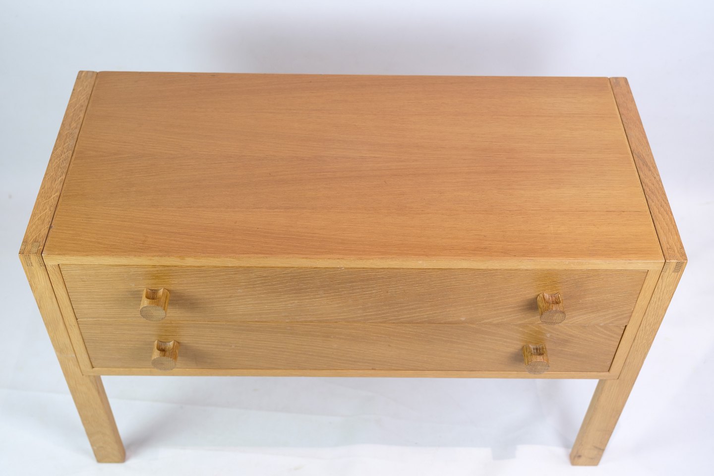 Oblong chest of drawers in oak with 2 drawers and wooden handles of Danish furniture design from around the 1960s. The furniture appears in very fine used condition and is well suited to be both entrance furniture, as well as storage furniture.