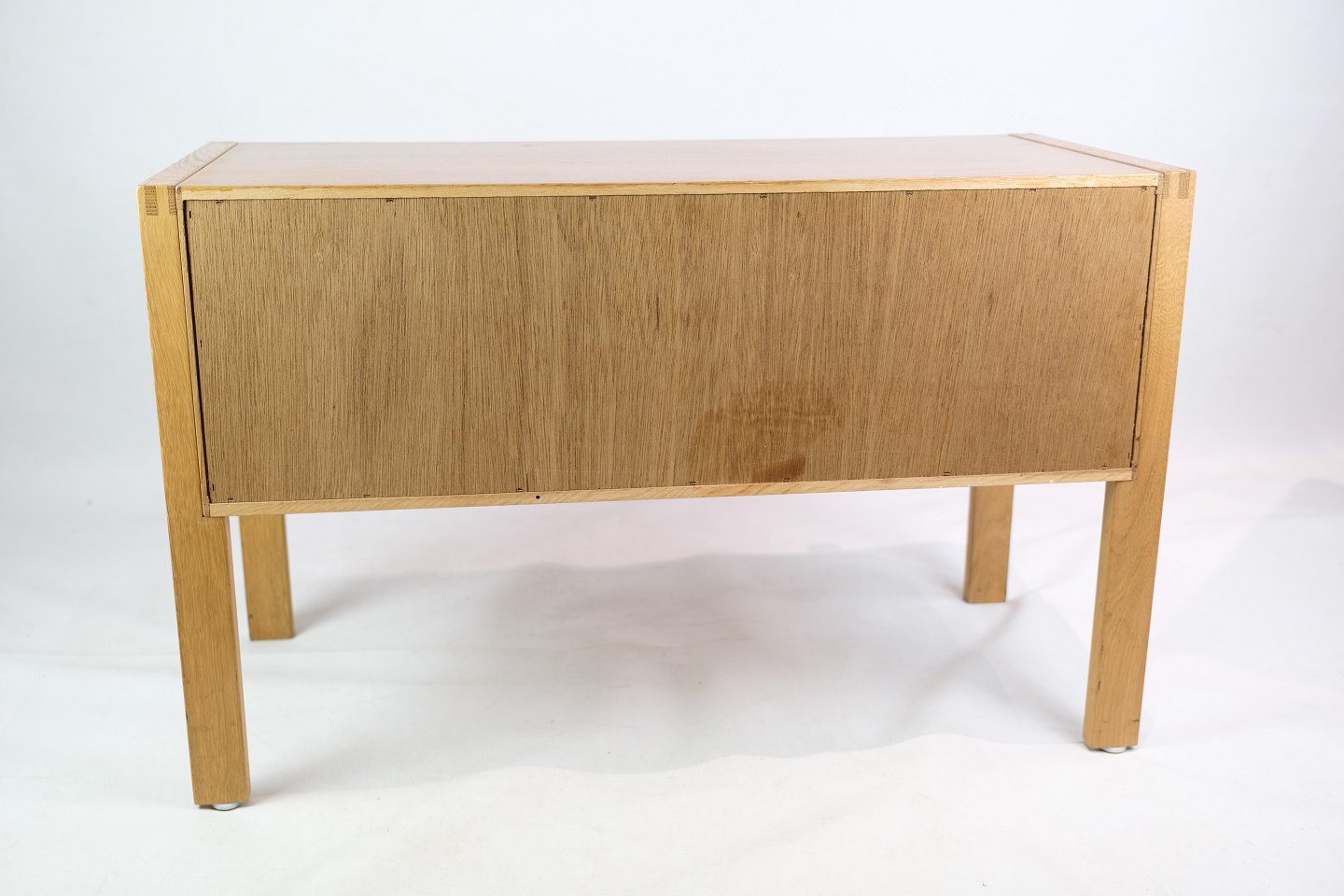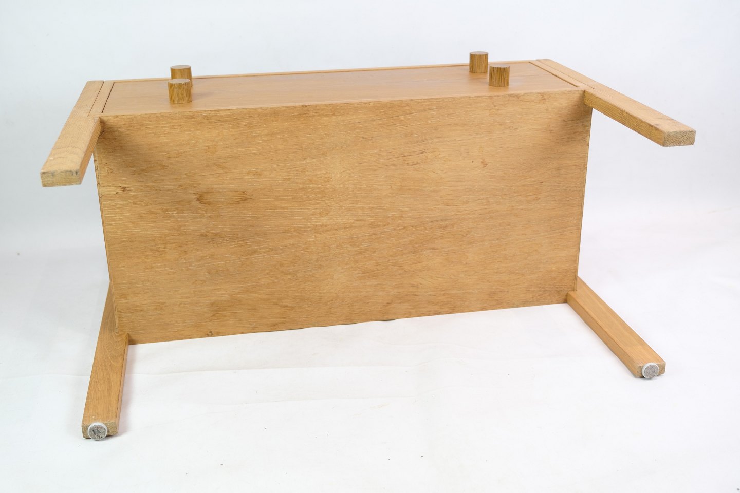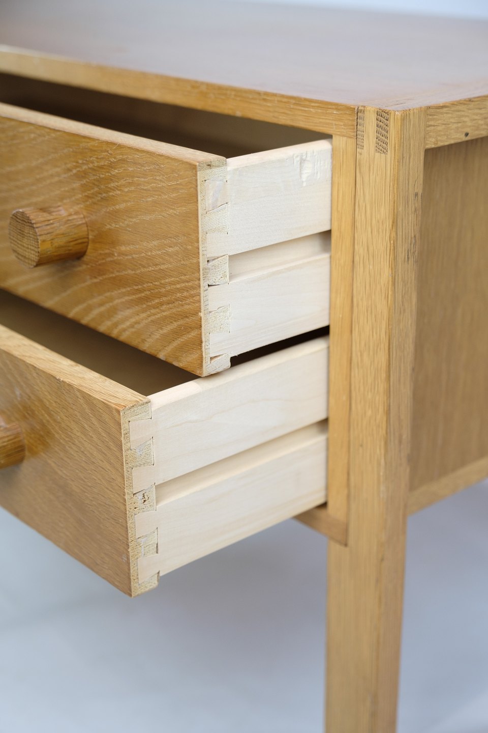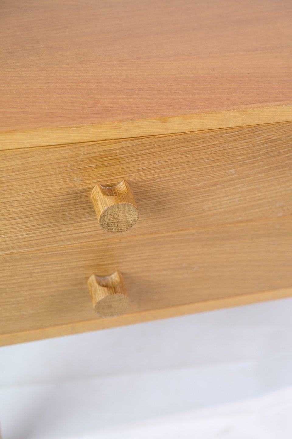 Oblong chest of drawers in oak with 2 drawers and wooden handles of Danish furniture design from around the 1960s. The furniture appears in very fine used condition and is well suited to be both entrance furniture, as well as storage furniture.