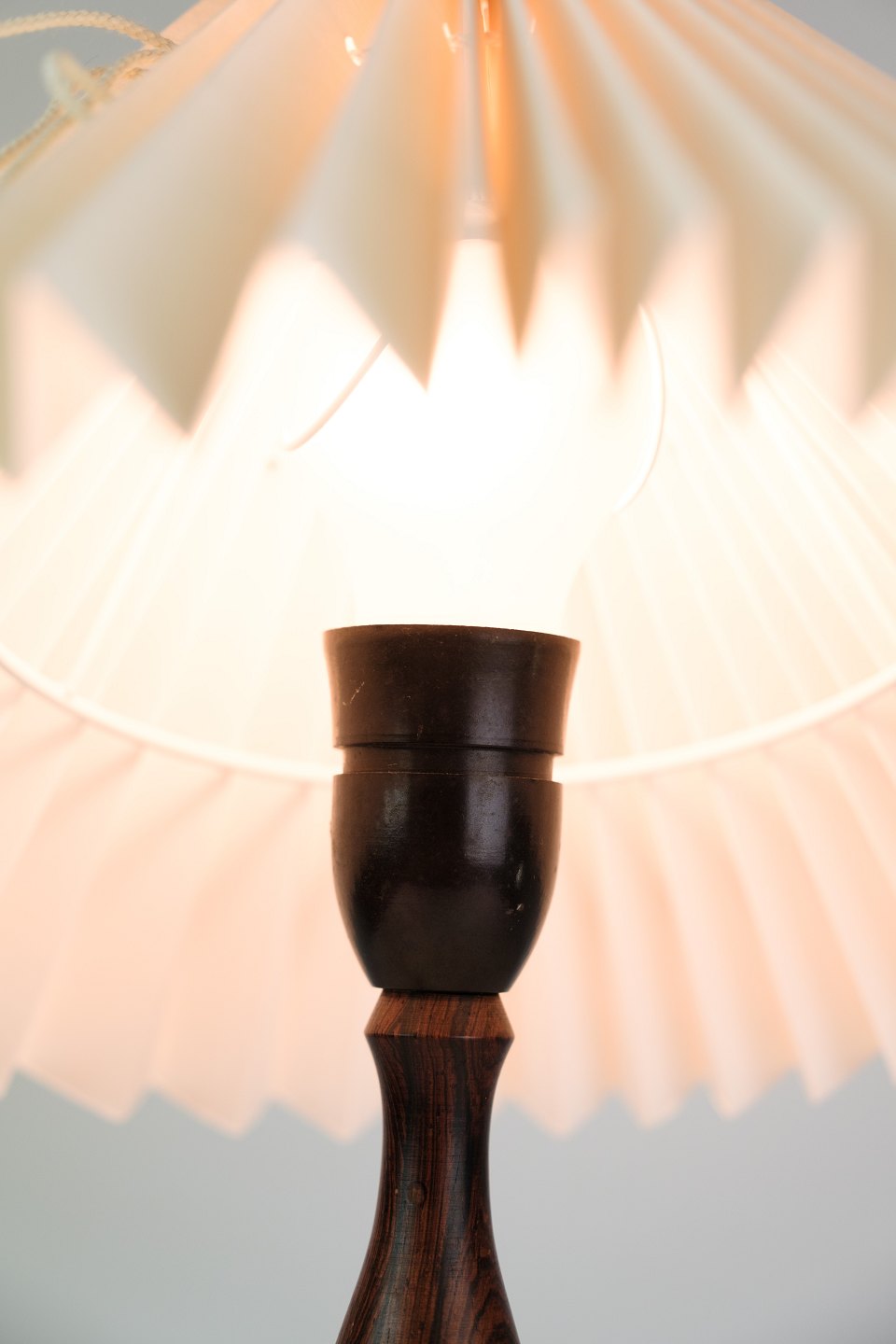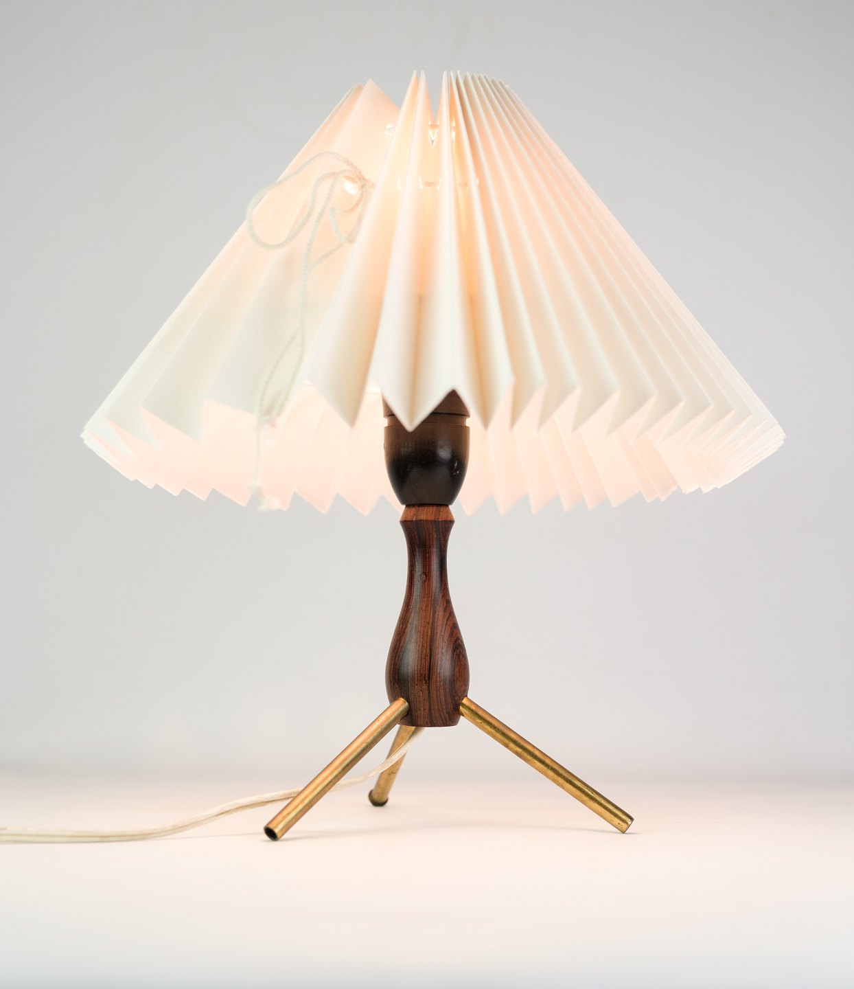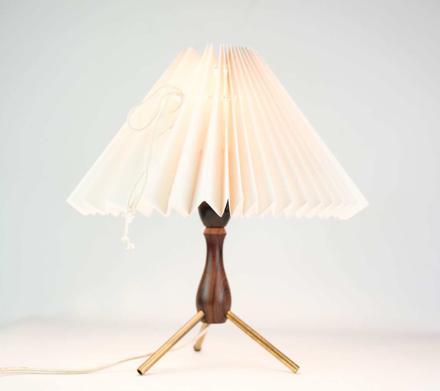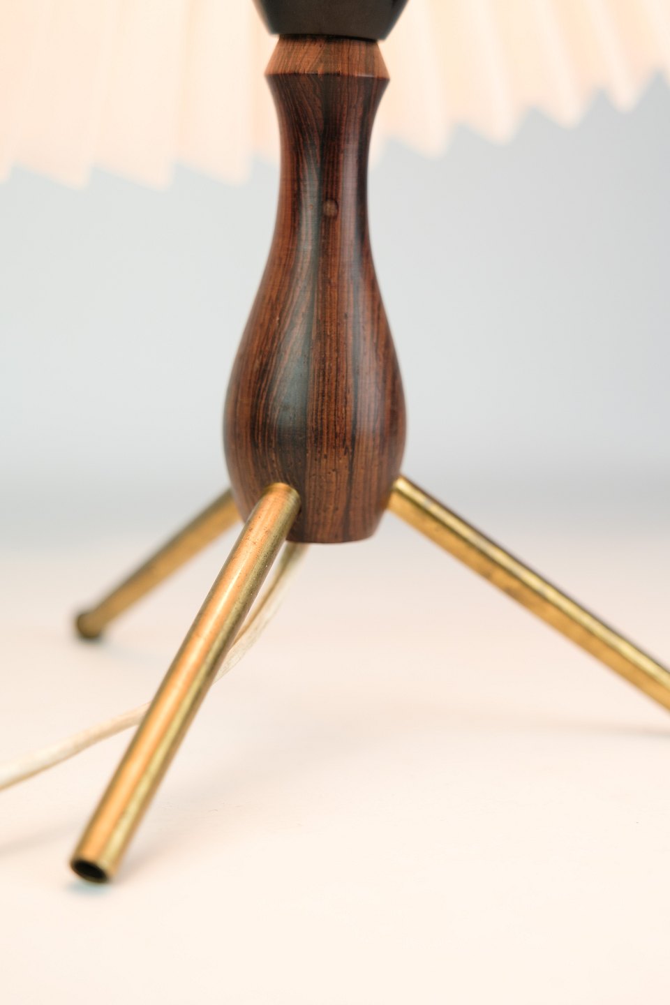 SoldThree-legged table lamp in rosewood of Danish design with brass legs from around the 1960s. Lamp has an incredibly beautiful lampshade. Overall a lamp of very high quality