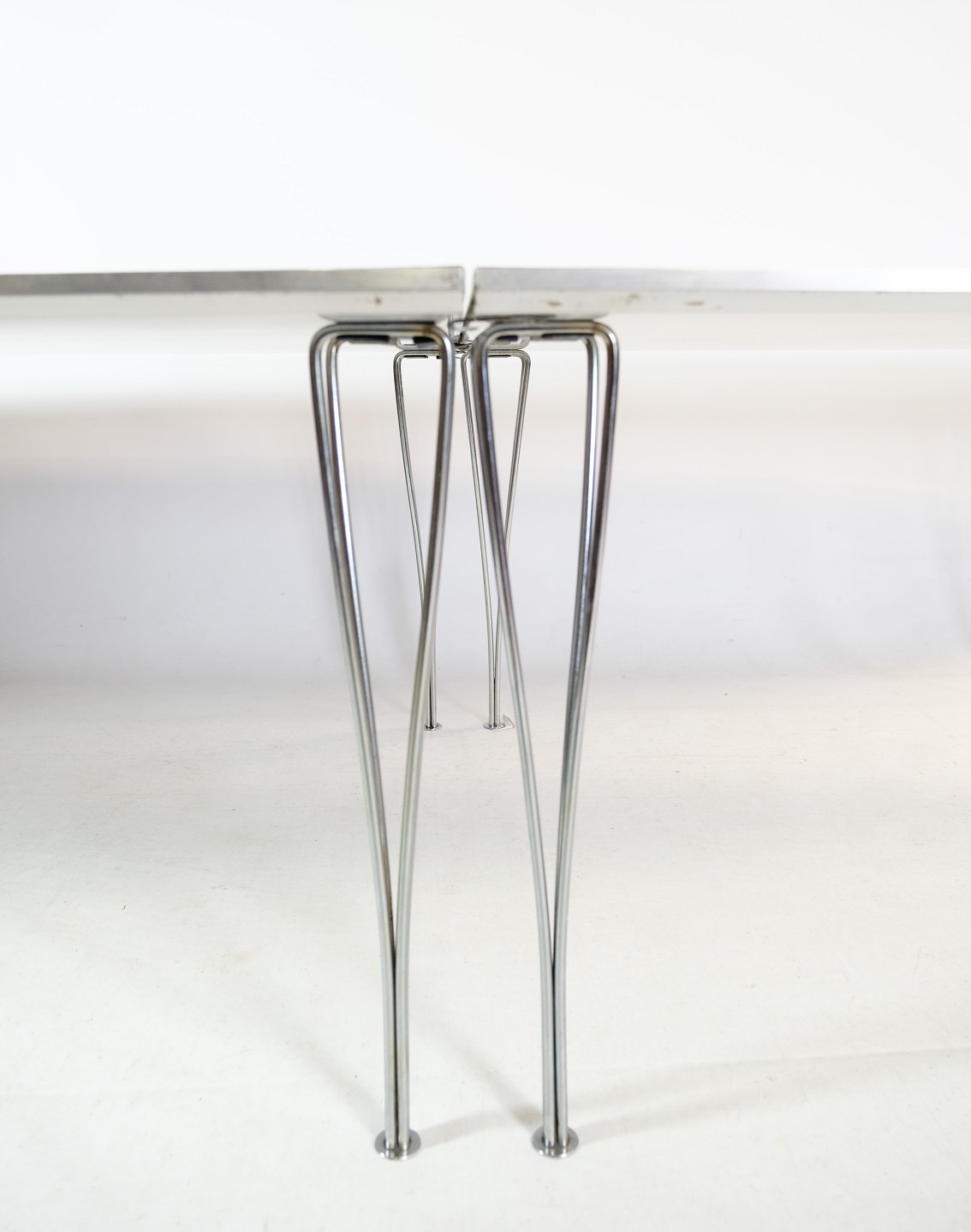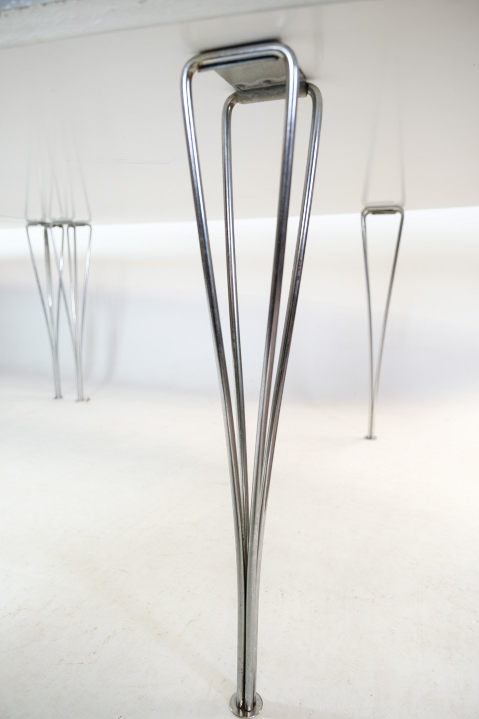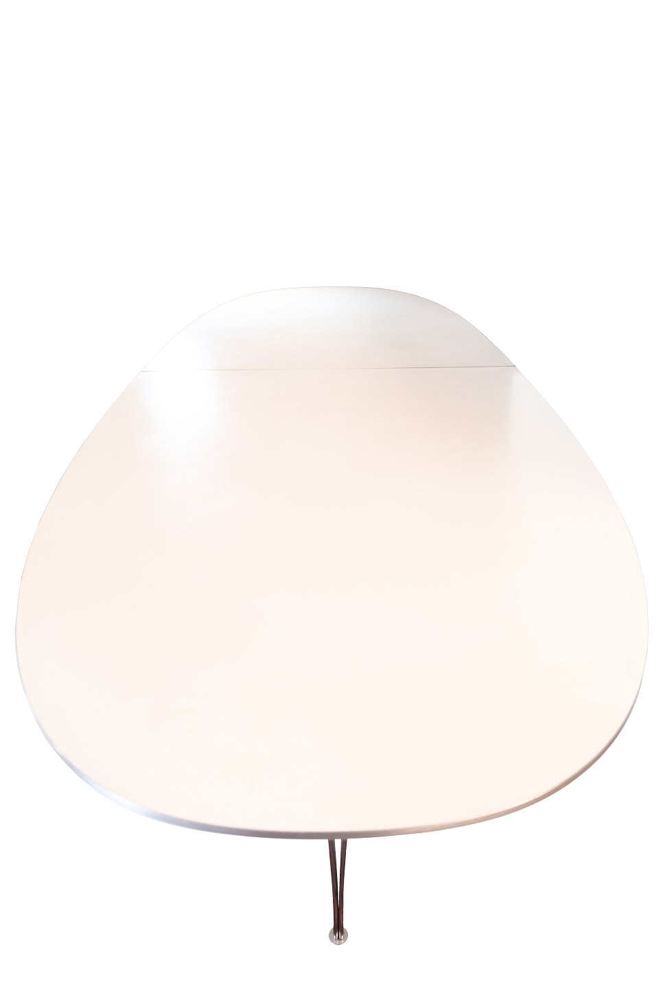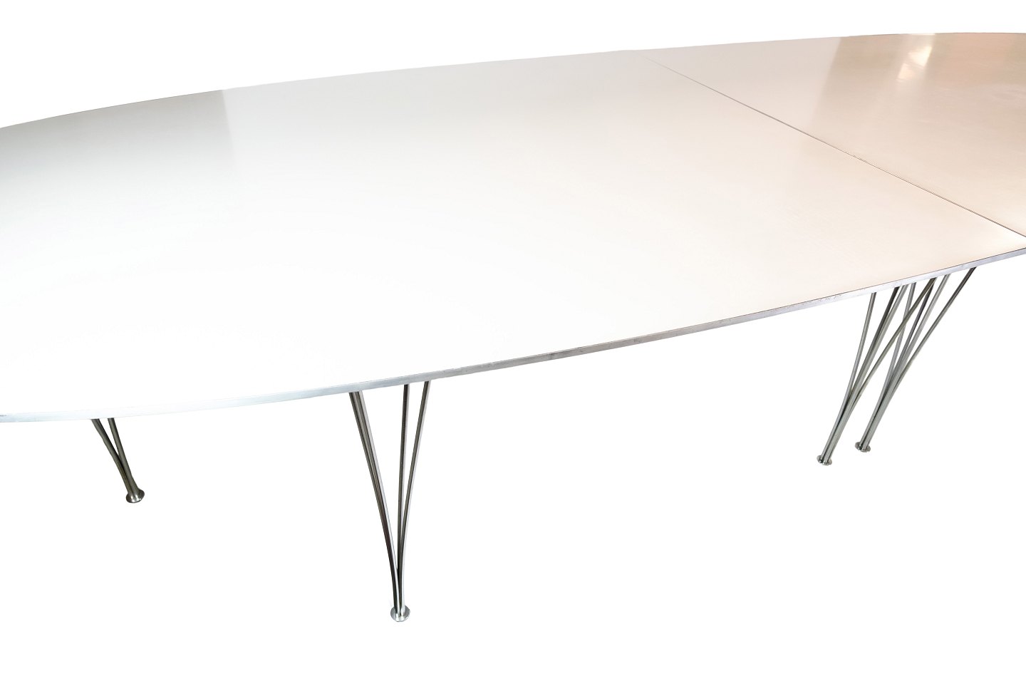 SoldSuper Ellipse conference table with white laminate and aluminum edge, designed by Piet Hein & Bruno Mathsson manufactured by Fritz Hansen in 1979. The table has eight legs of chromed steel, appears in very fine used condition and will be inspected in a workshop before sale.