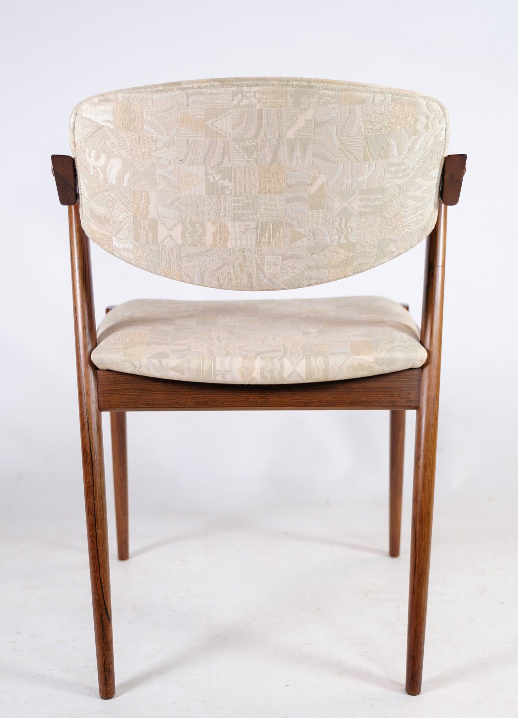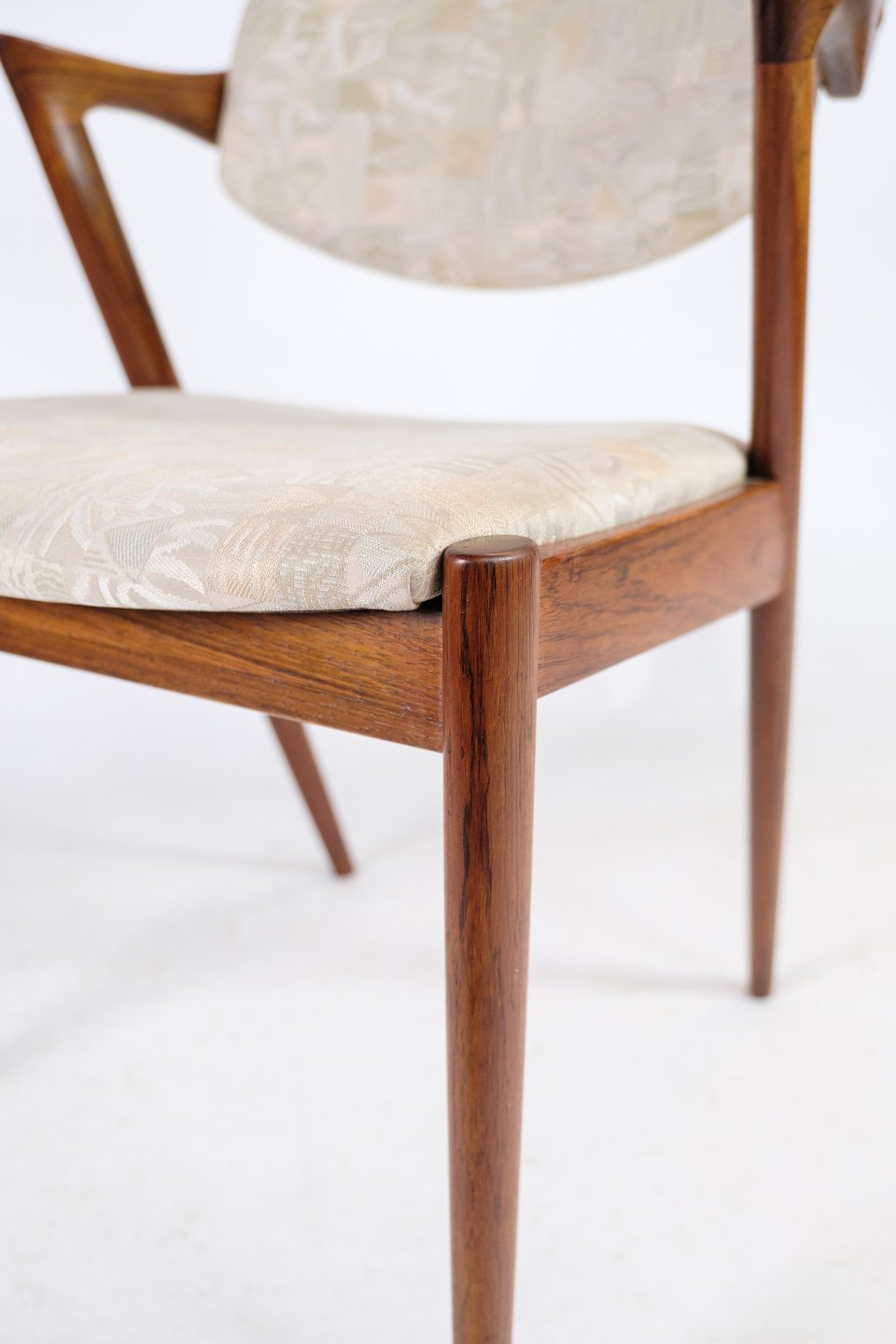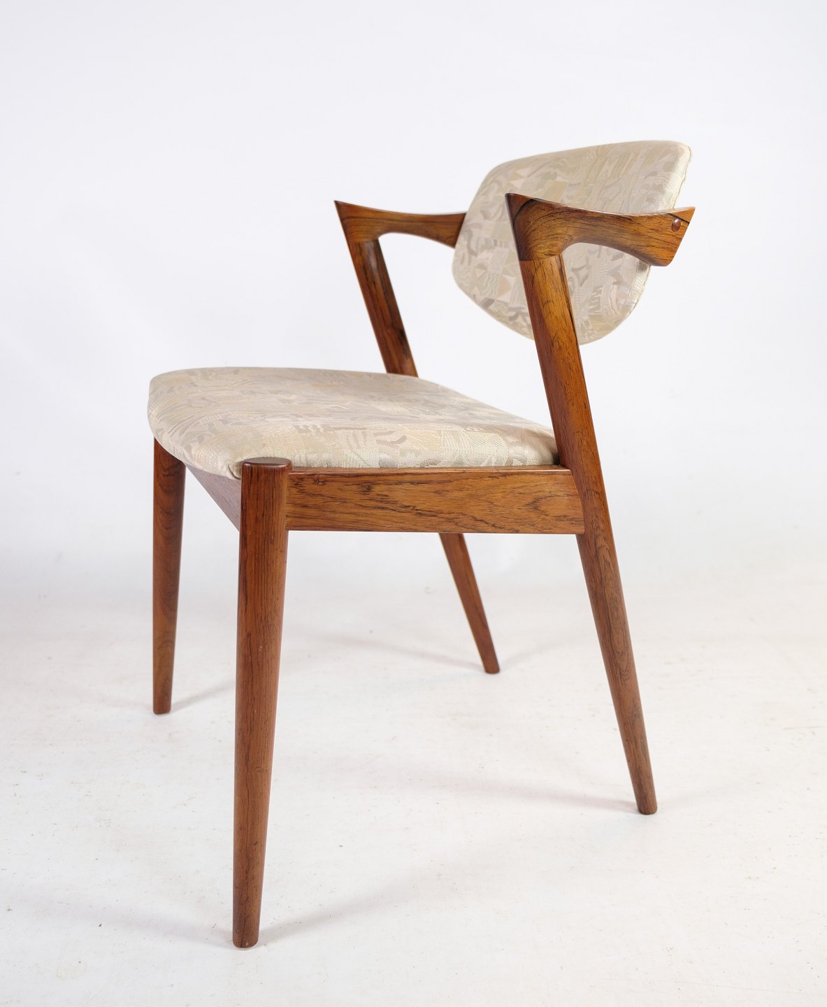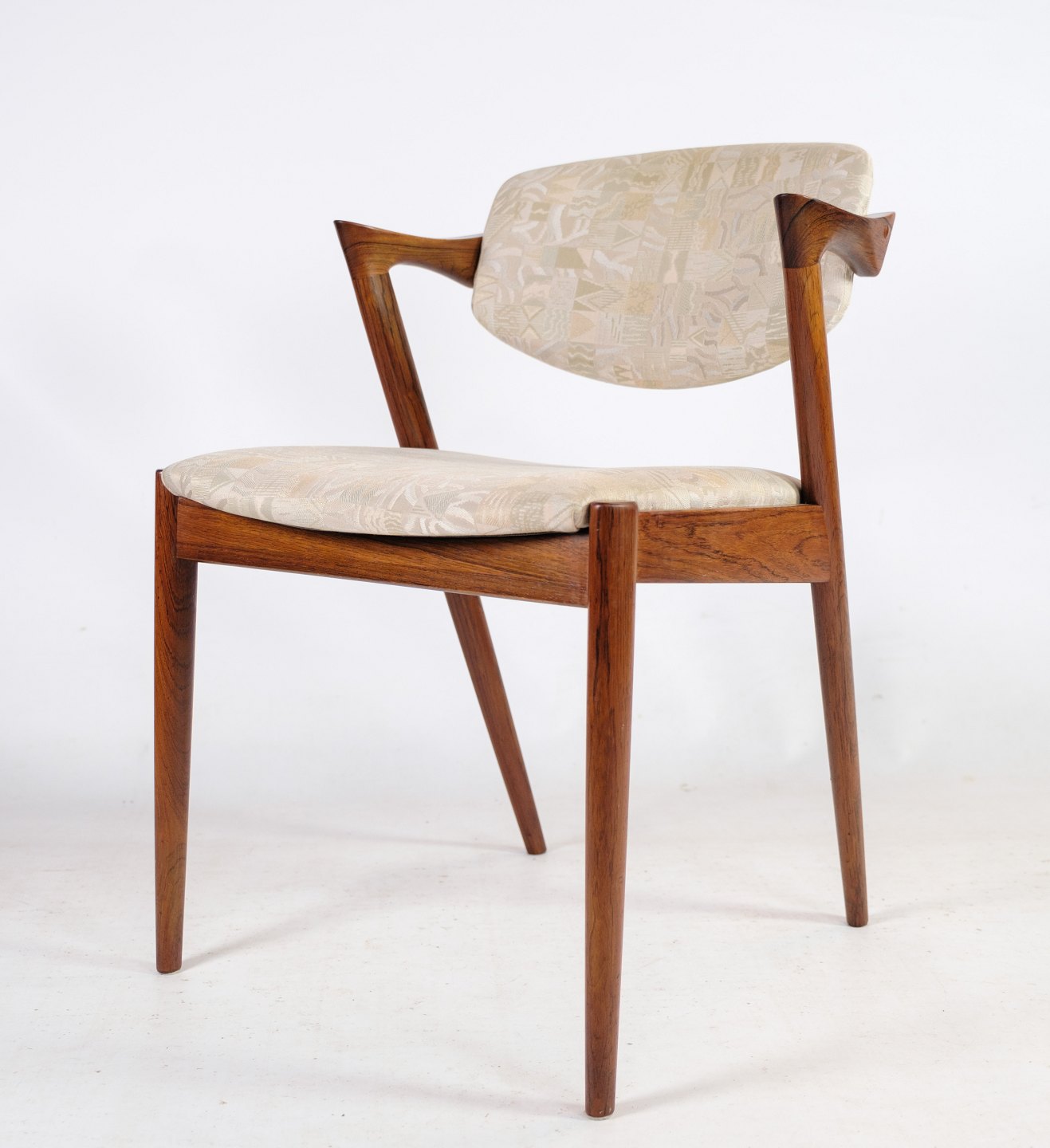 Sæt af 6 spisestuestole, model 42, designet af Kai Kristiansen i palisander fra omkring 1960'erne. Stolen har et helt unikt design med de korte armlæn, samt den flotte ryg. Stolen er polstret i lyst stof med smukt mønster.