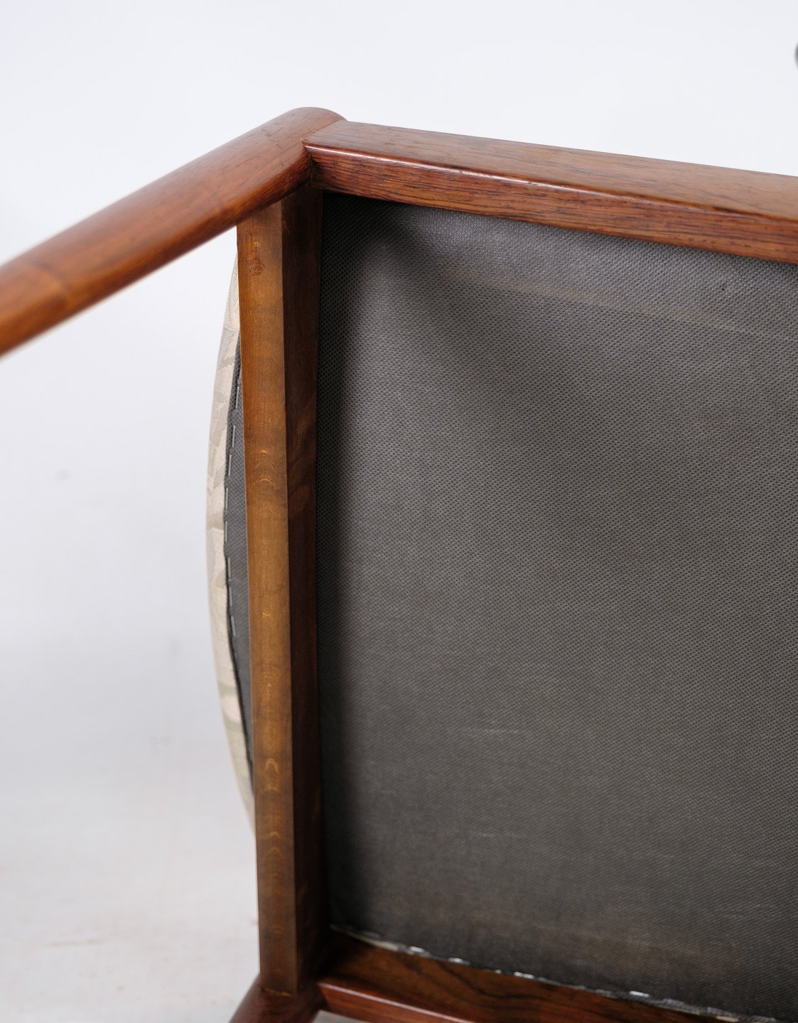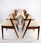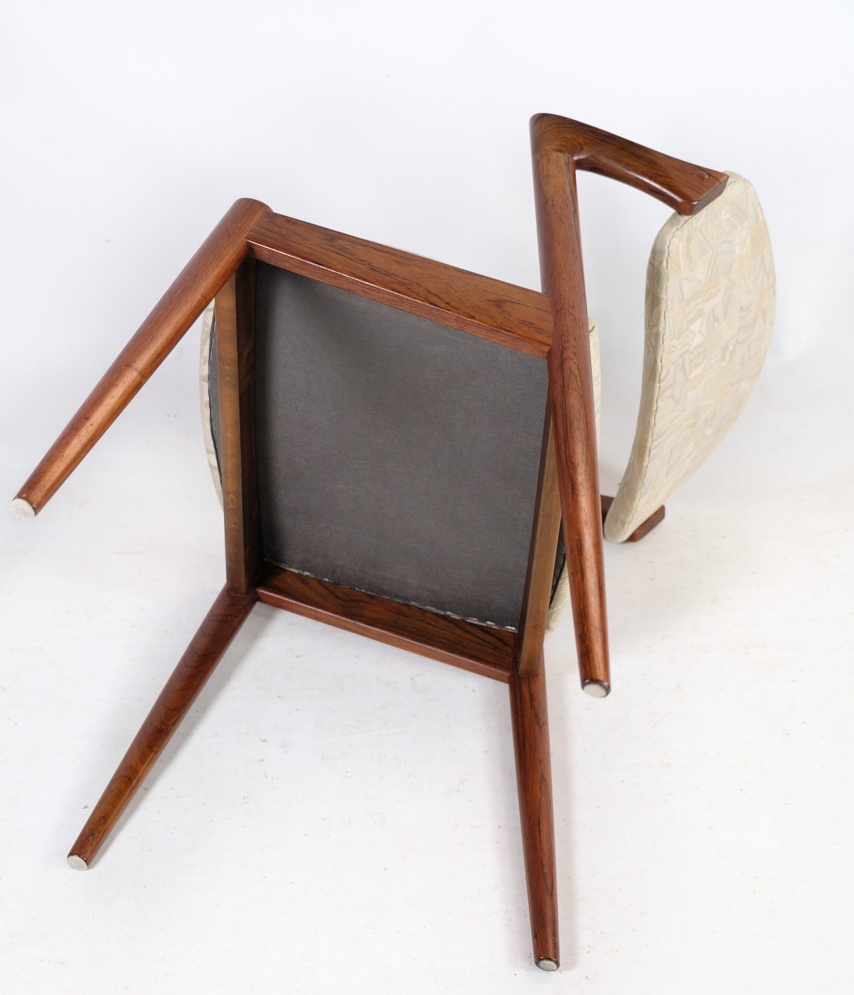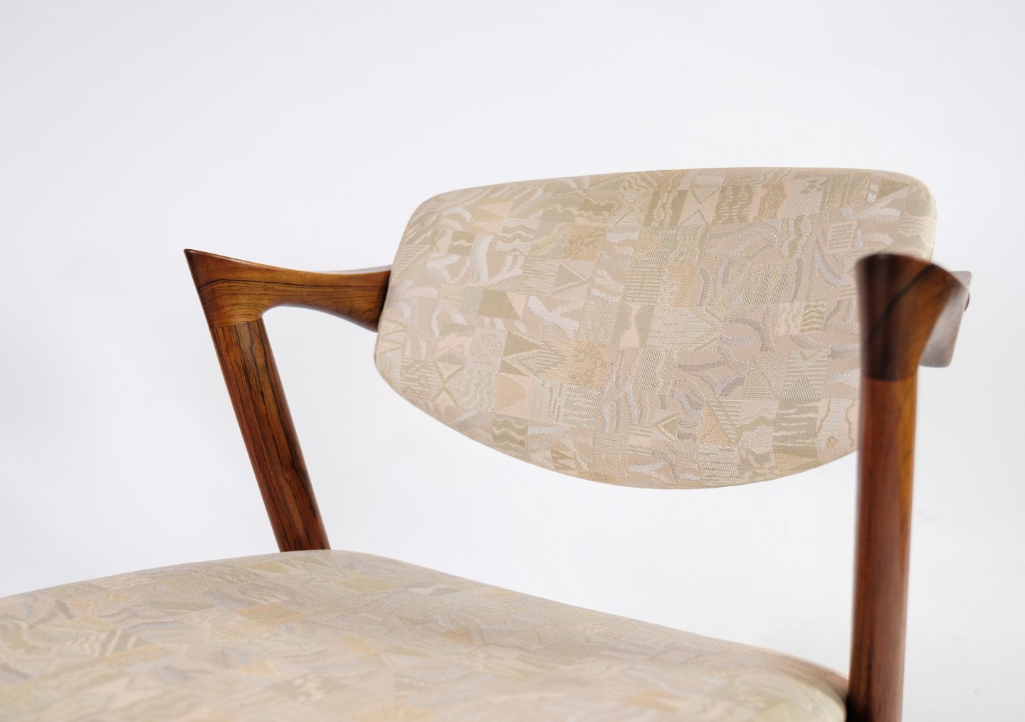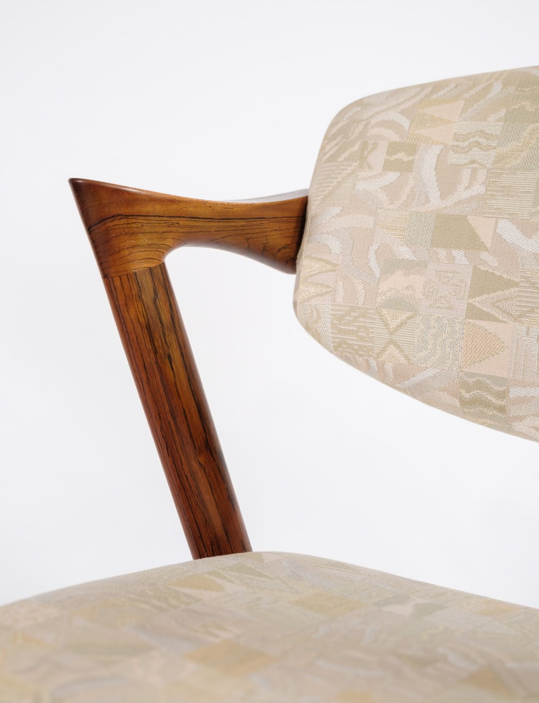 Sæt af 6 spisestuestole, model 42, designet af Kai Kristiansen i palisander fra omkring 1960'erne. Stolen har et helt unikt design med de korte armlæn, samt den flotte ryg. Stolen er polstret i lyst stof med smukt mønster.