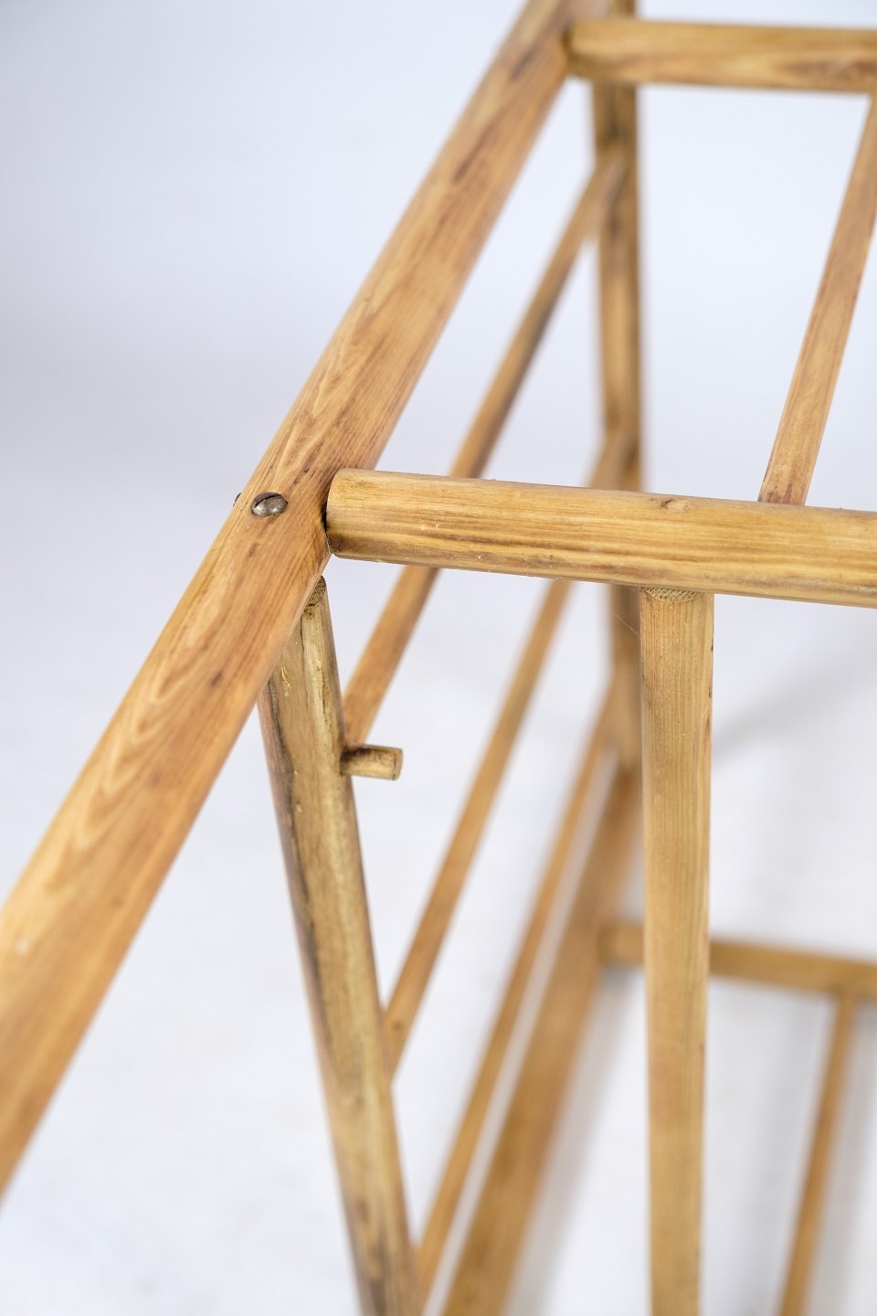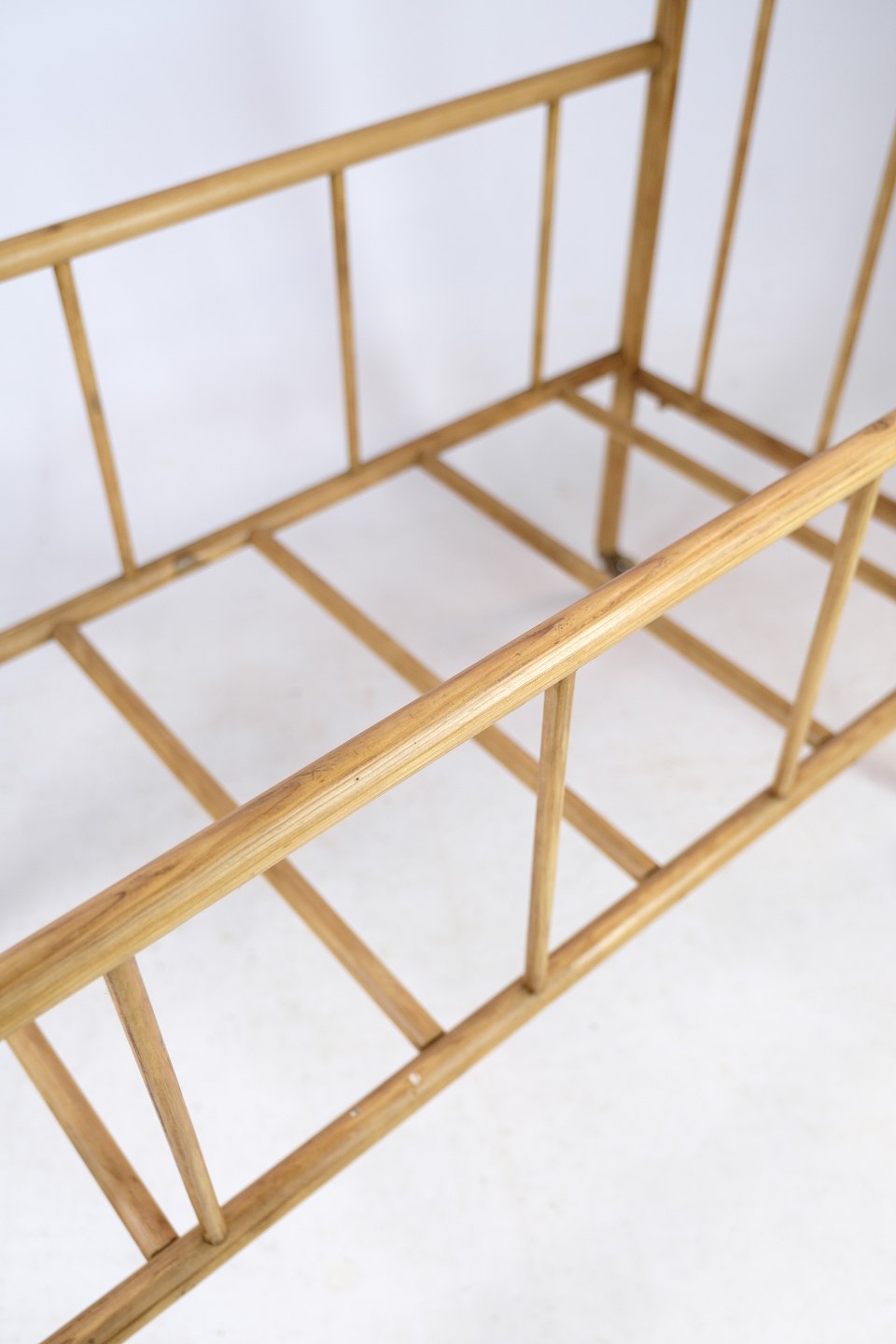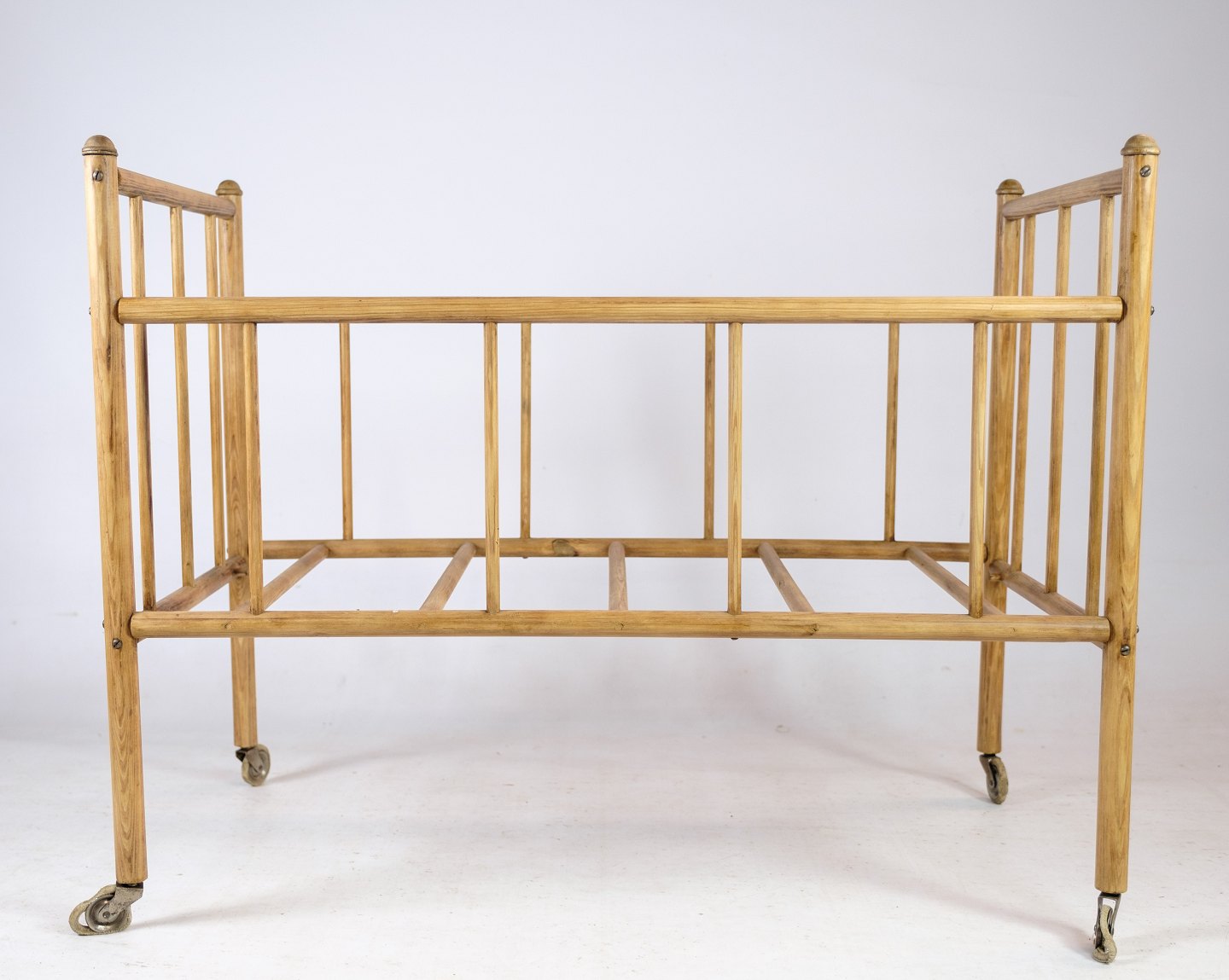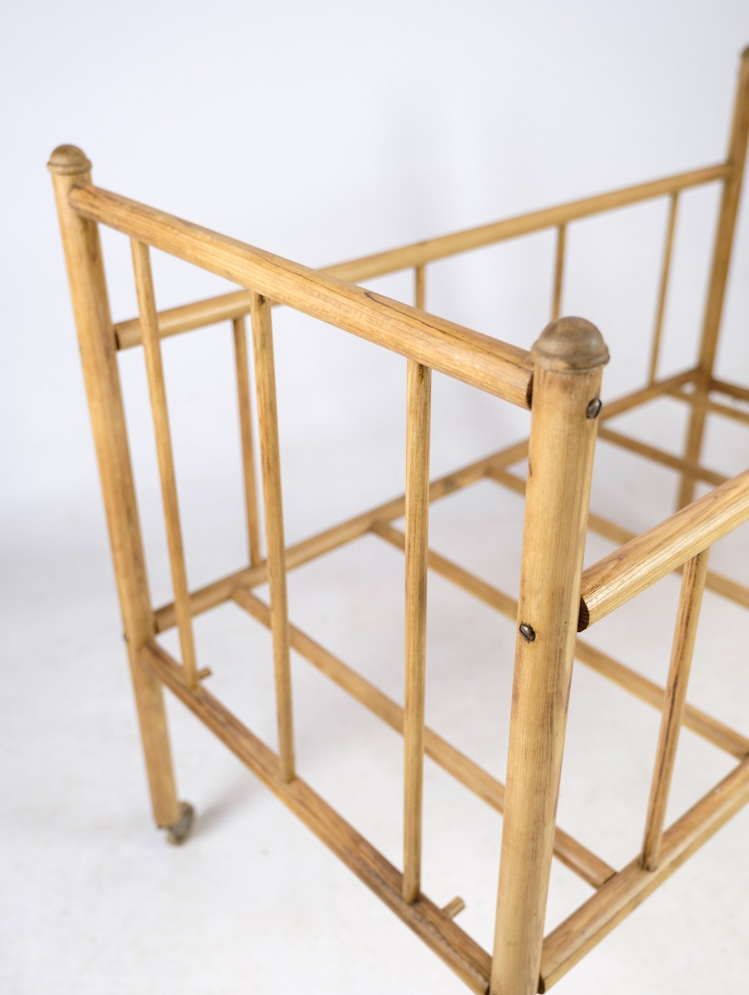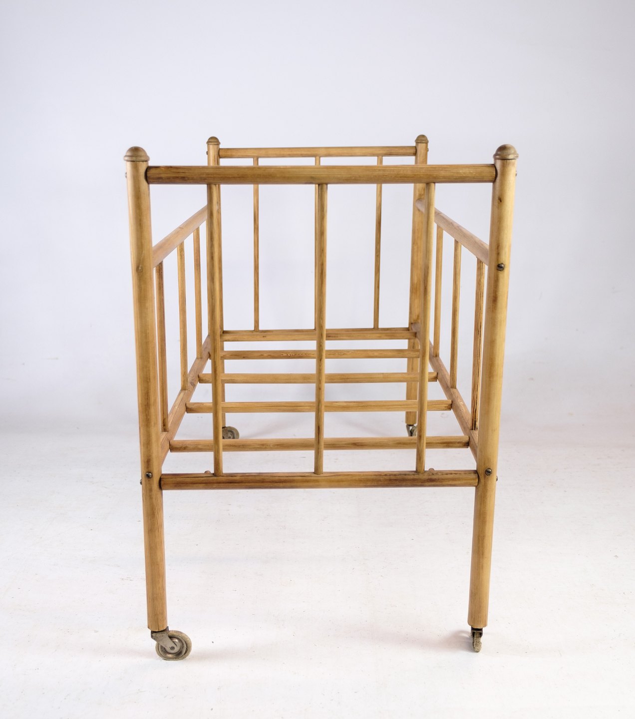 Antik barneseng i lyst fyrretræ med hjul fra omkring år 1920'erne.