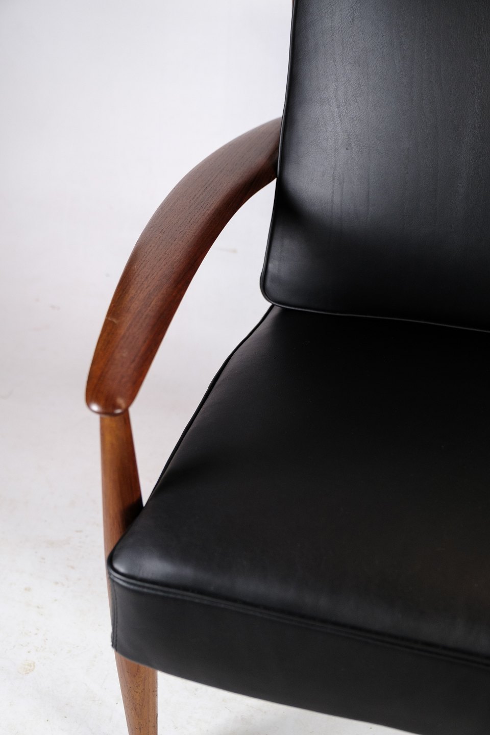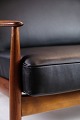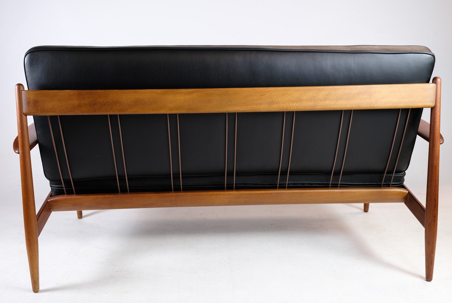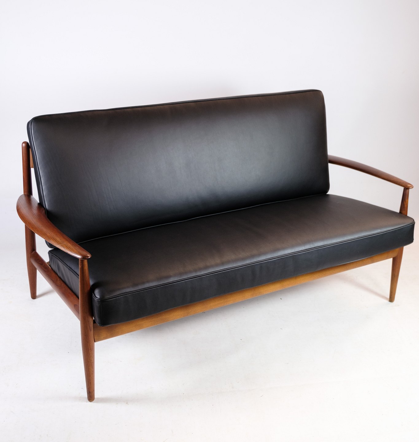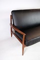 Denne 2-personers sofa fra omkring 1960'erne er en sjælden skønhed designet af Grete Jalk og fremstillet af France & Søn i Danmark. Den er udført i smukt teaktræ og har nybetrukkede hynder i elegant læder af den fineste kvalitet. Teakstellet på sofaen er blevet istandsat, så den står i fremragende stand og er klar til at pryde dit hjem.