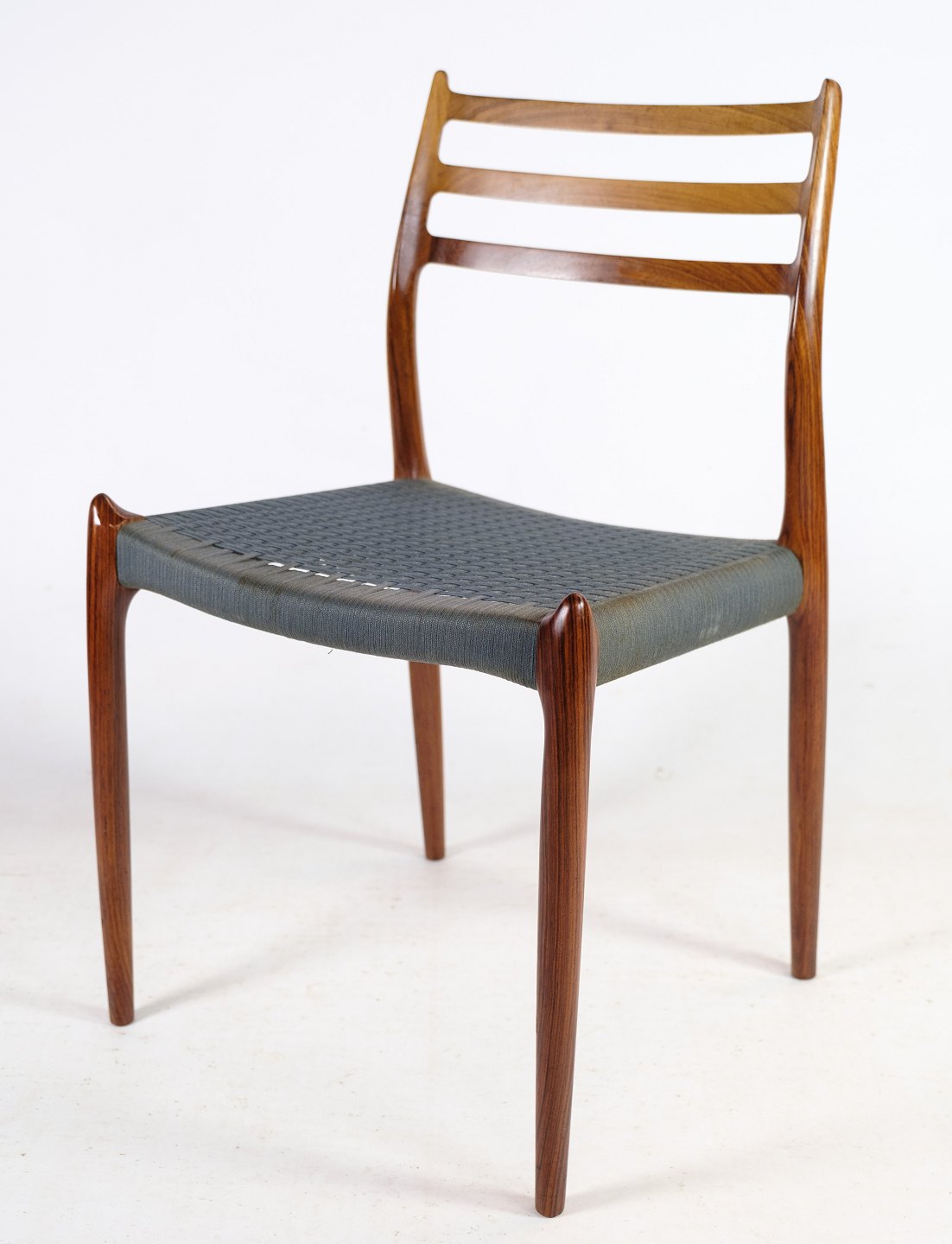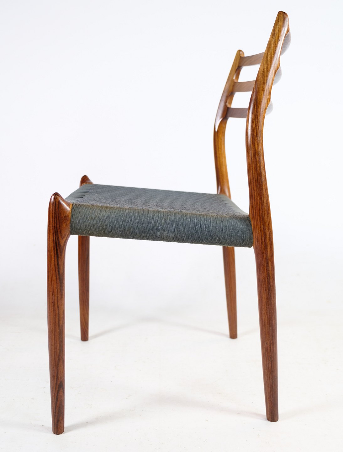 Set of 8 dining room chairs, model NO 78, designed by N.O Møller and manufactured by J. L. Møller Møbelfabrik from around the 1960s. The chairs are in rosewood with blue wicker. In our own workshop we can braid the chairs or cover with leather for an extra price. Write an email to us and we will find out together. Info@osted-antik.dk