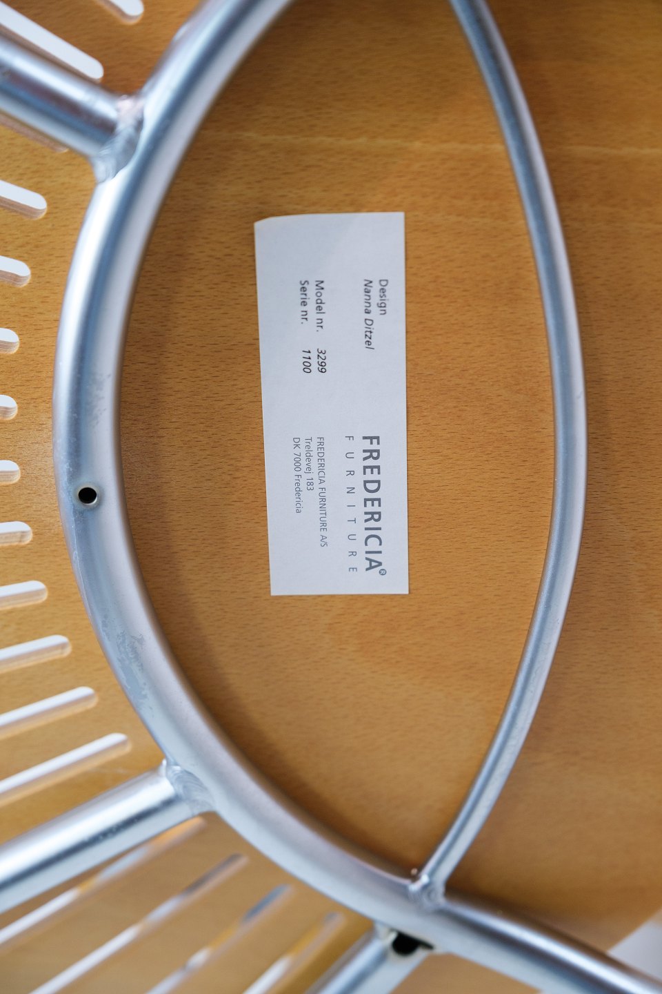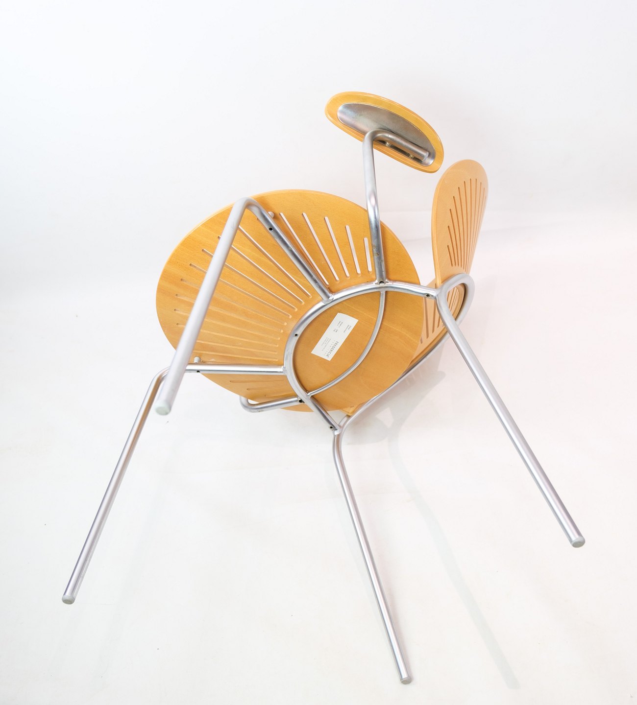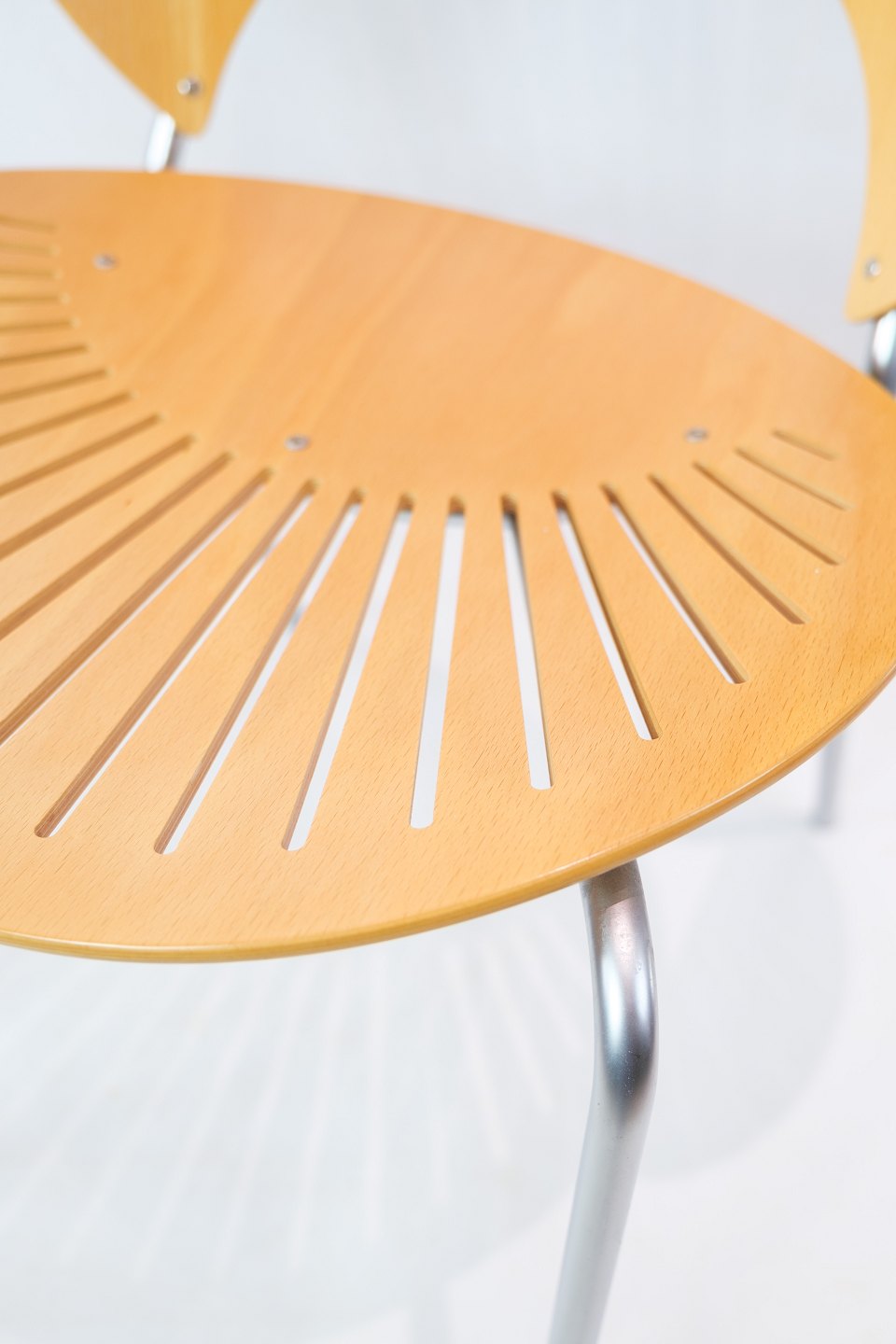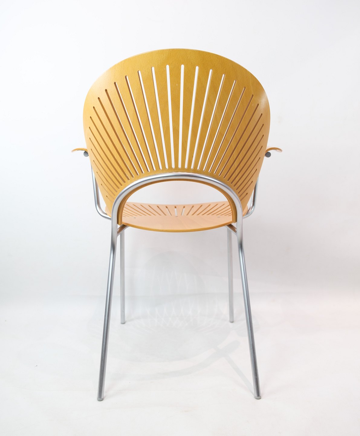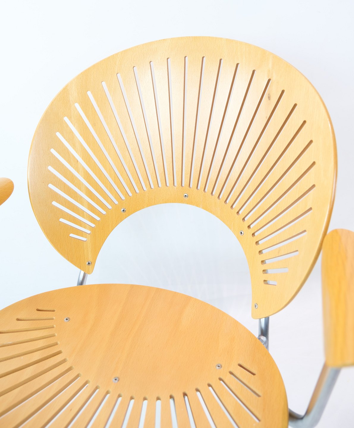 SolgtTrinidad Armstol, model 3297, designet af Nanna Ditzel (1923 - 2005) med skaller af bøgetræ med stel af forkromet stål fremstillet hos Fredercia Furniture.
