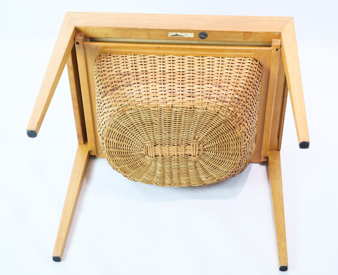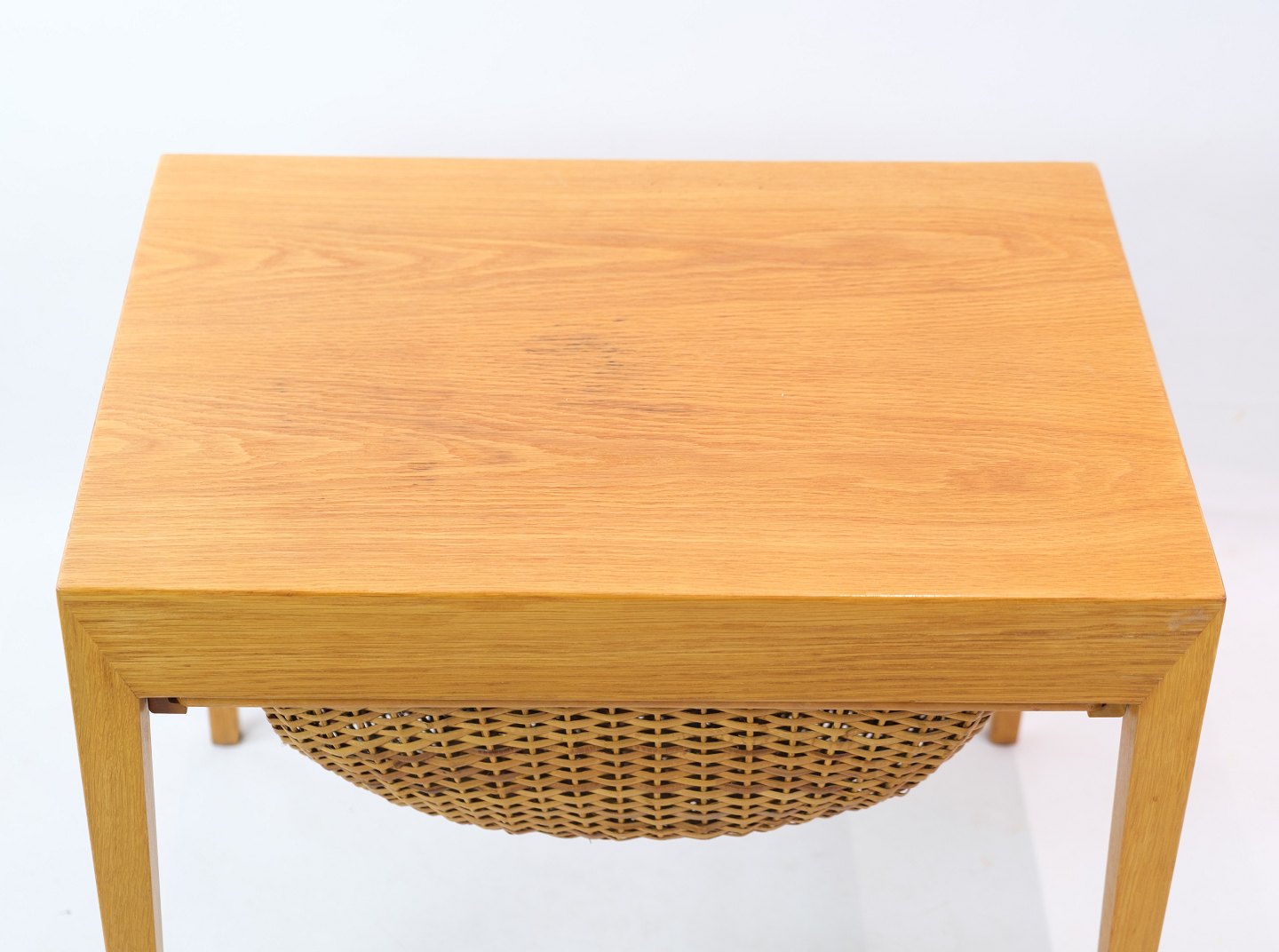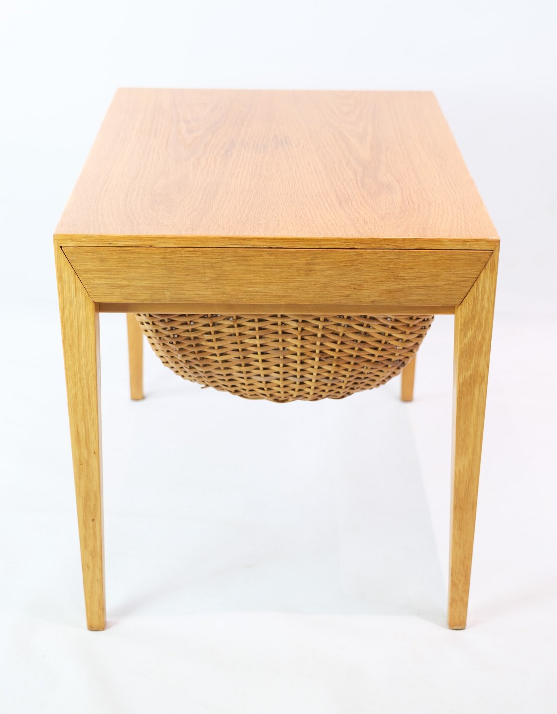 SolgtSybord / sidebord, designet af Severin Hansen i egetræ fremstillet af Haslev møbelfabrik fra 1957. Bordet har en skuffe med små rum, samt en udtrækskurv med flet.