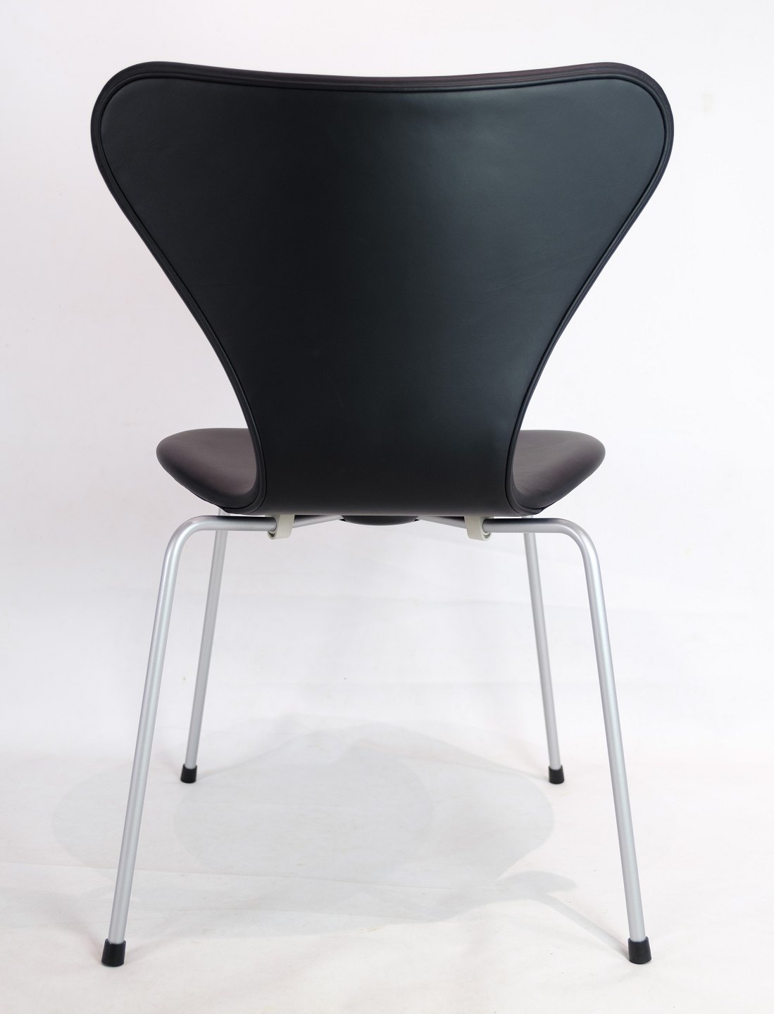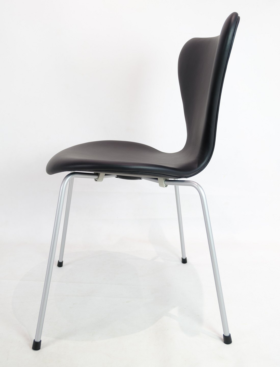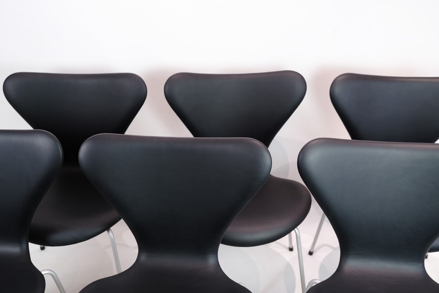 Et sæt af 6 Syver stole, model 3107, designet af Arne Jacobsen i 1967 og fremstillet af Fritz Hansen. Stolene er ny polstret i sort elegance læder.