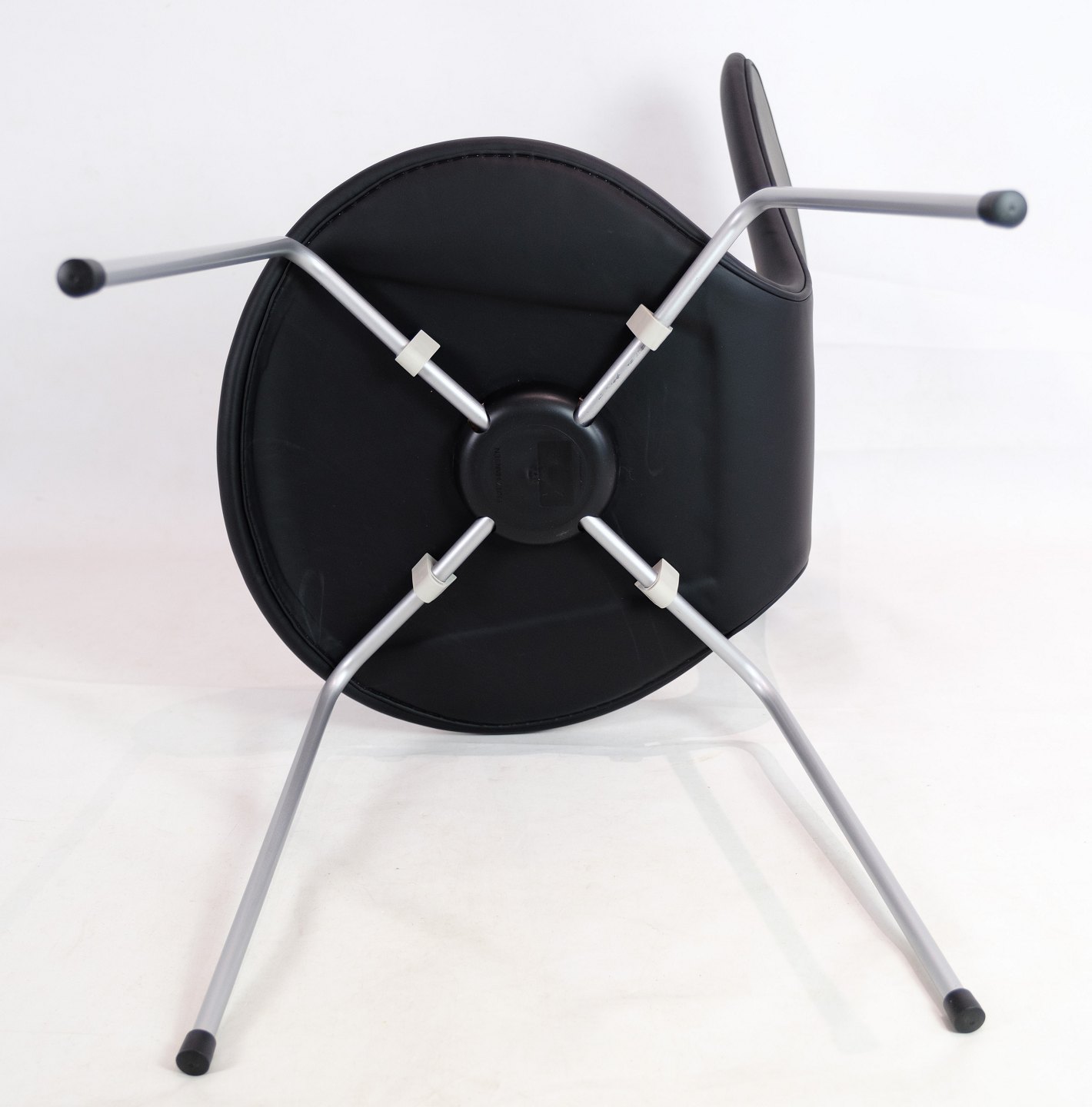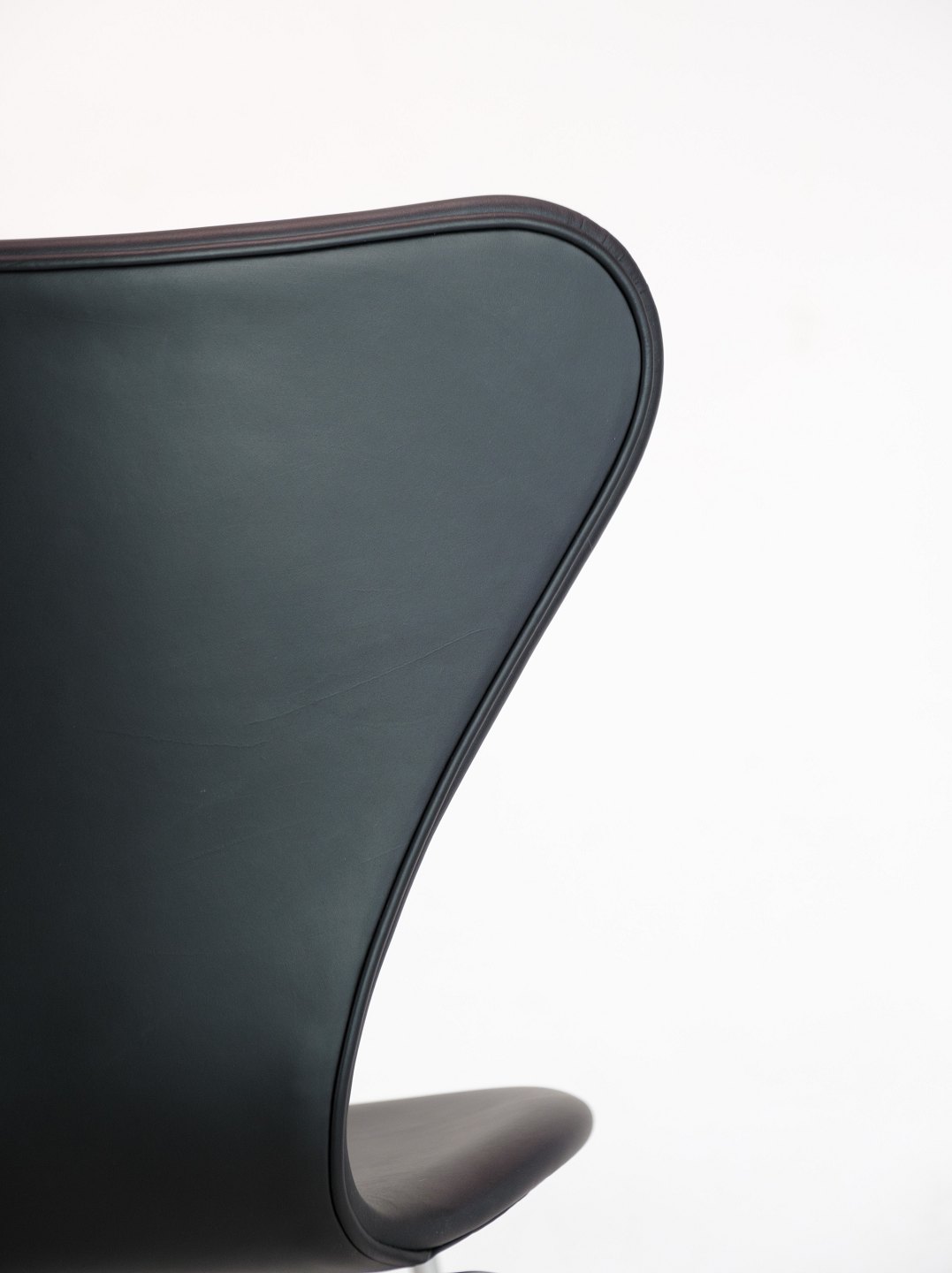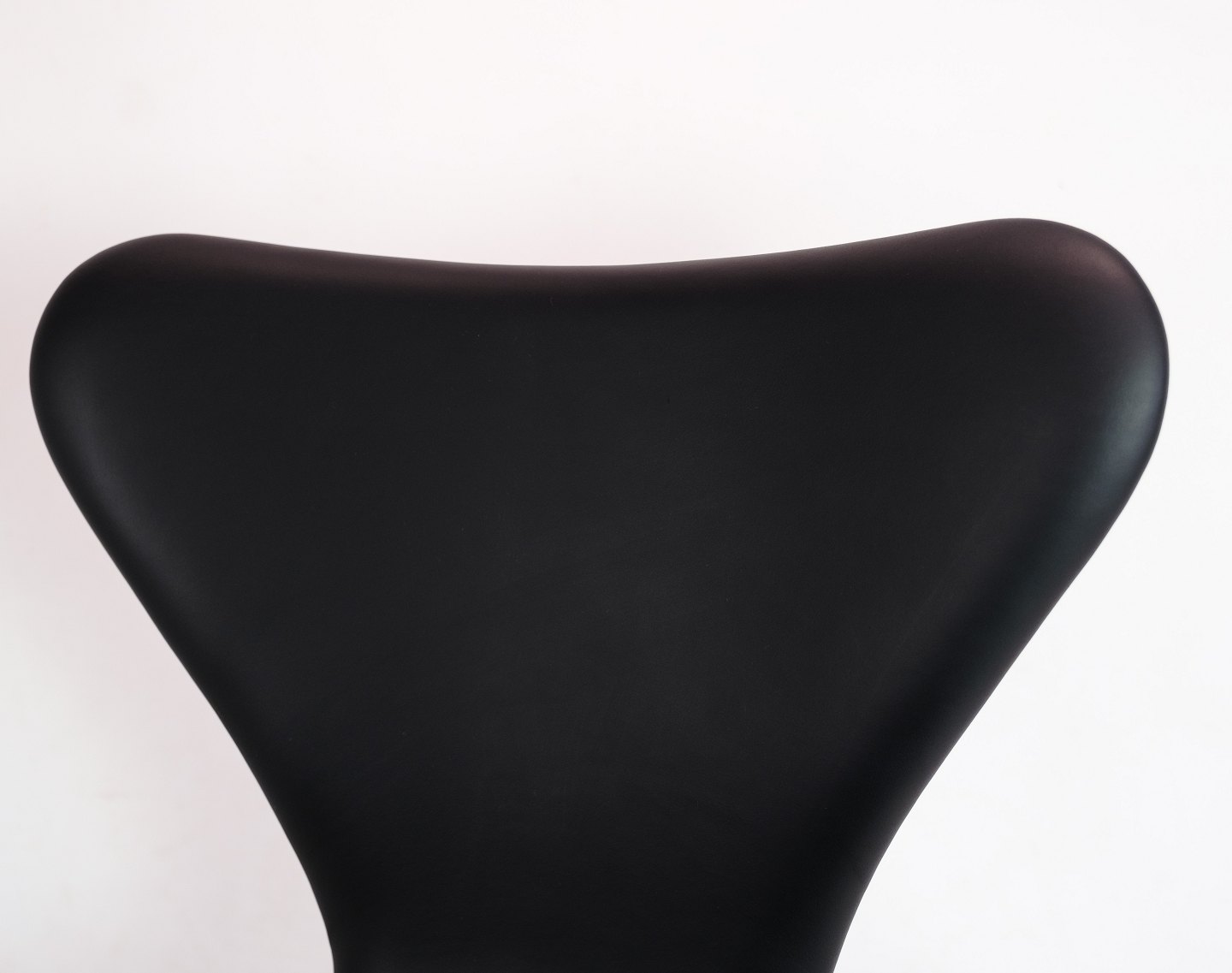 Et sæt af 6 Syver stole, model 3107, designet af Arne Jacobsen i 1967 og fremstillet af Fritz Hansen. Stolene er ny polstret i sort elegance læder.