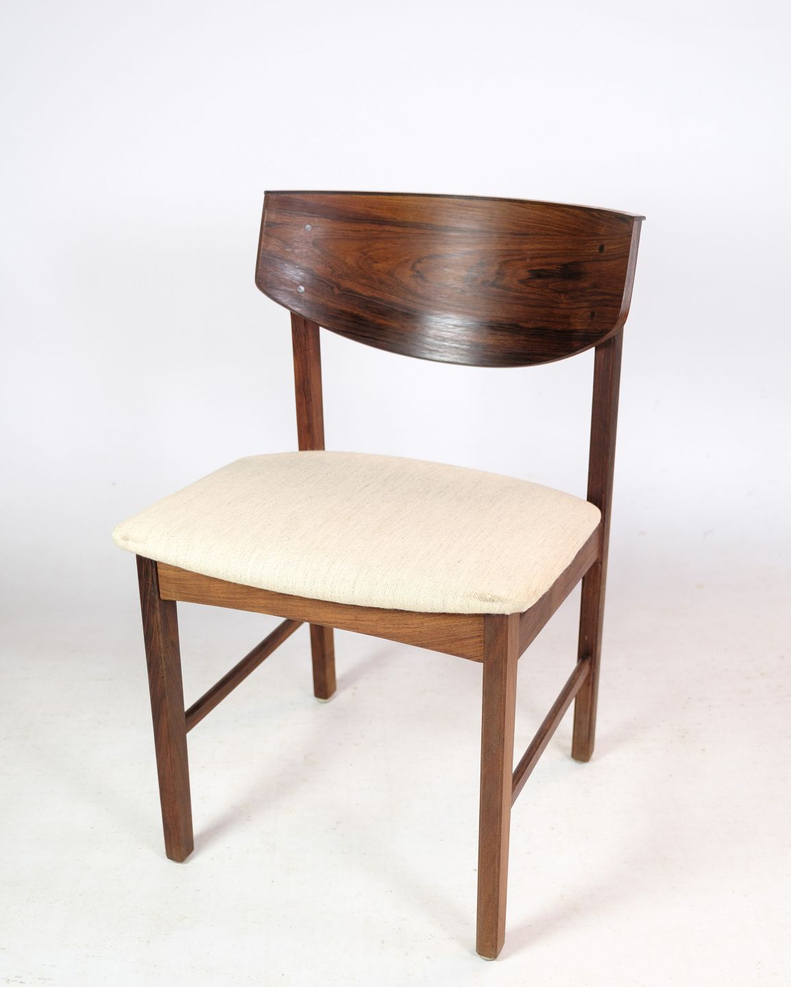 Set of six dining chairs in rosewood with light fabric of Danish design from around the 1960s.