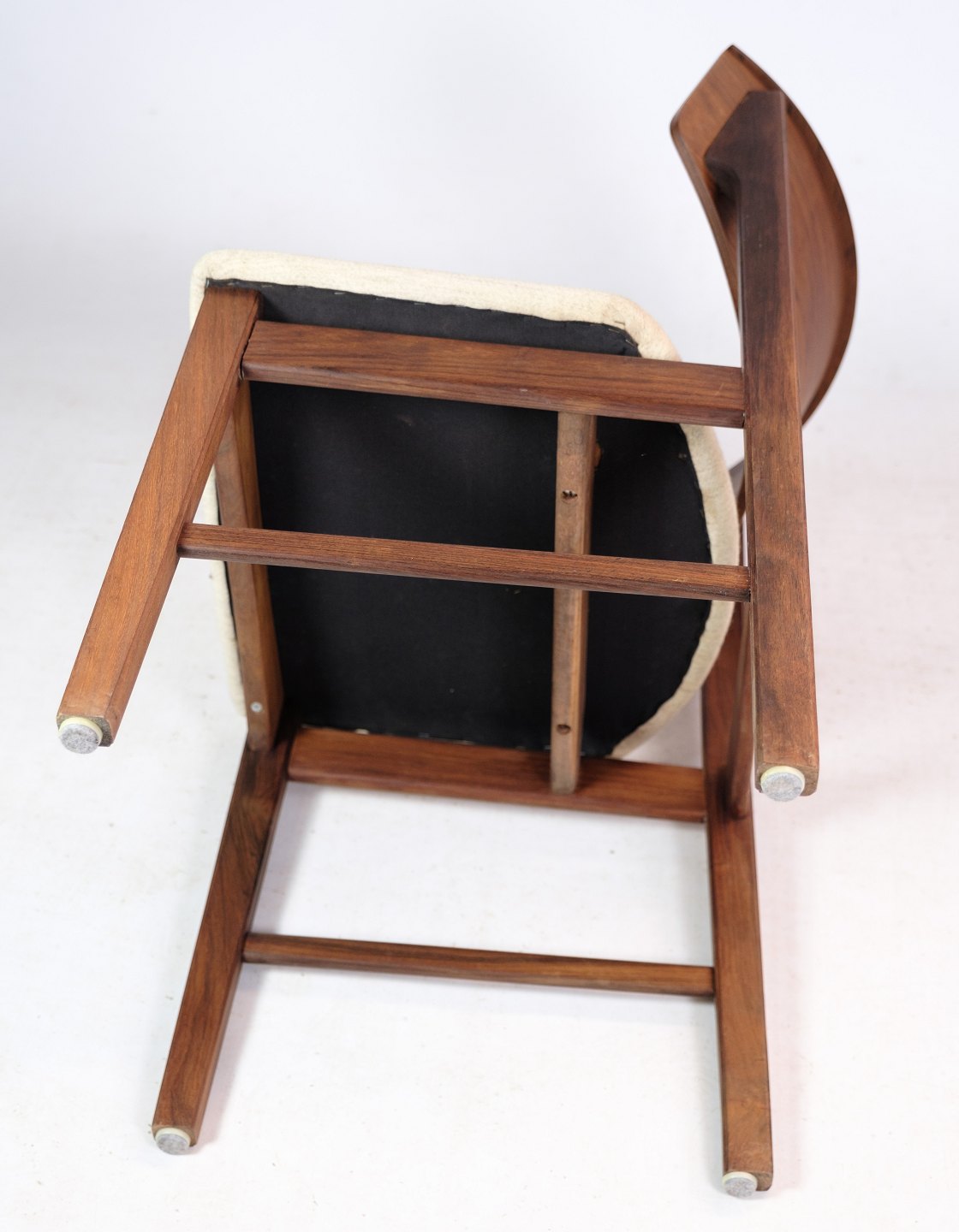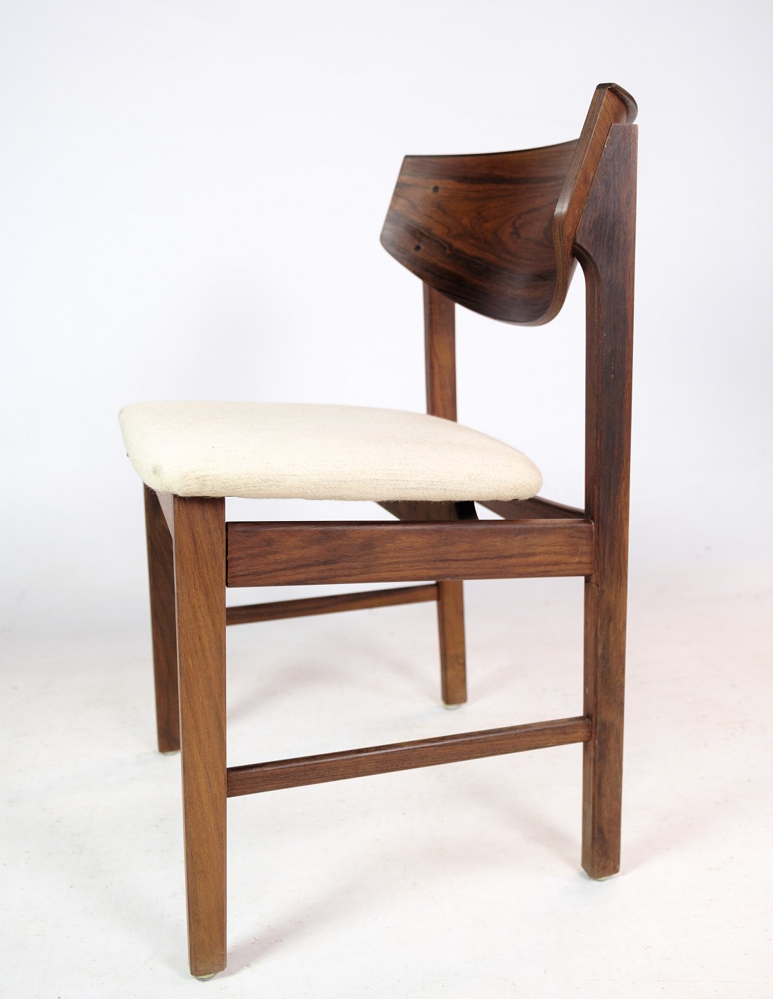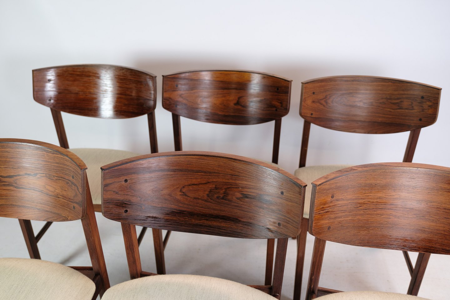 SoldSet of six dining chairs in rosewood with light fabric of Danish design from around the 1960s.