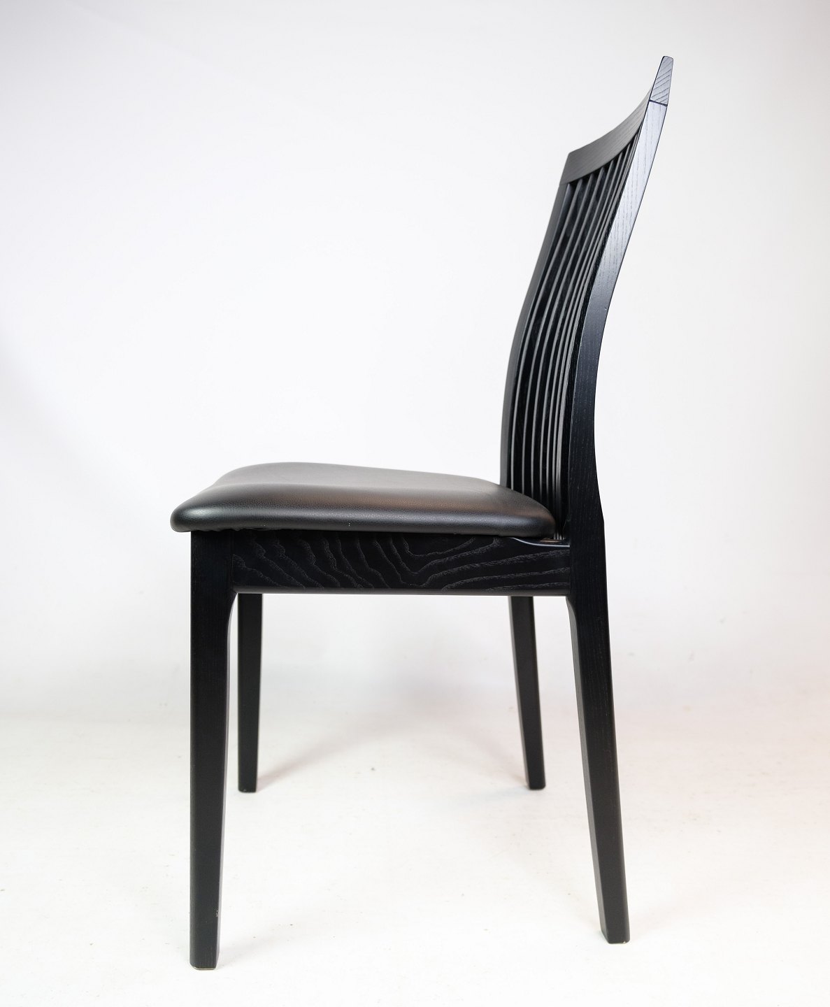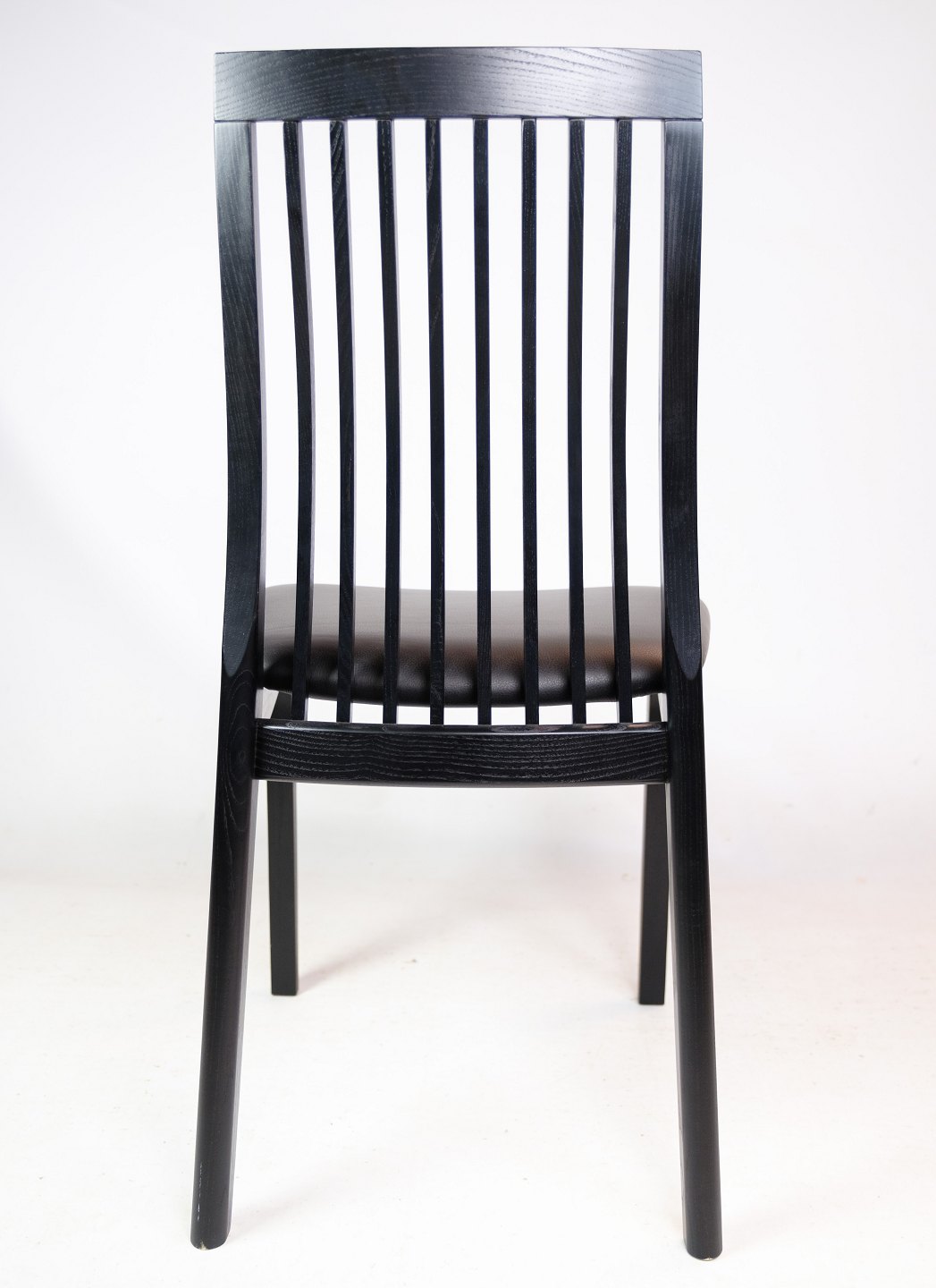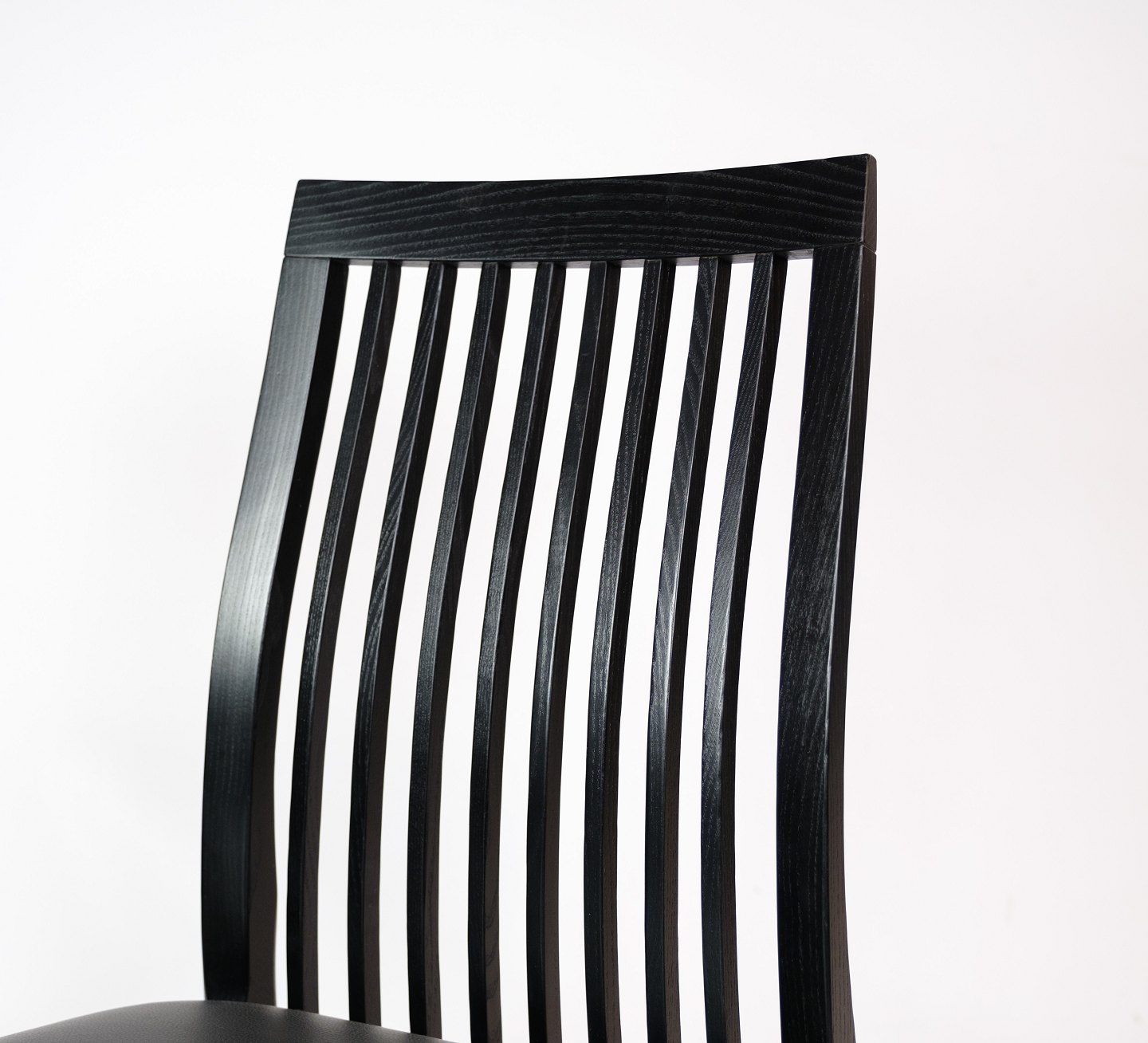 Sæt af 4 spisestuestole, model 712, i sort bejdset ask fremstillet af K. Høffer Larsen A/S. Mellemhøj spisestuestol, med lodrette pinde i ryggen, der giver god siddekomfort.
