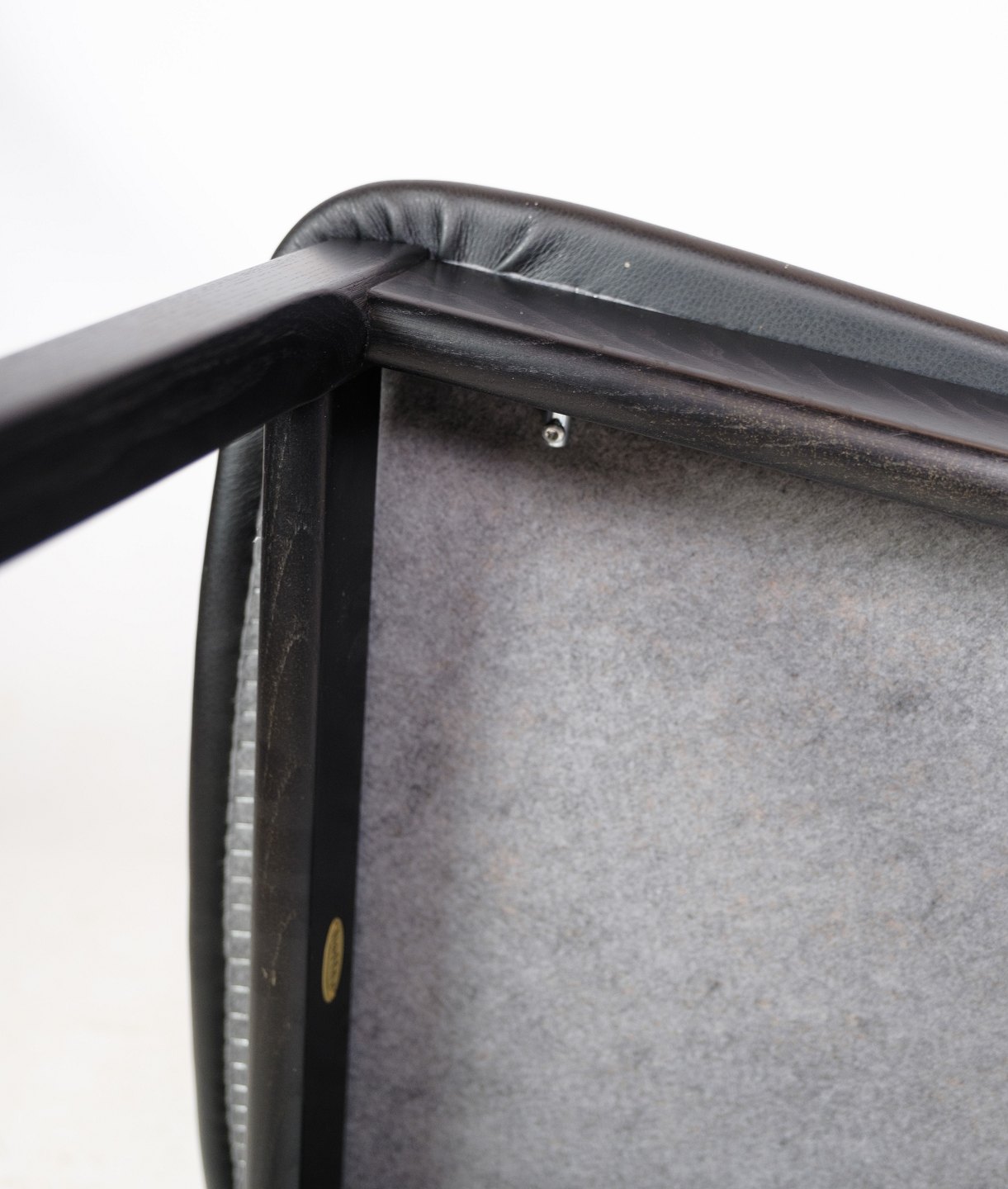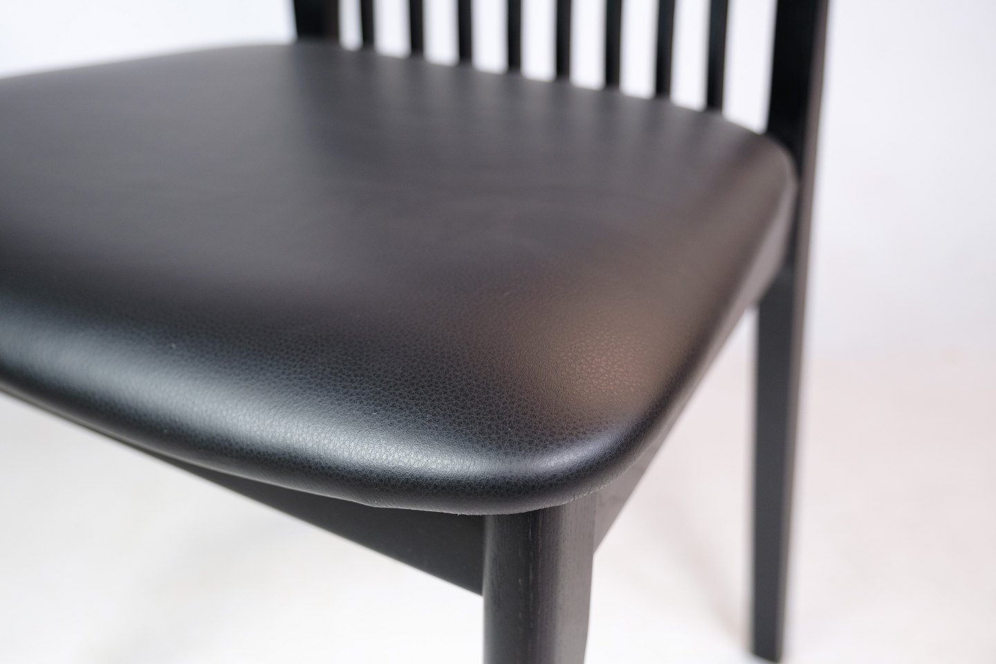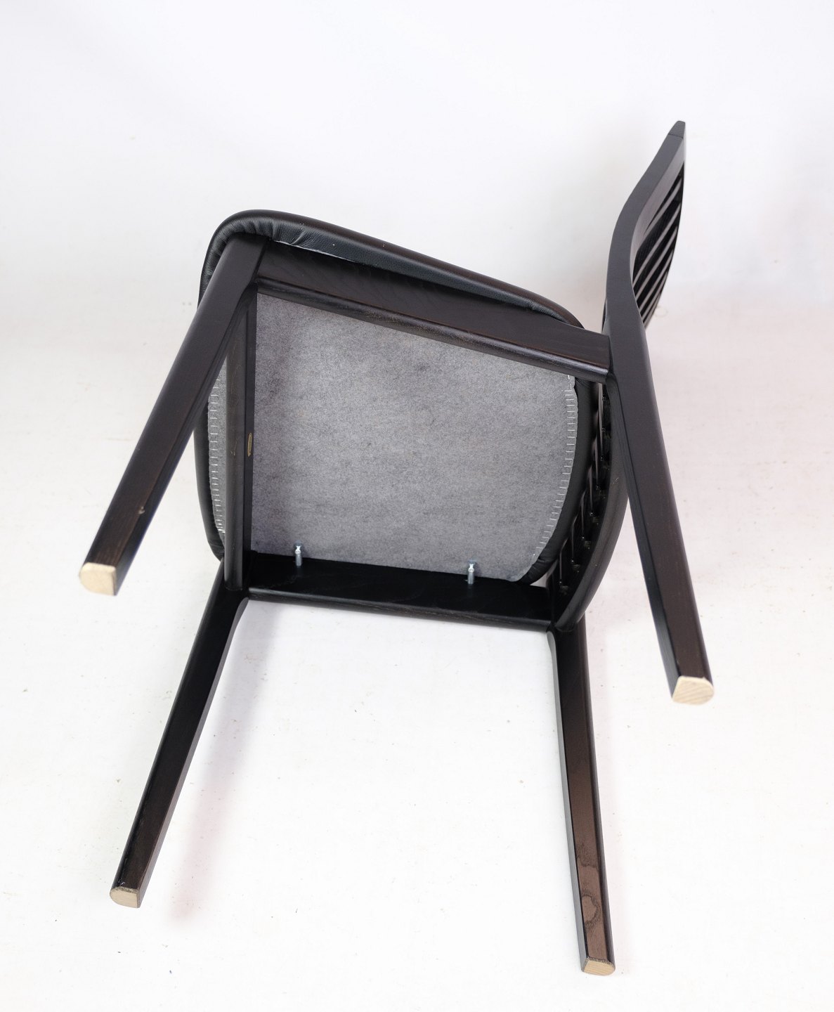 Sæt af 4 spisestuestole, model 712, i sort bejdset ask fremstillet af K. Høffer Larsen A/S. Mellemhøj spisestuestol, med lodrette pinde i ryggen, der giver god siddekomfort.
